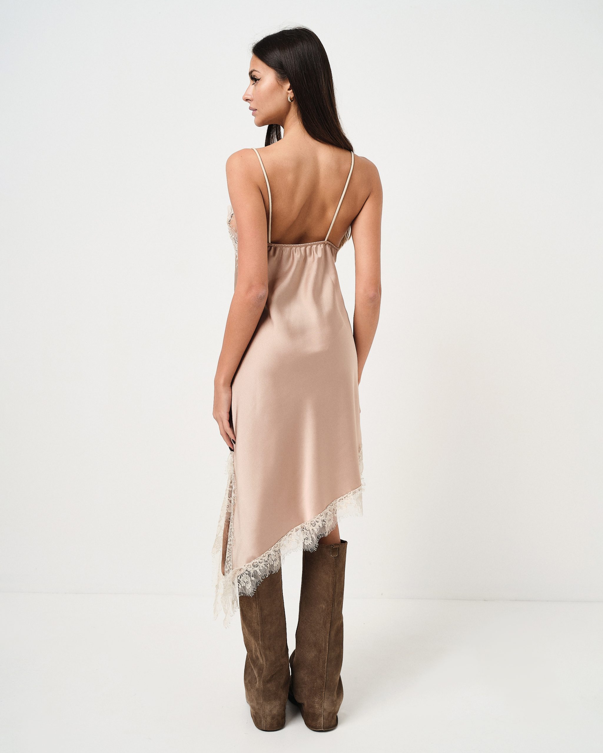 Abito midi in satin con spallina sottile e pizzo a contrasto.