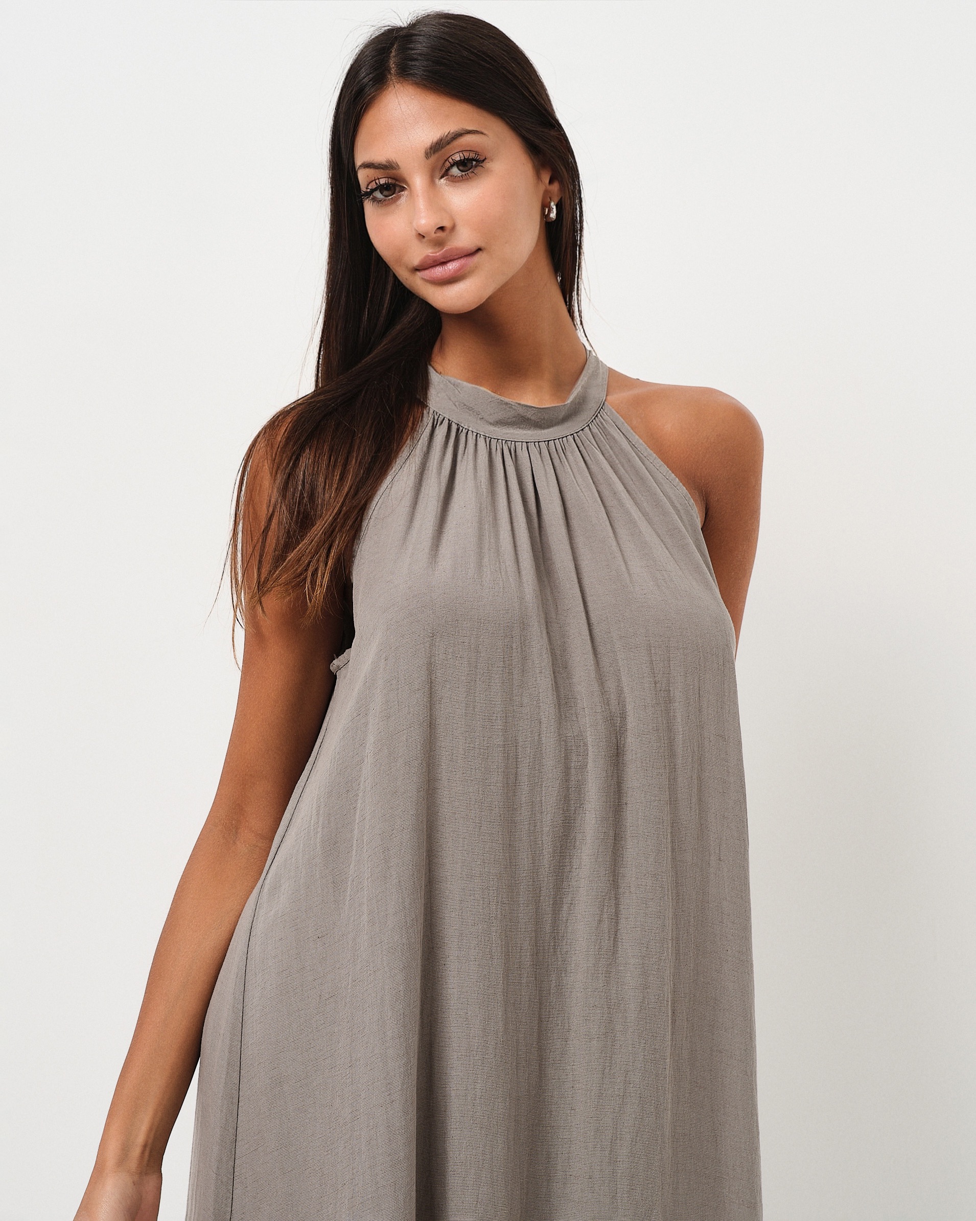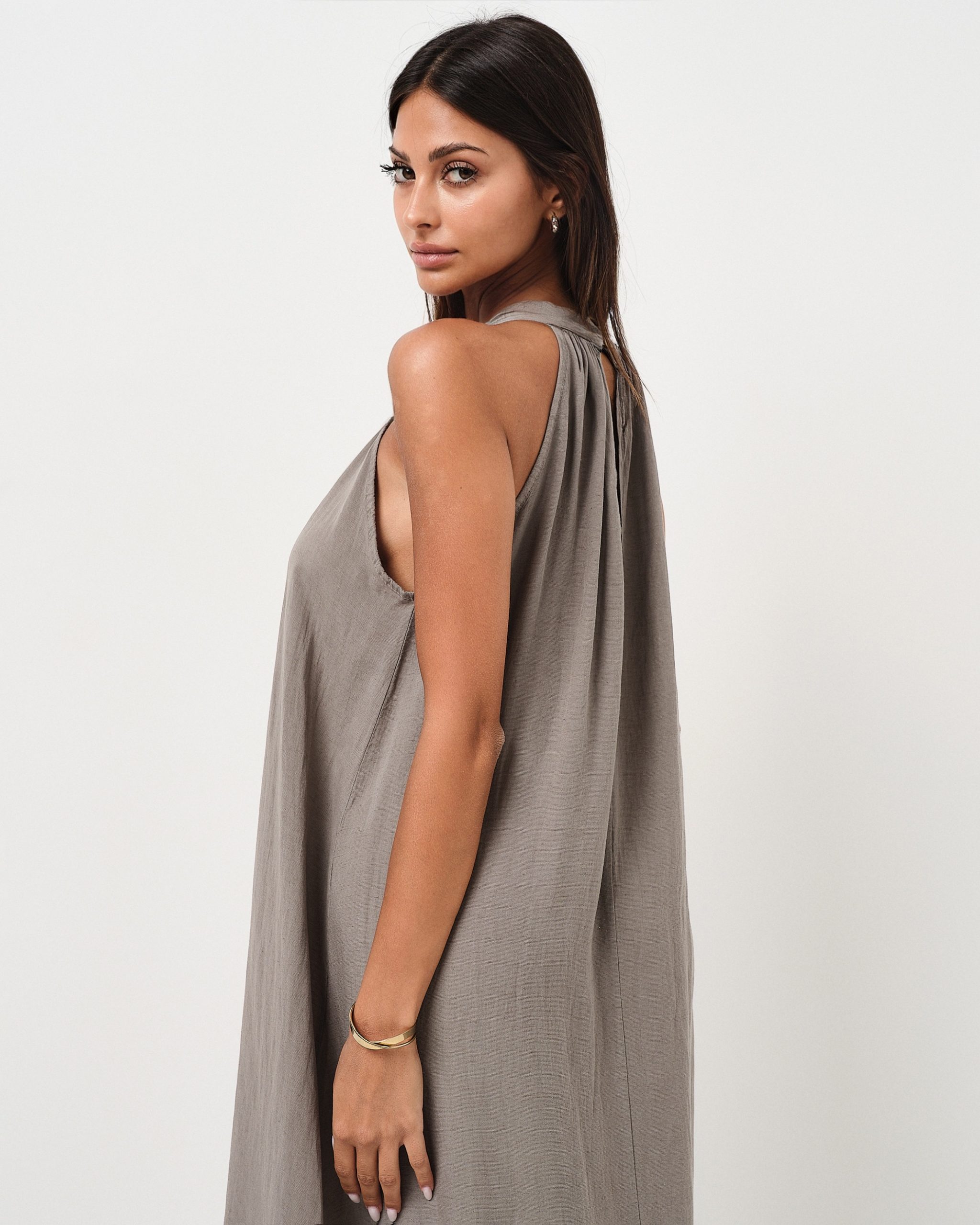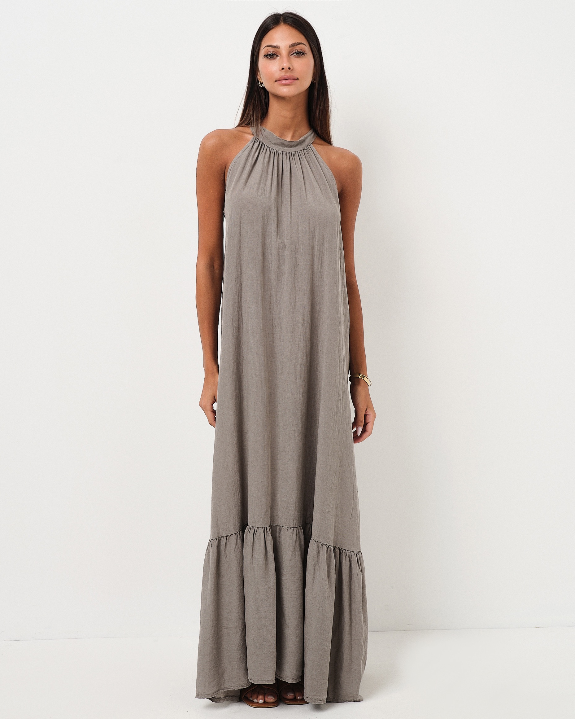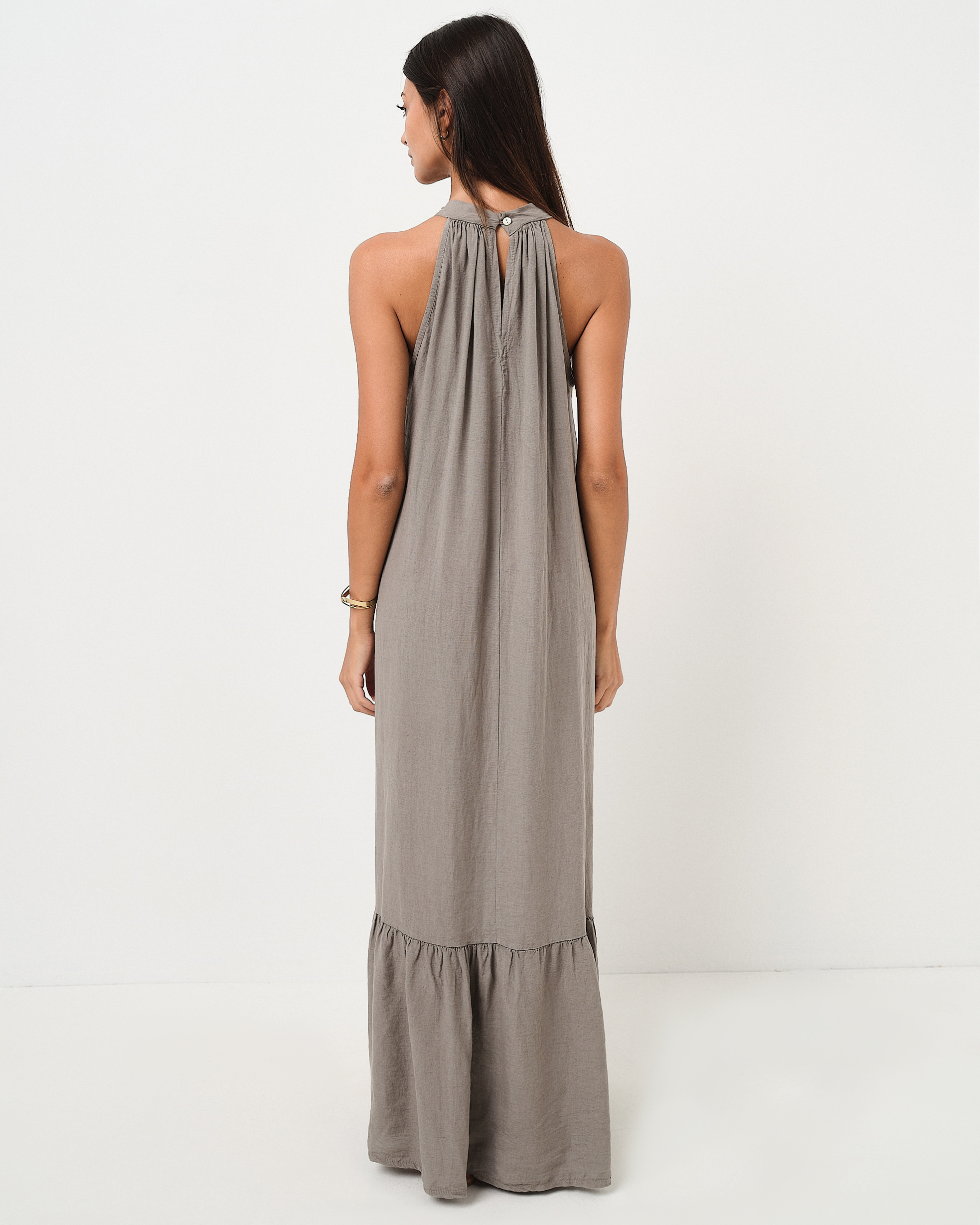 Abito lungo accollato in misto lino con balza sul fondo e bottone sul retro.