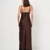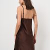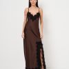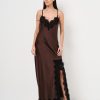 Abito lungo in satin di raso con spallina sottile e spacco profondo ricamato in pizzo.