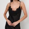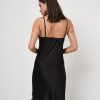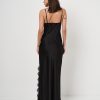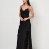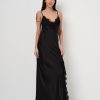 Abito lungo in satin di raso con spallina sottile e spacco profondo ricamato in pizzo.
