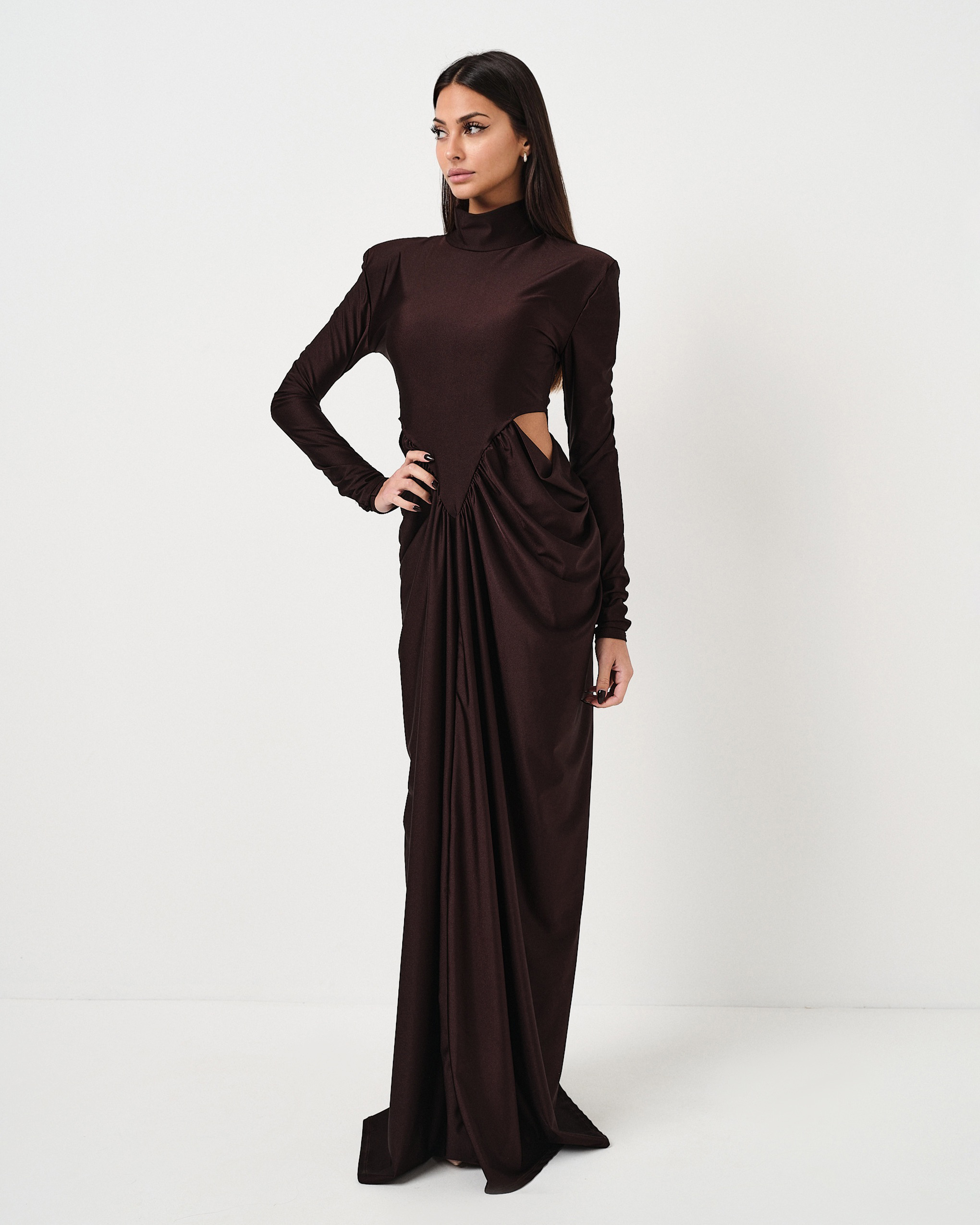 Abito lungo in lycra elasticizzata a manica lunga, con spalline imbottite, collo a lupetto e drappeggi.
