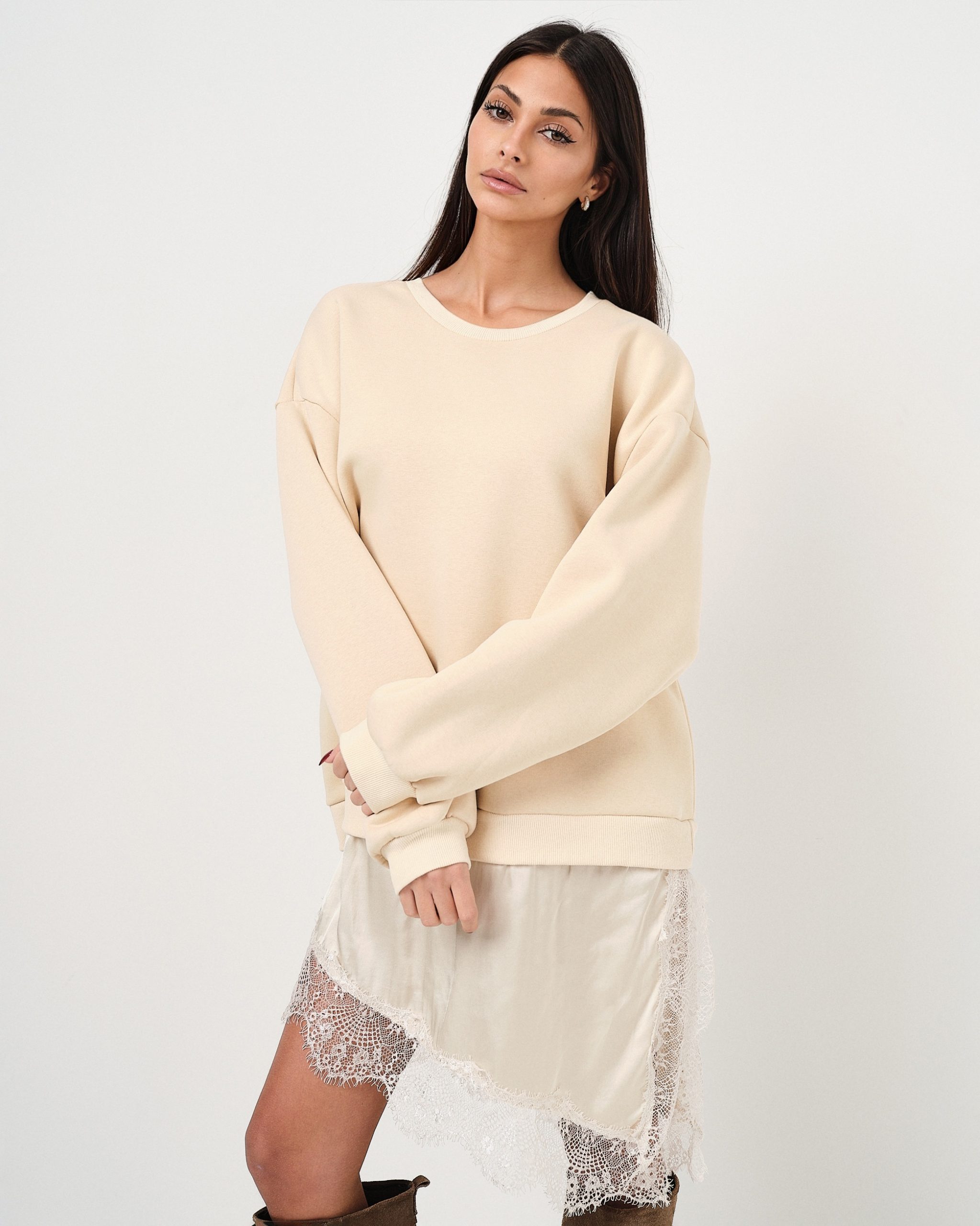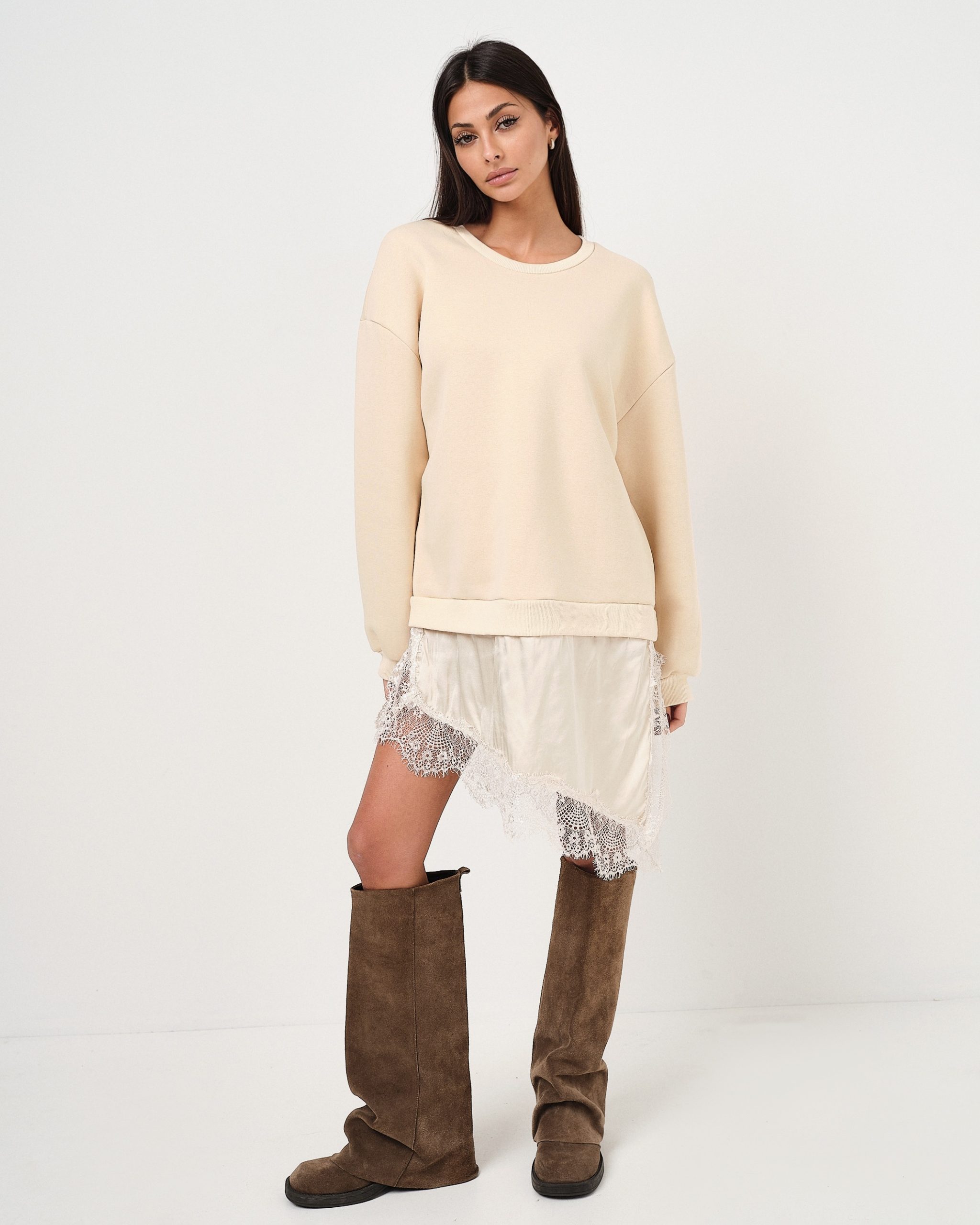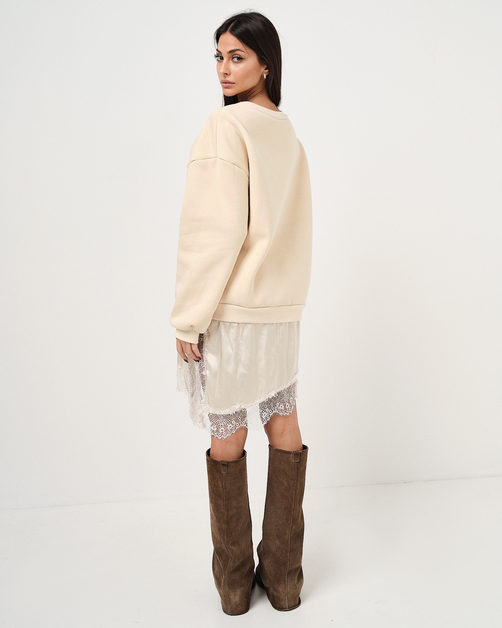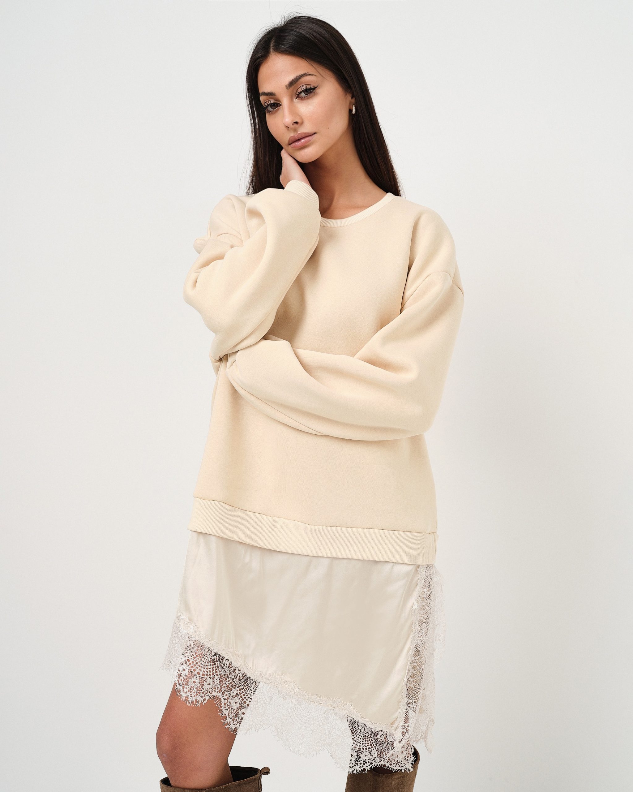 Abito composto da felpa e gonna in raso e pizzo asimmetrica.