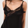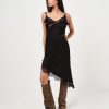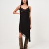 Abito asimmetrico in raso con scollatura e fondo in pizzo.