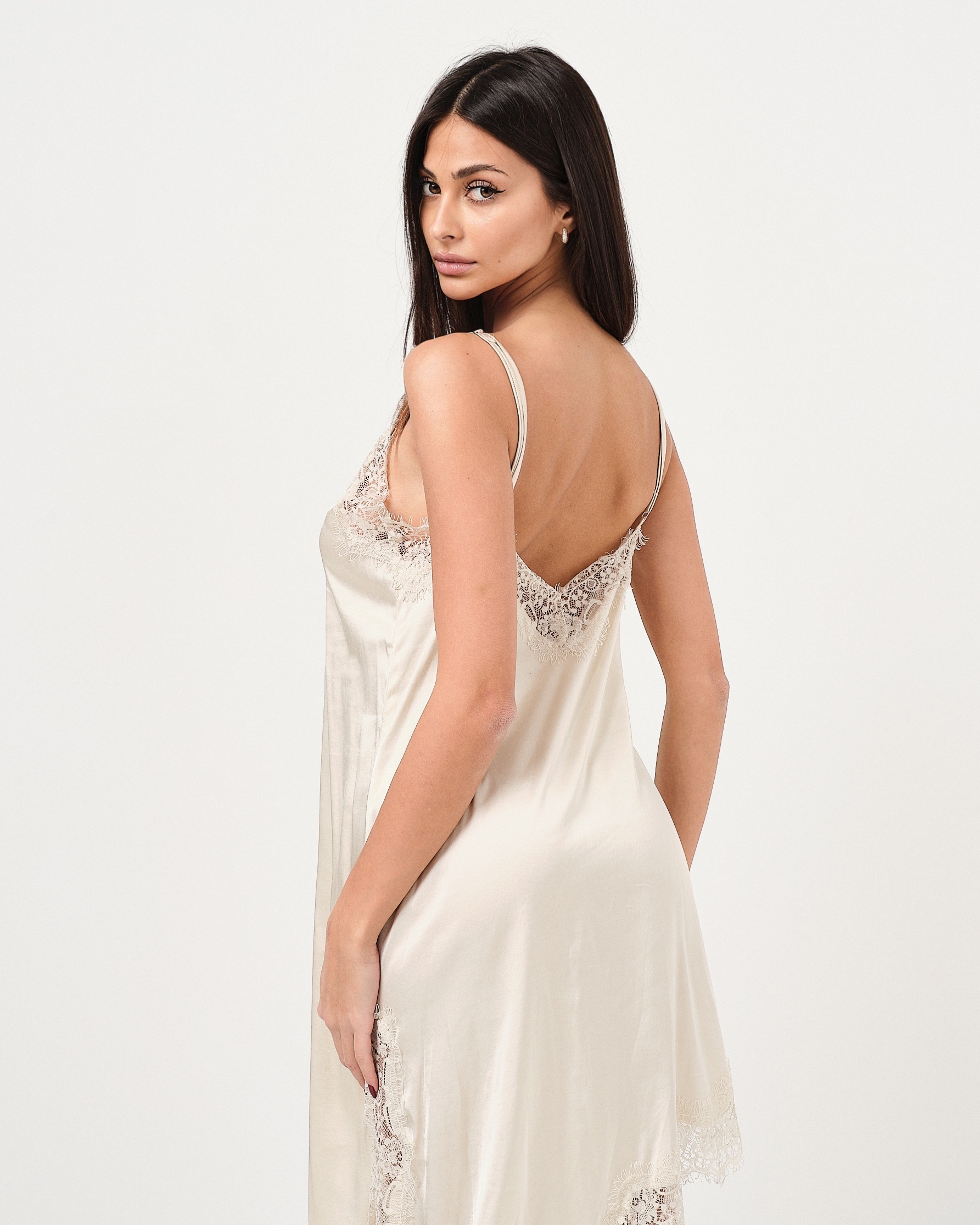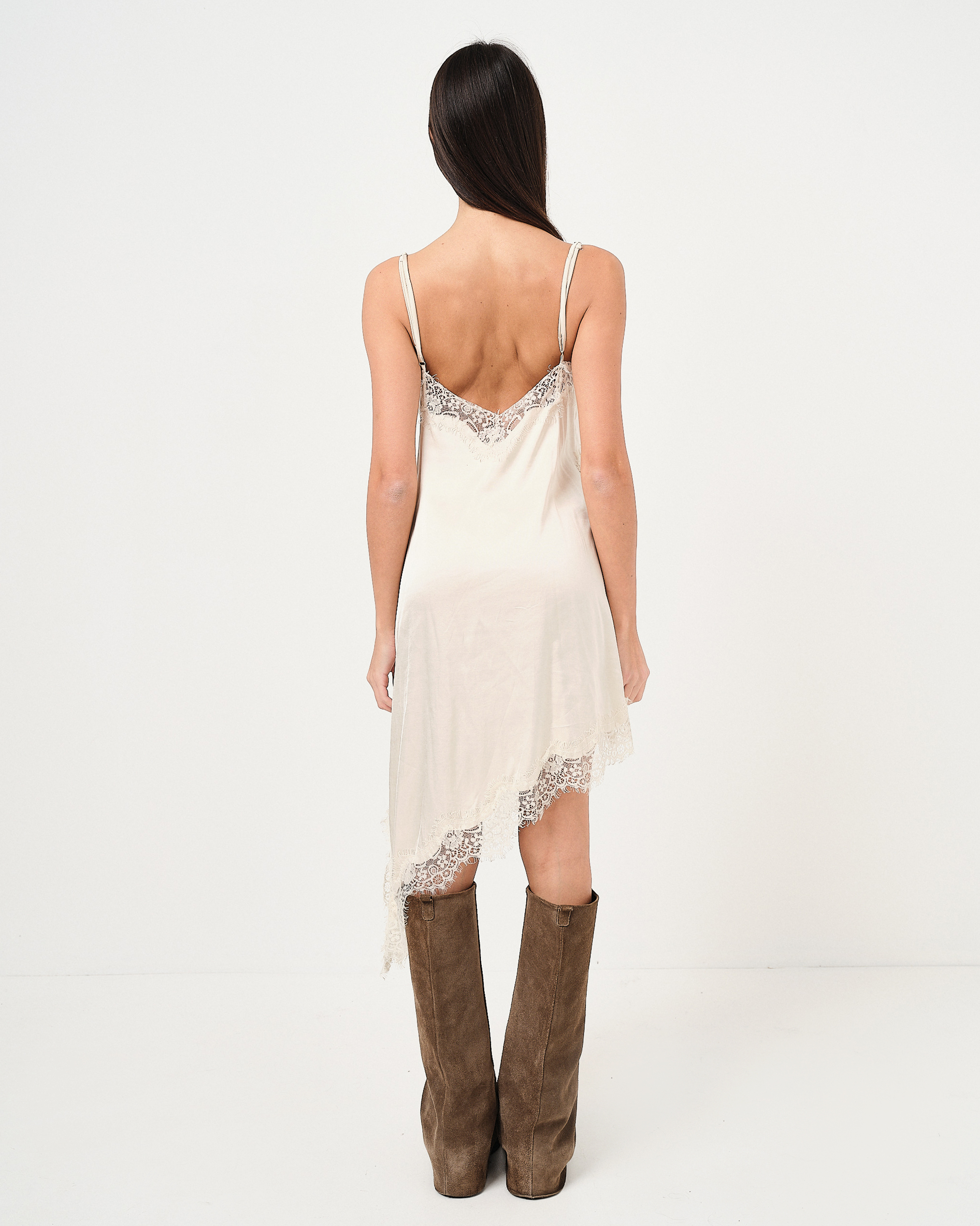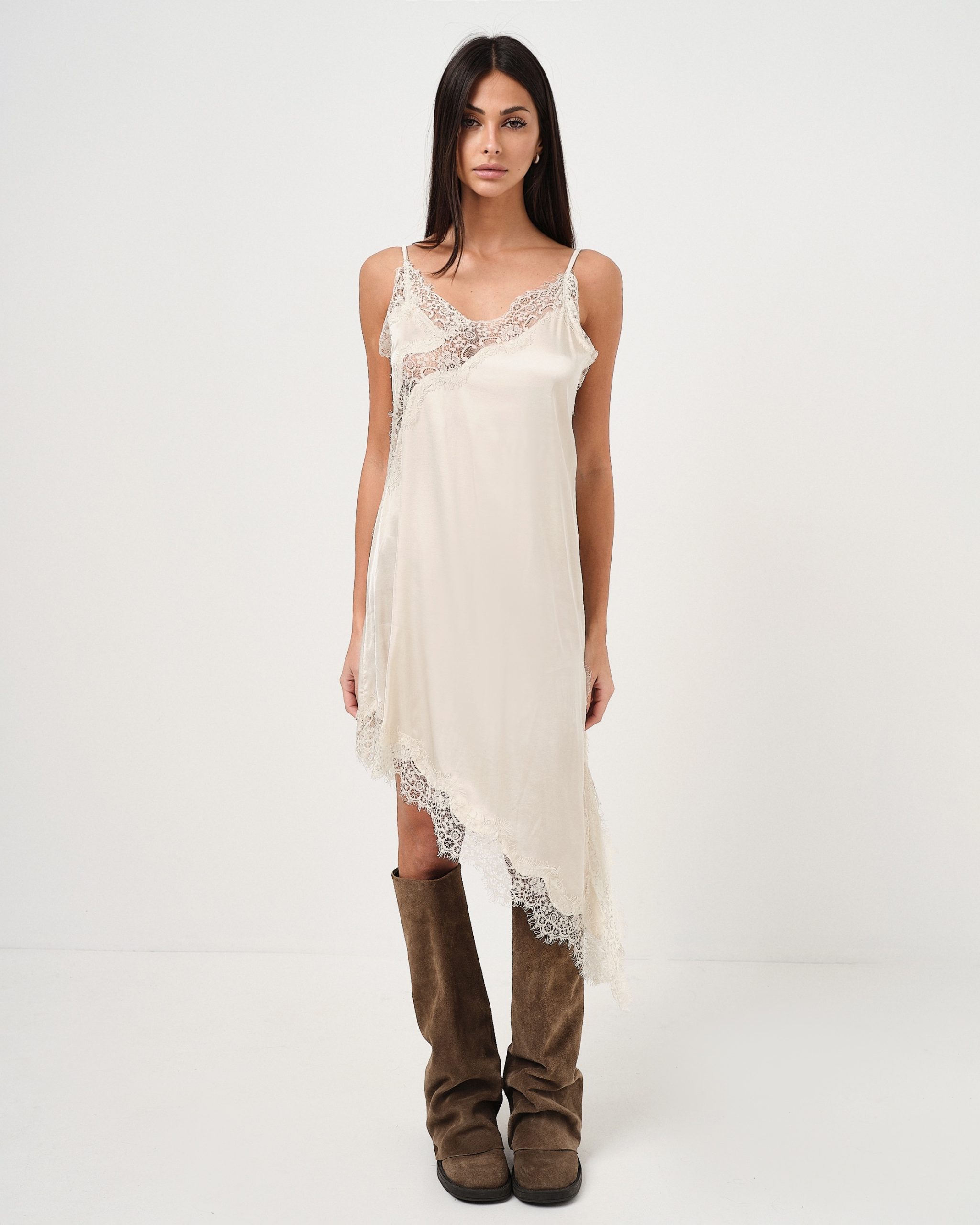 Abito asimmetrico in raso con scollatura e fondo in pizzo.