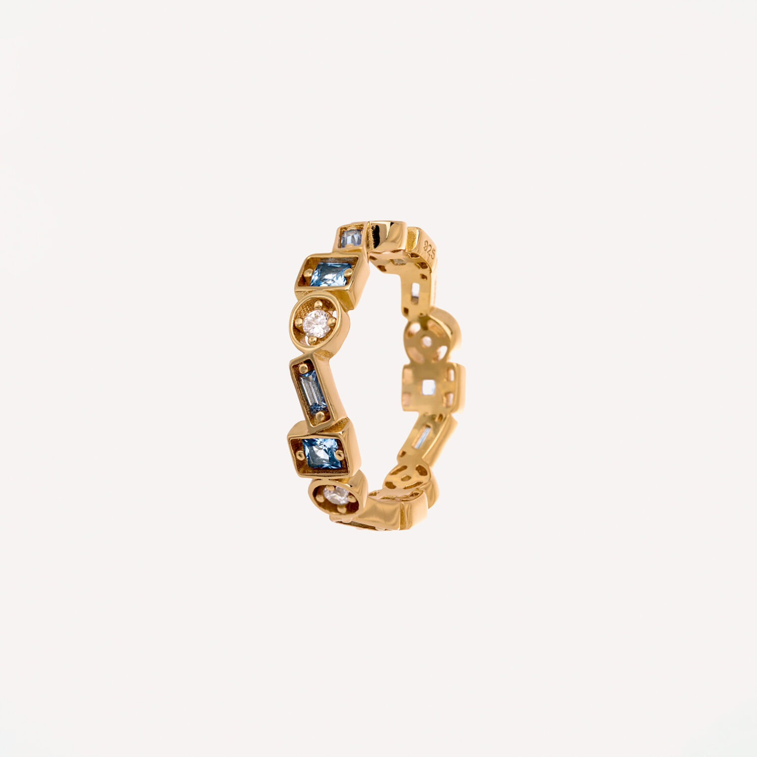 Anello a fascia con zirconi azzurri e bianchi incastonati a mano.