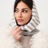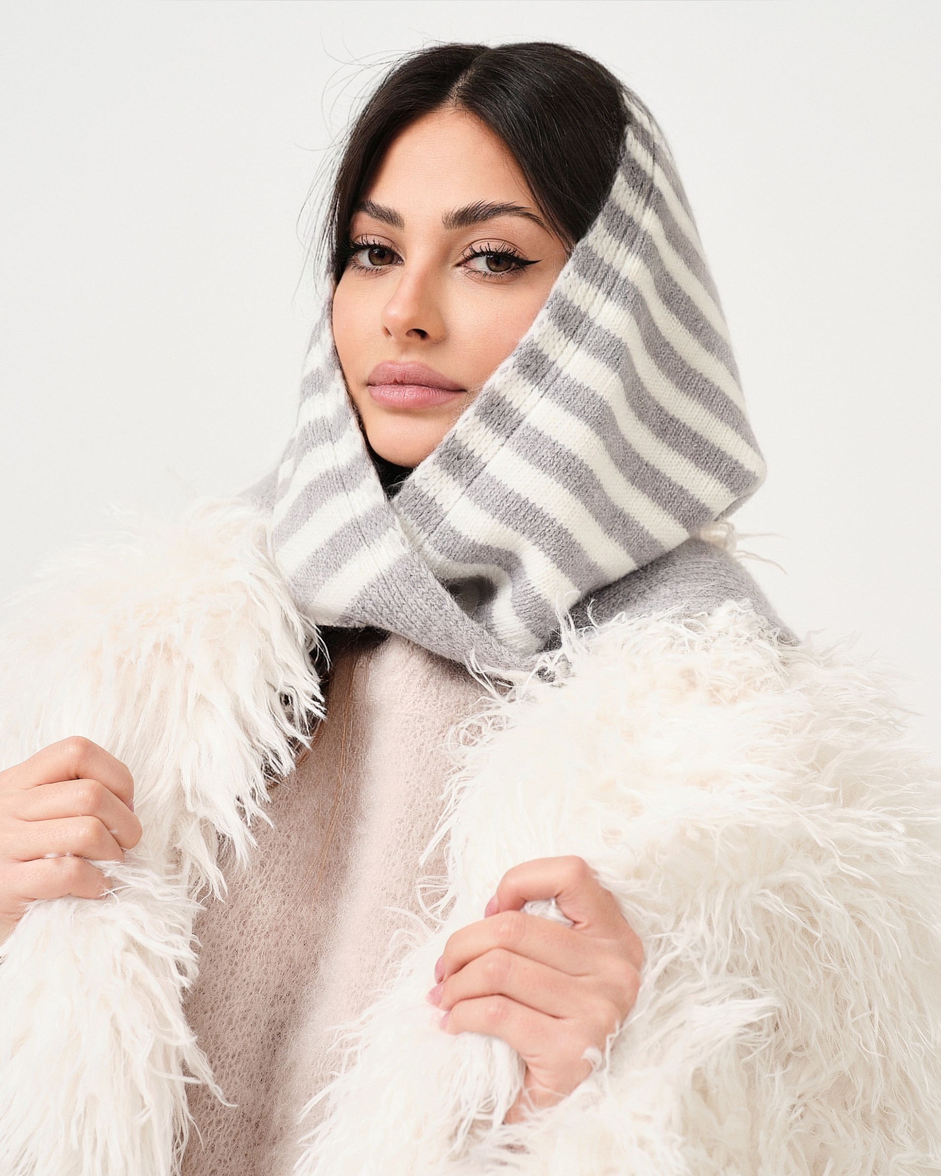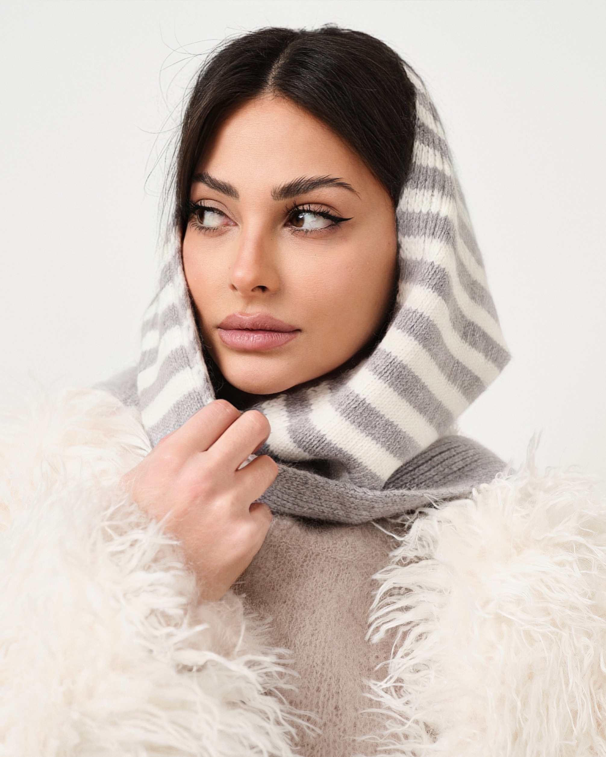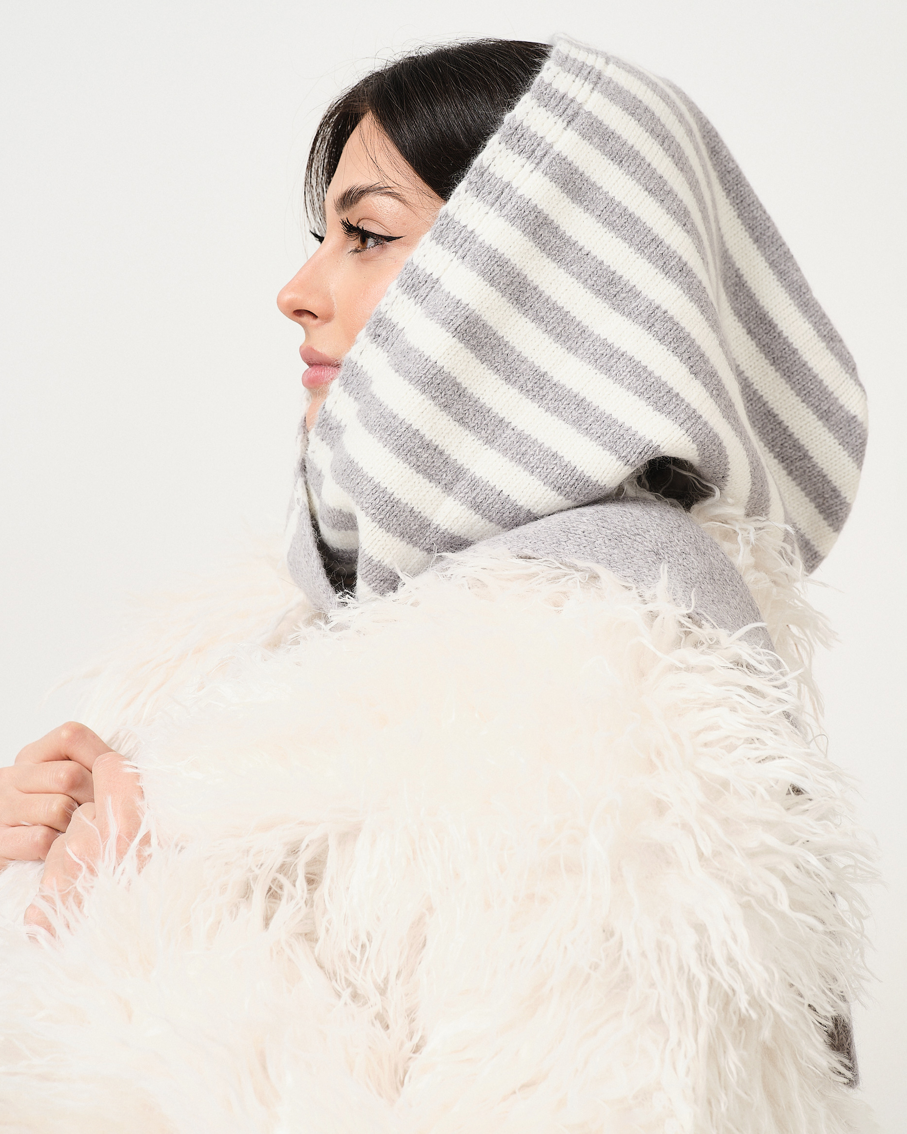 Balaclava in misto cashmere e lana con fantasia a righe e sciarpa incorporata.