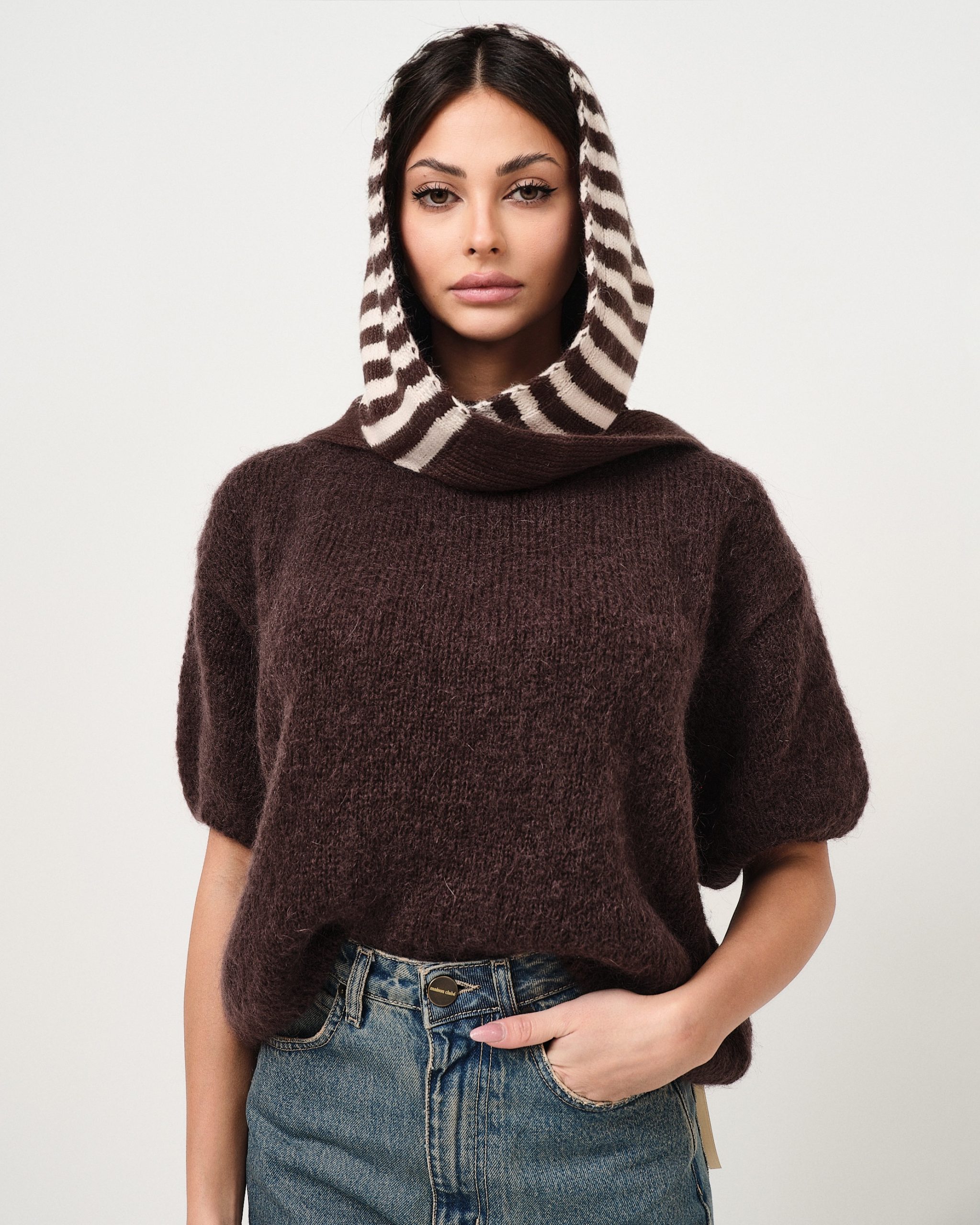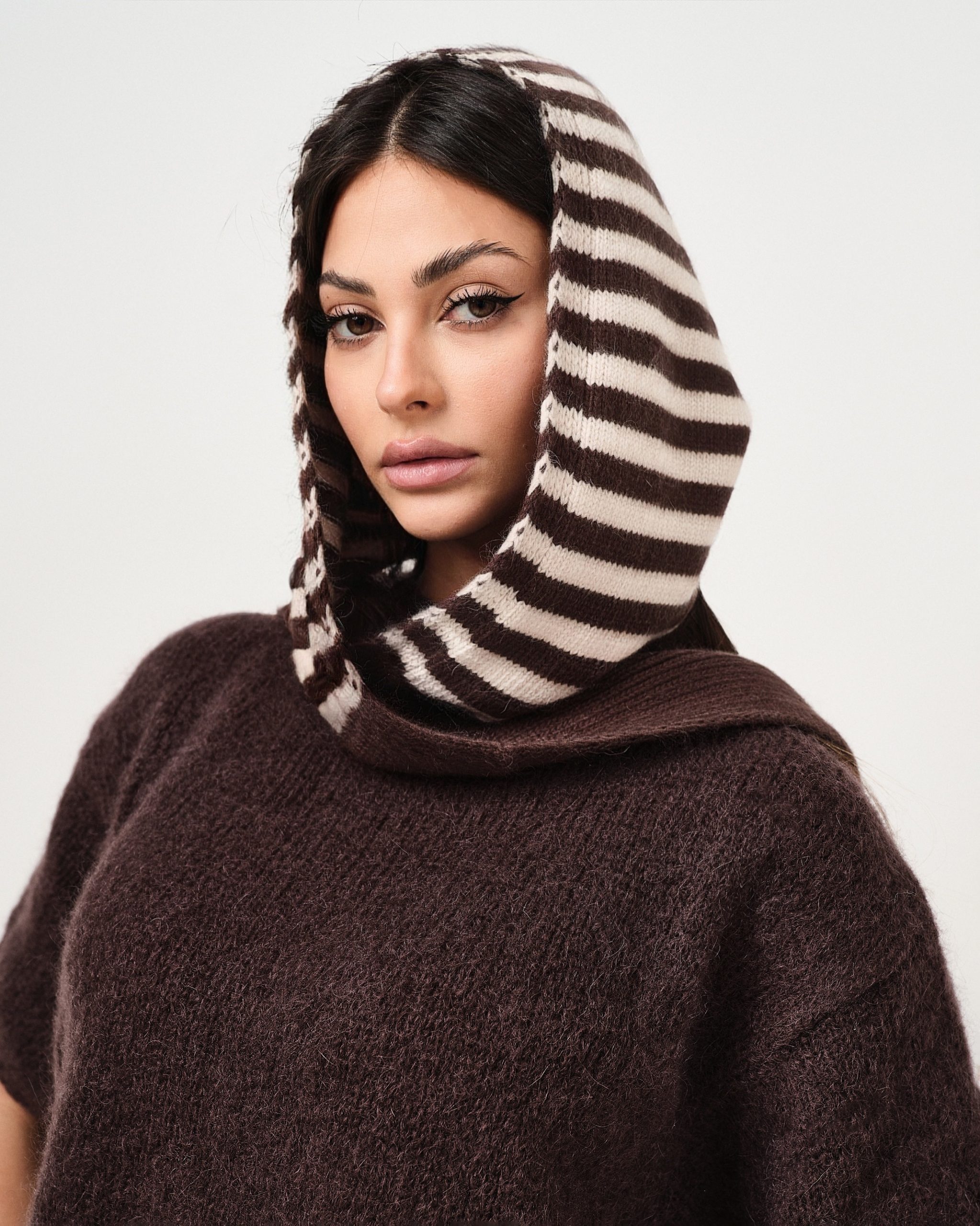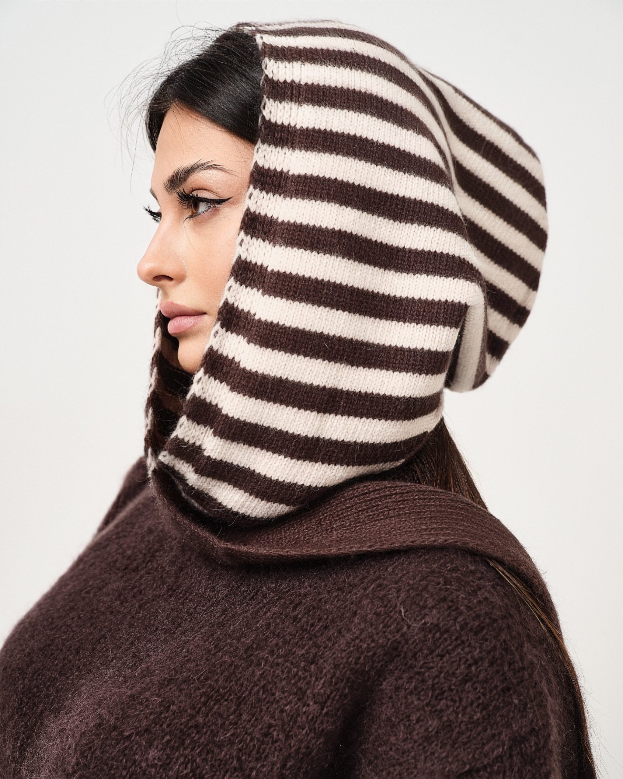 Balaclava in misto cashmere e lana con fantasia a righe e sciarpa incorporata.