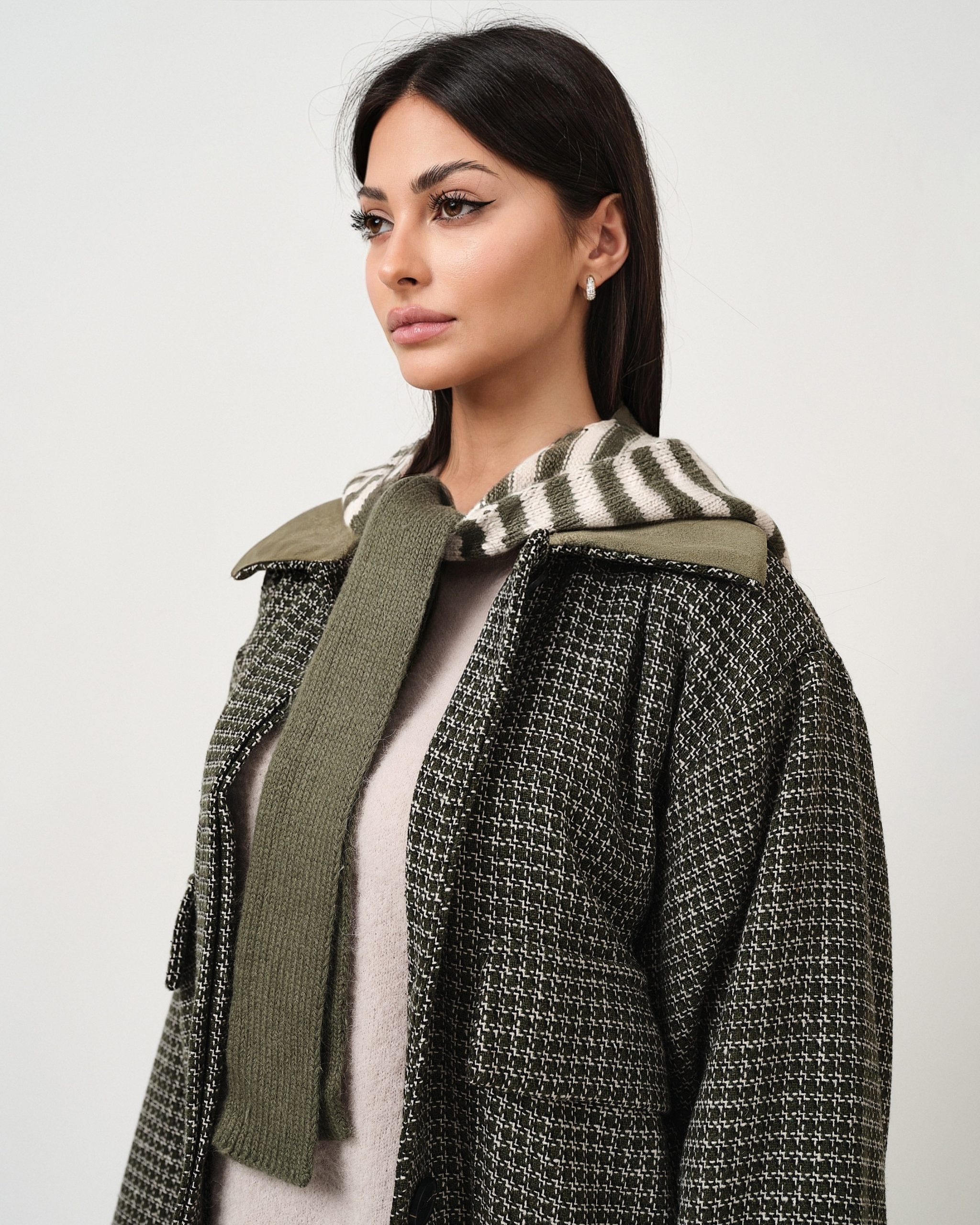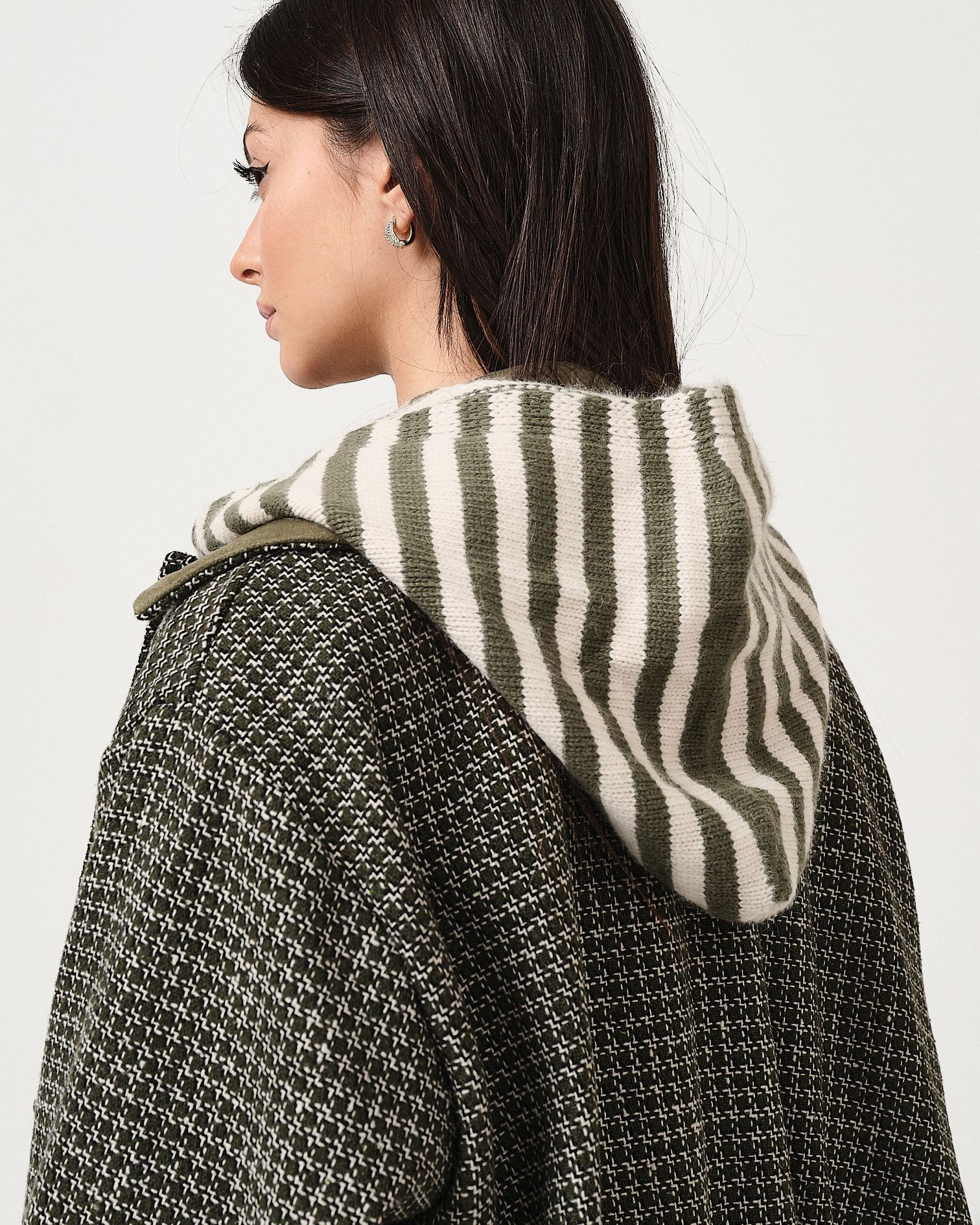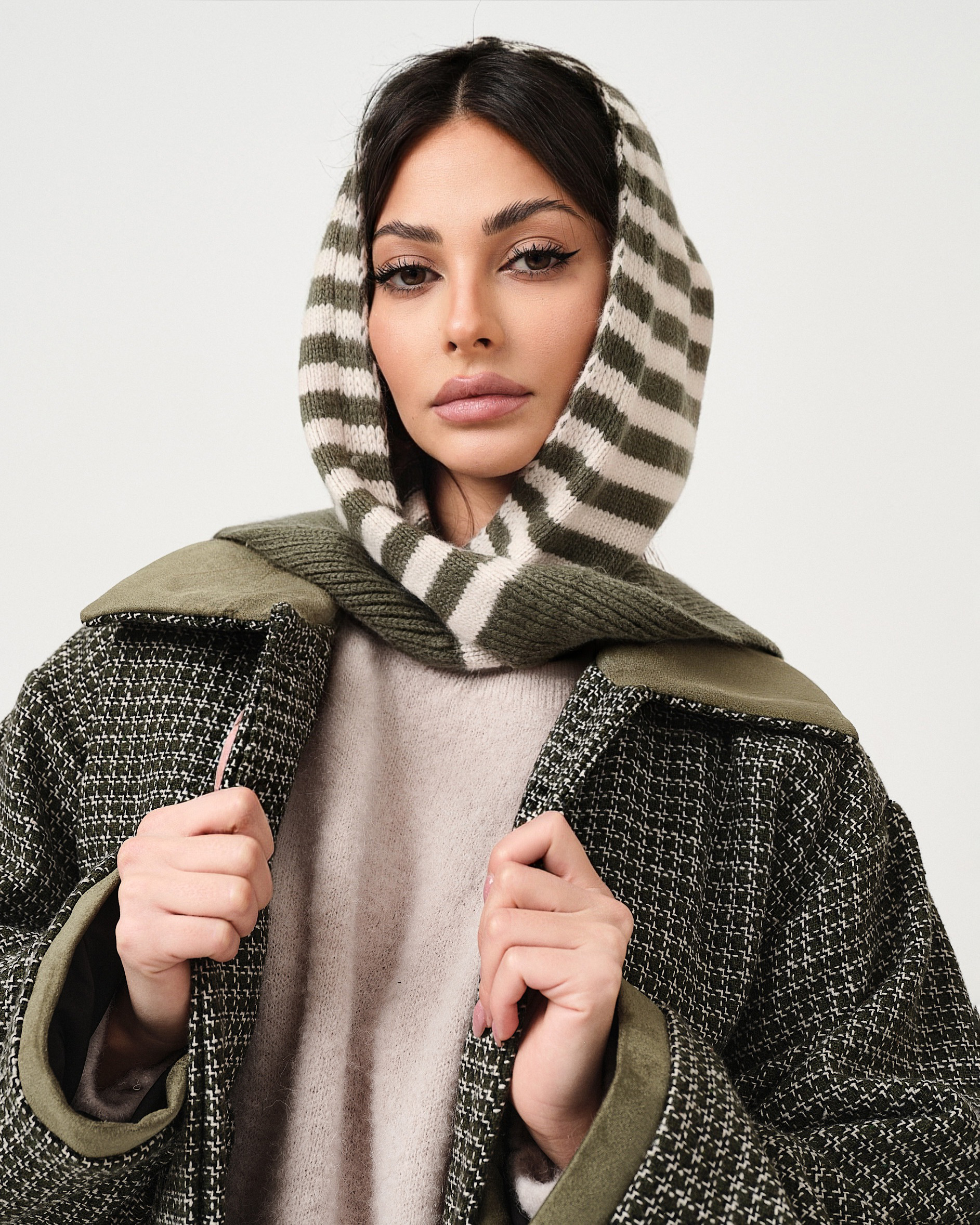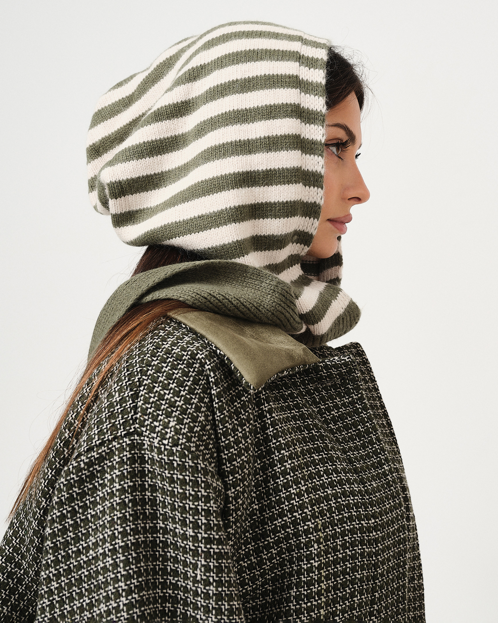 Balaclava in misto cashmere e lana con fantasia a righe e sciarpa incorporata.