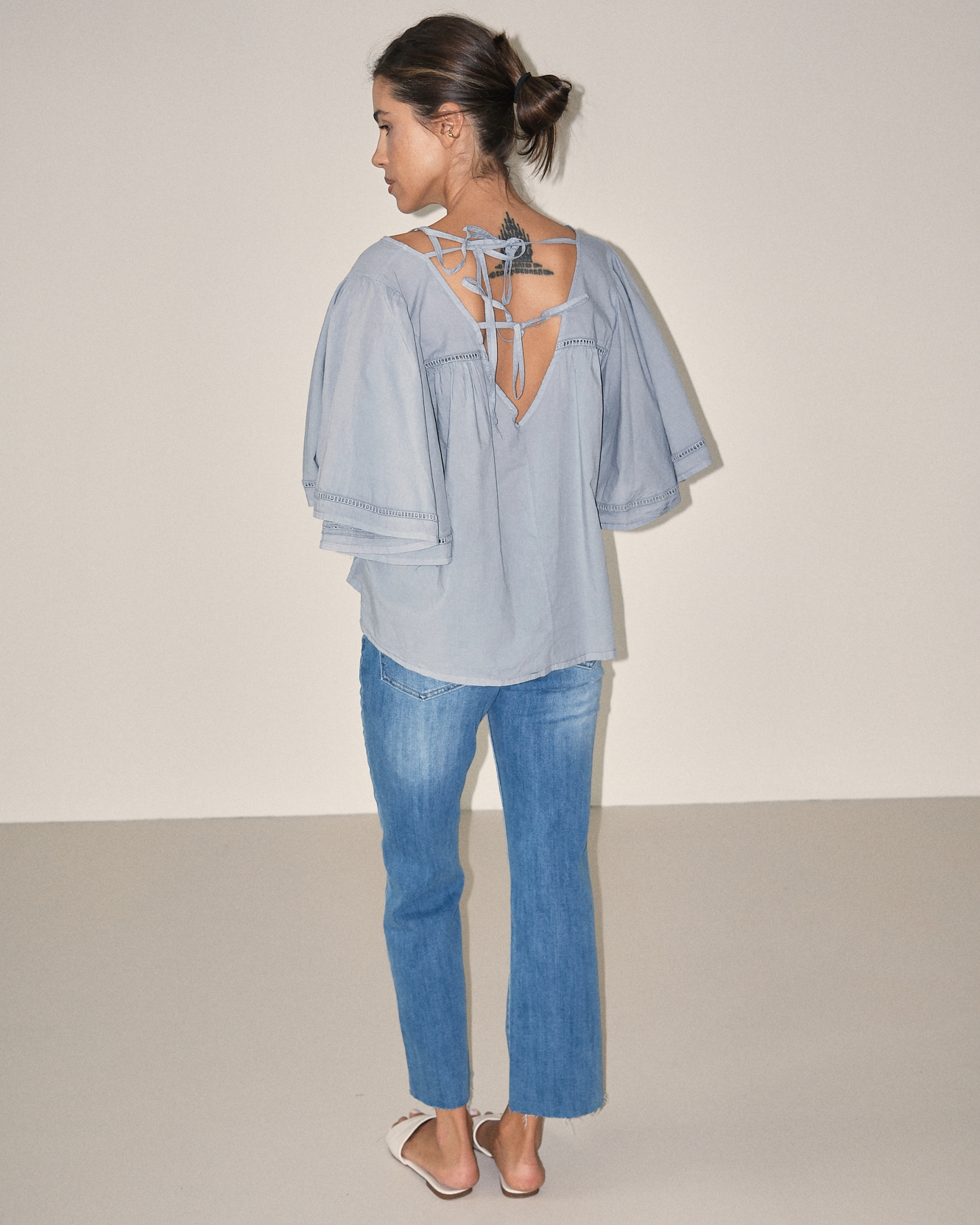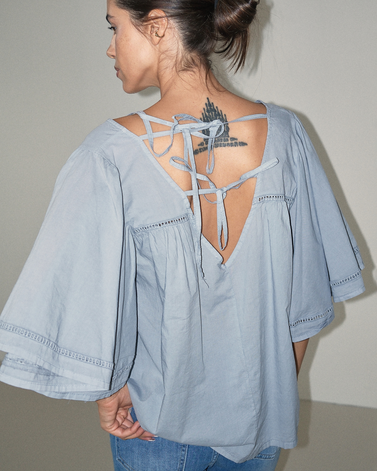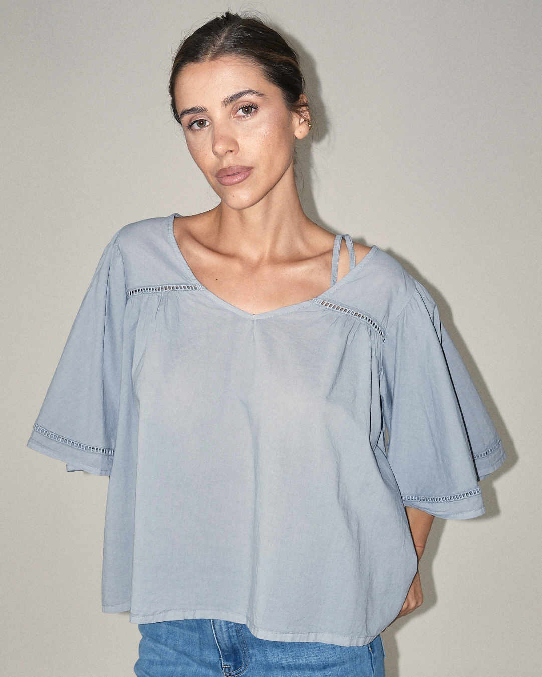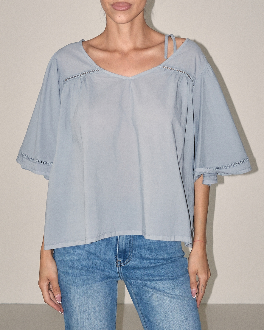 Blusa in cotone con scollo a V e maniche a tre quarti svasate.
