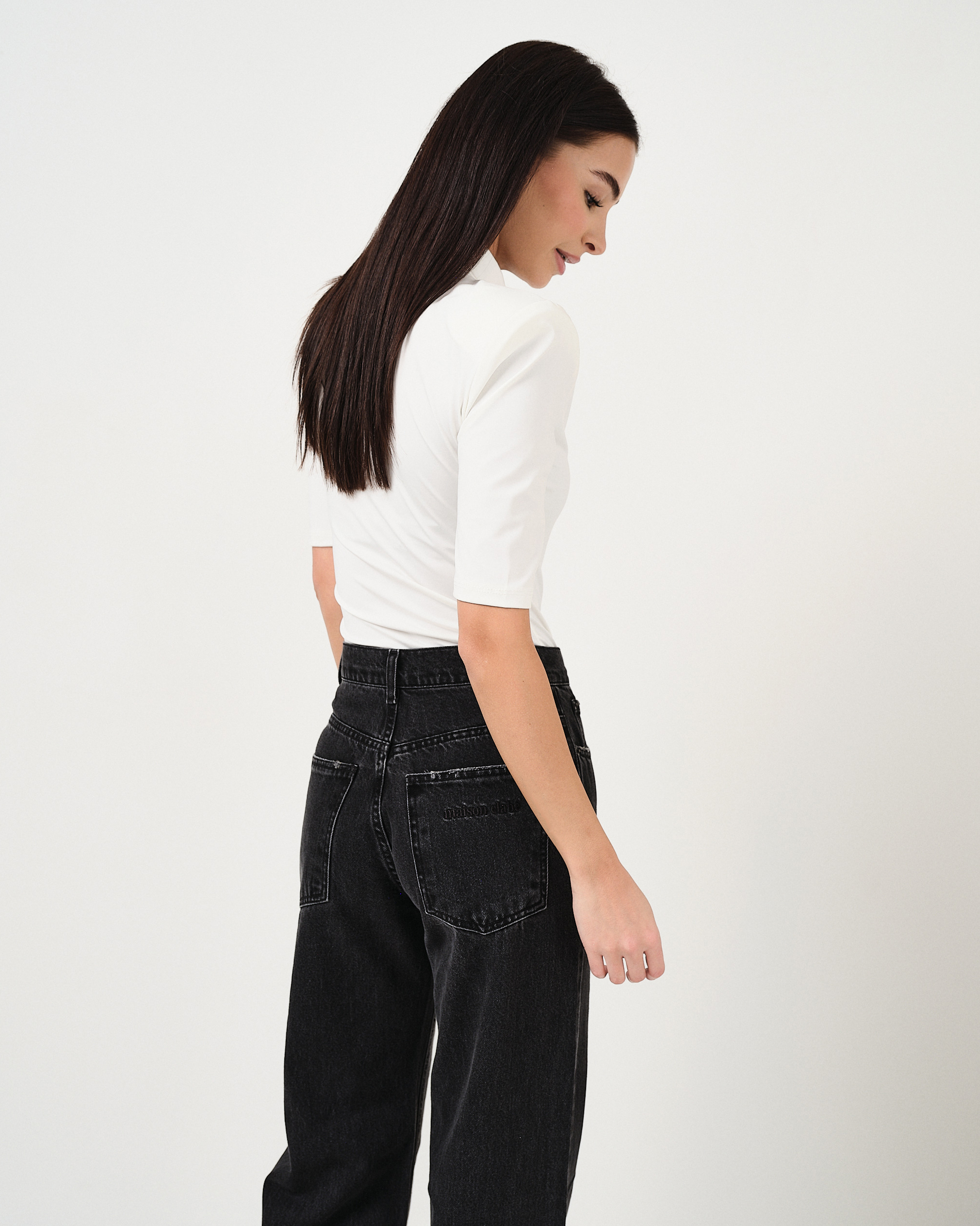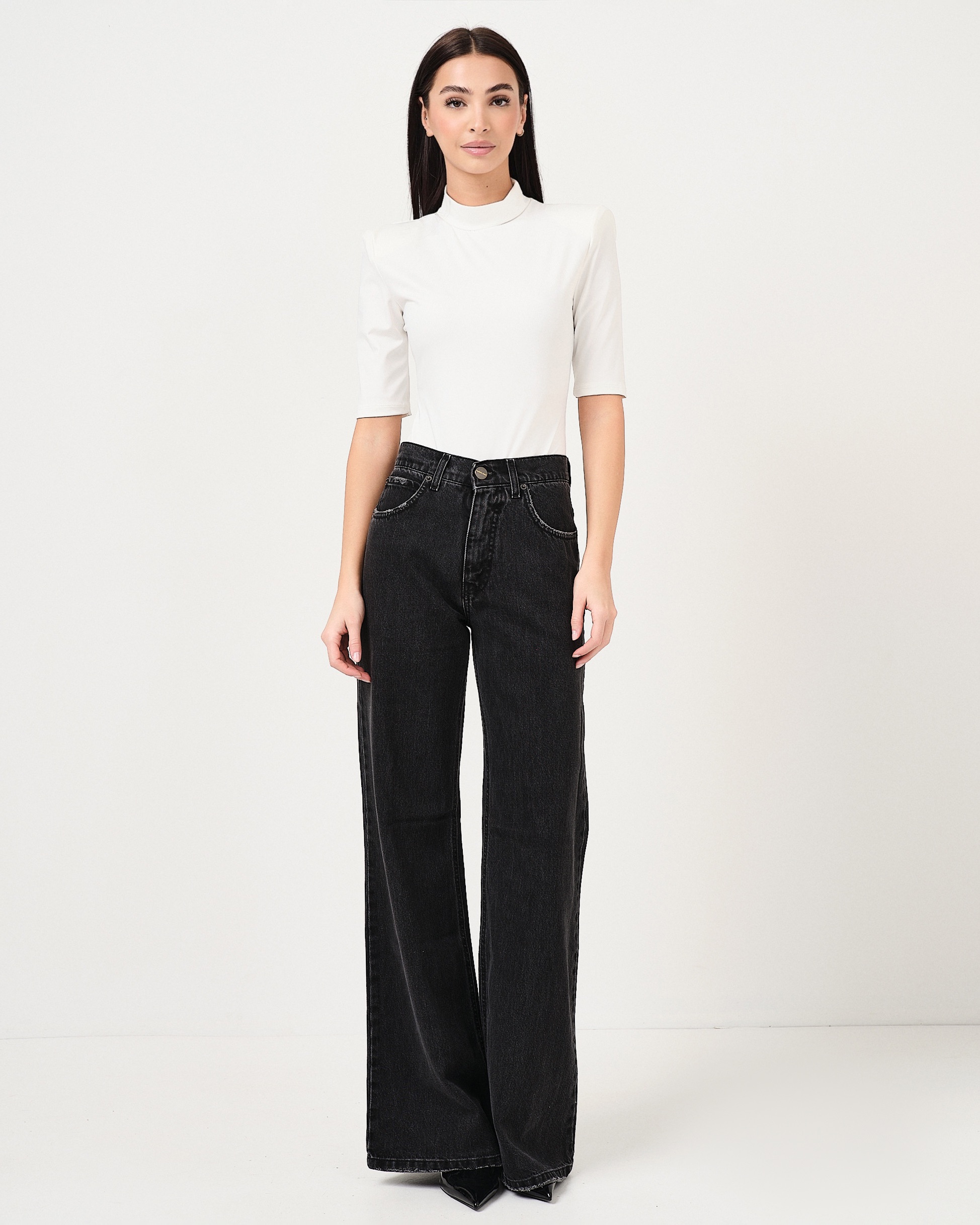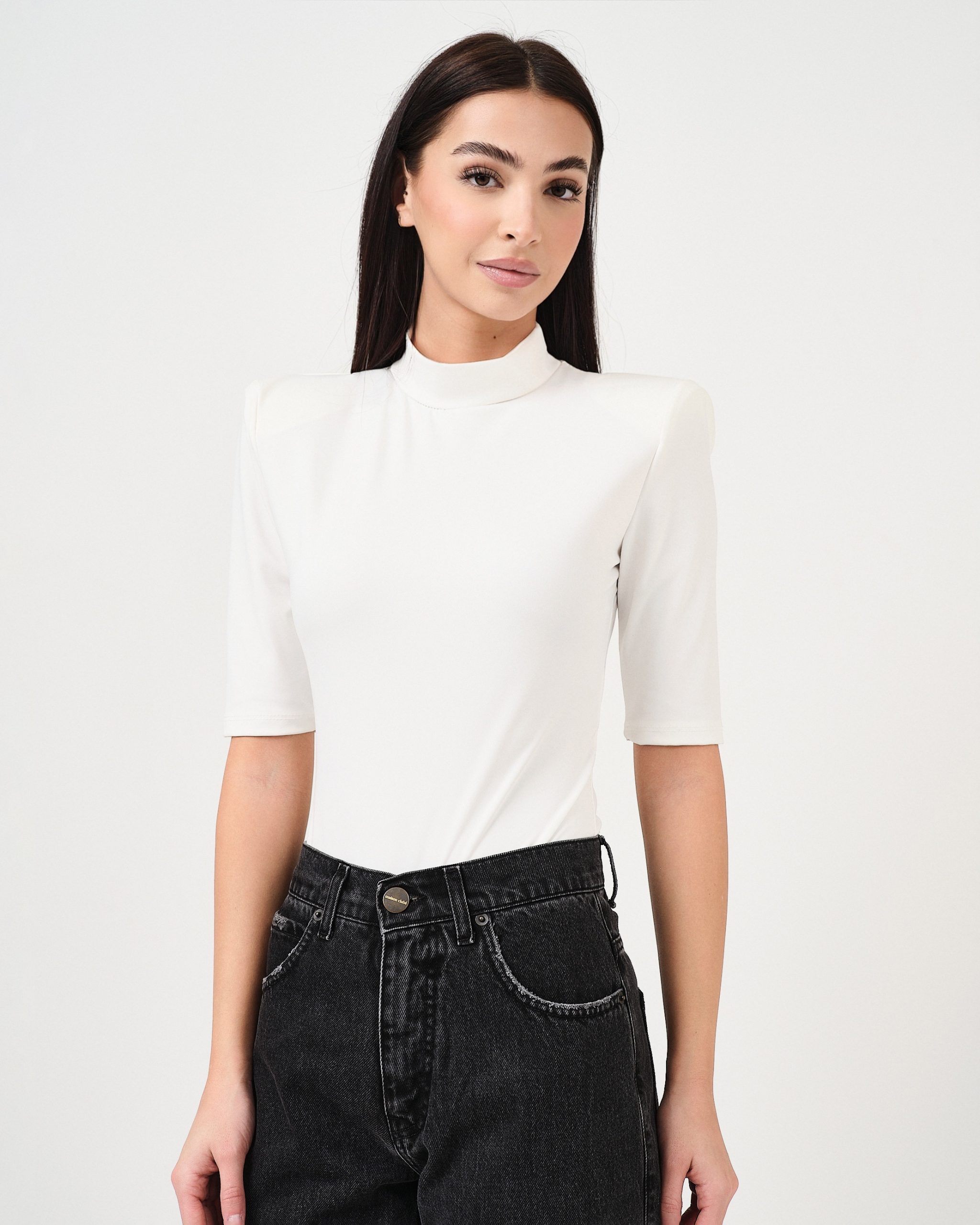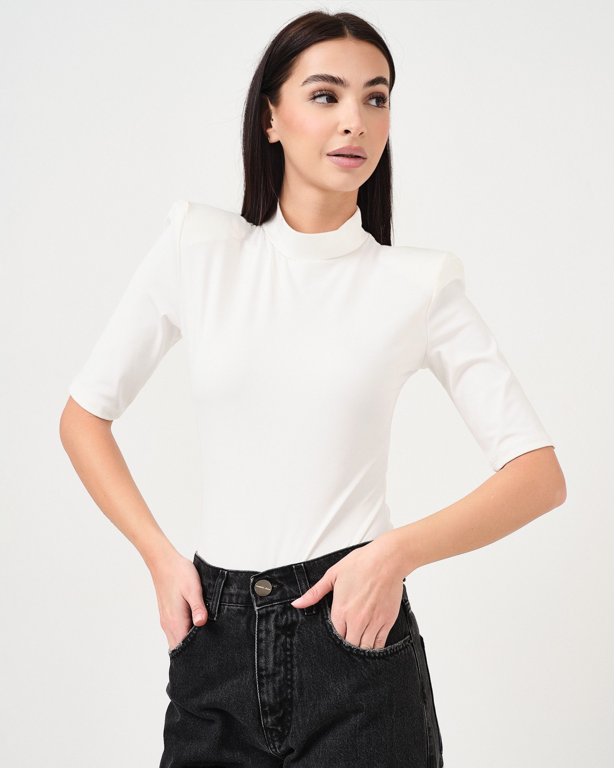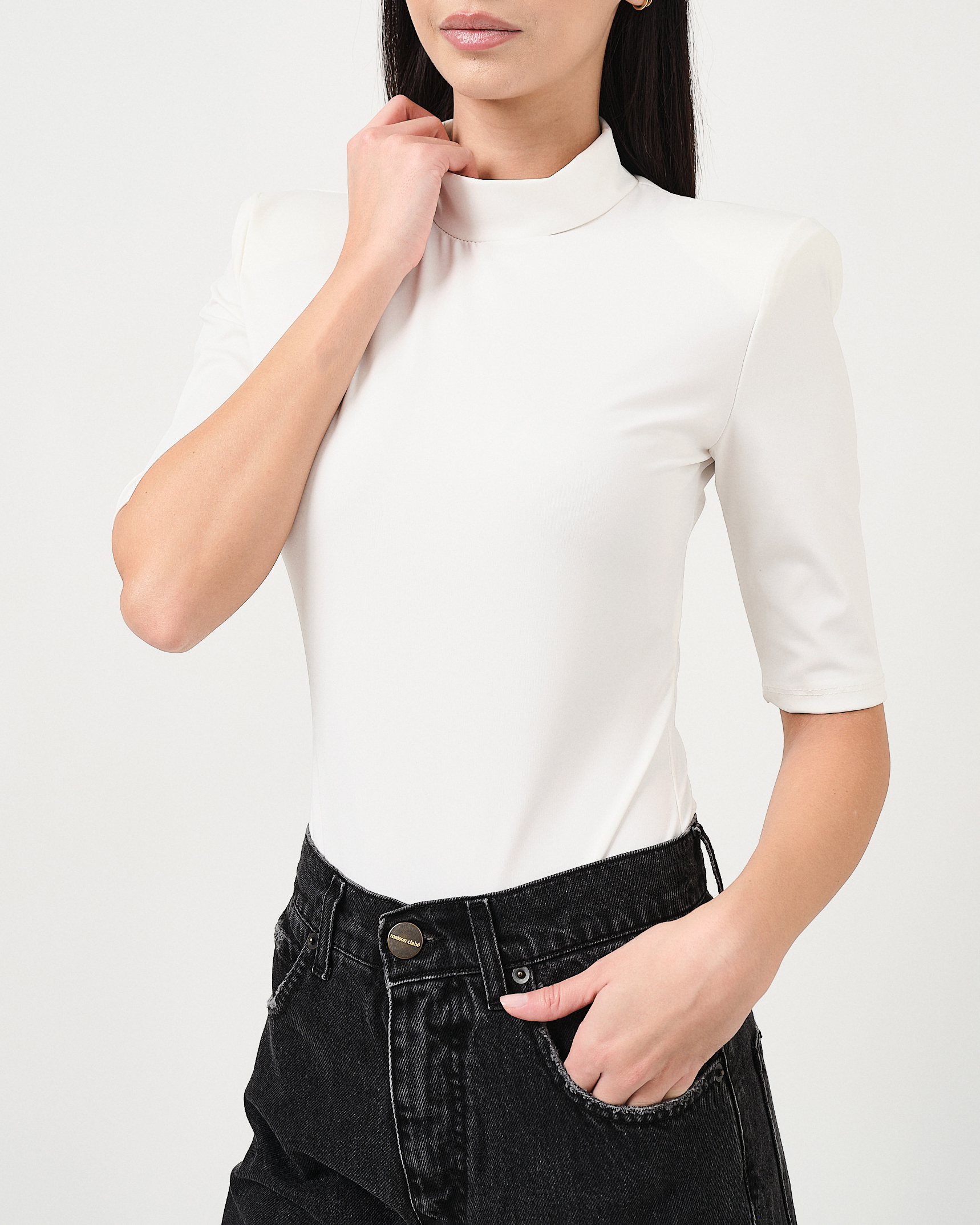 Body in lycra elasticizzata con collo a lupetto, manica a tre quarti e spalline imbottite.