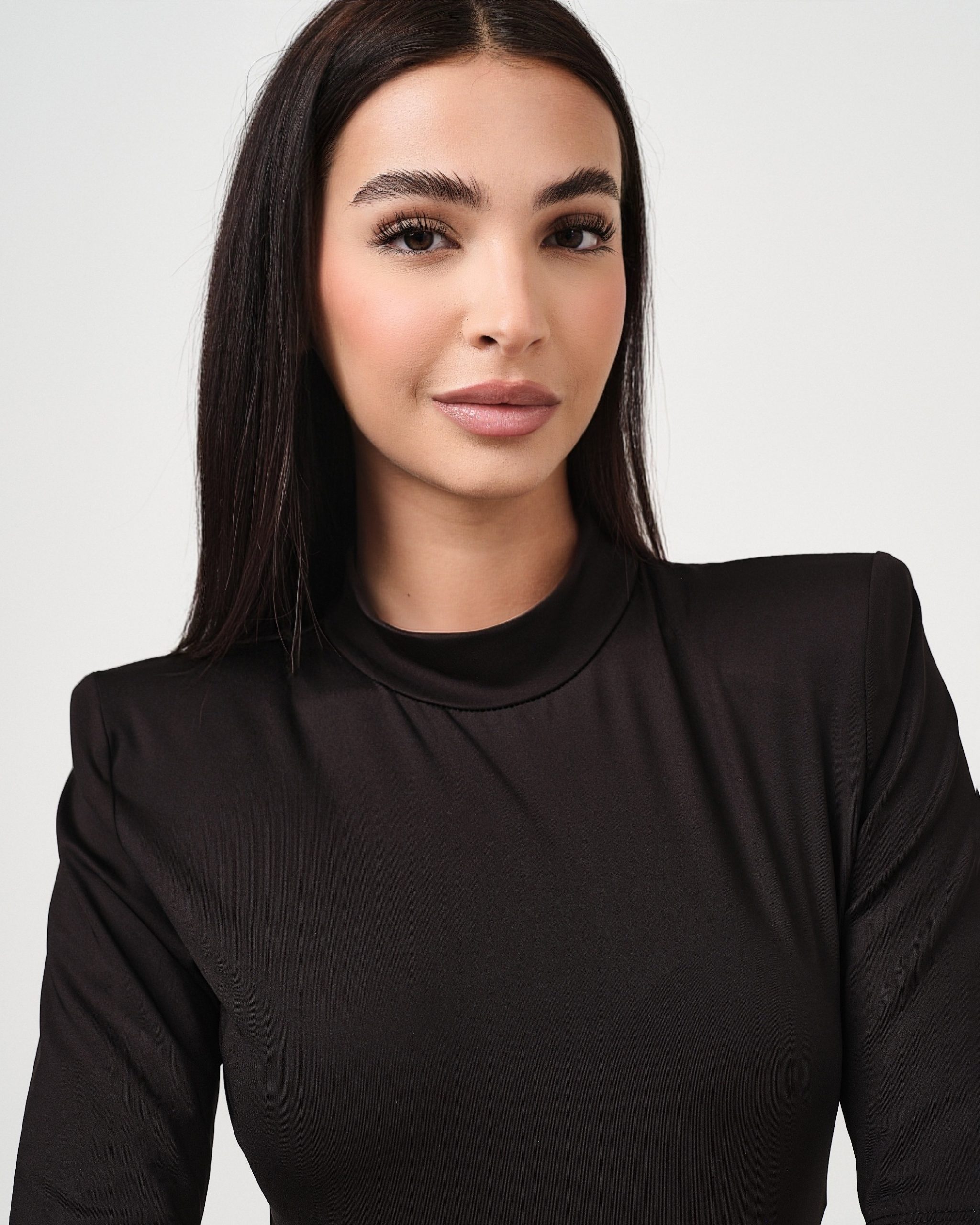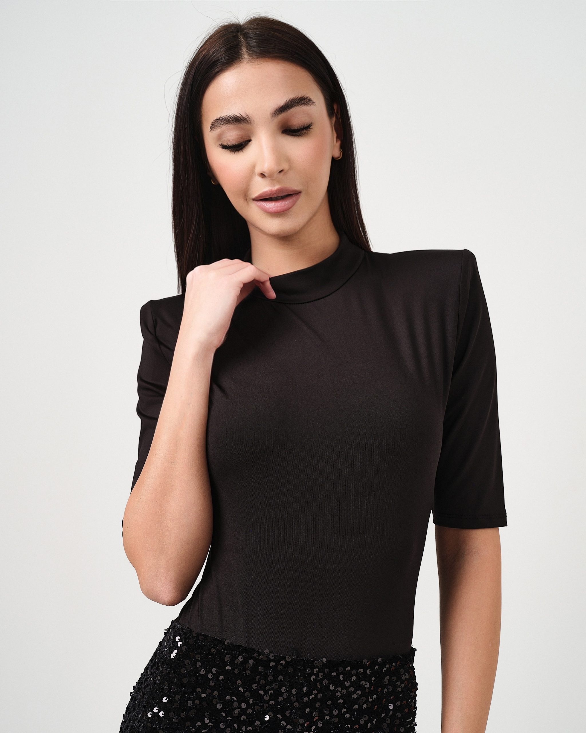 Body in lycra elasticizzata con collo a lupetto, manica a tre quarti e spalline imbottite.