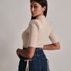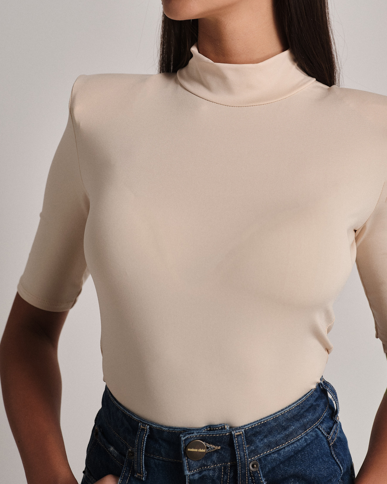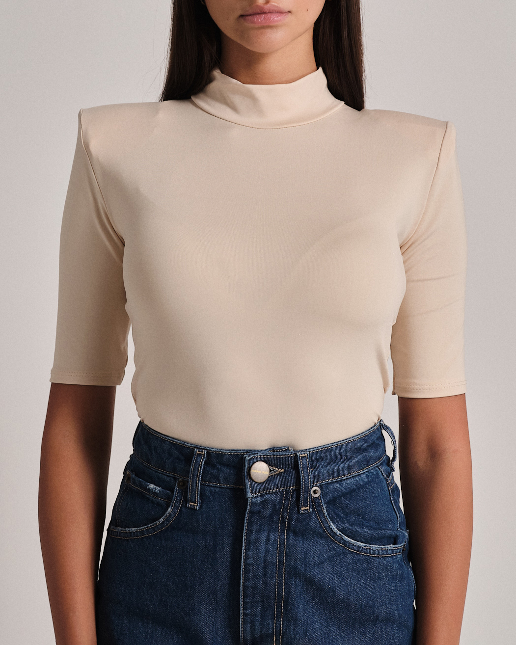 Body in lycra elasticizzata con spalline imbottite a mezza manica e collo a lupetto.