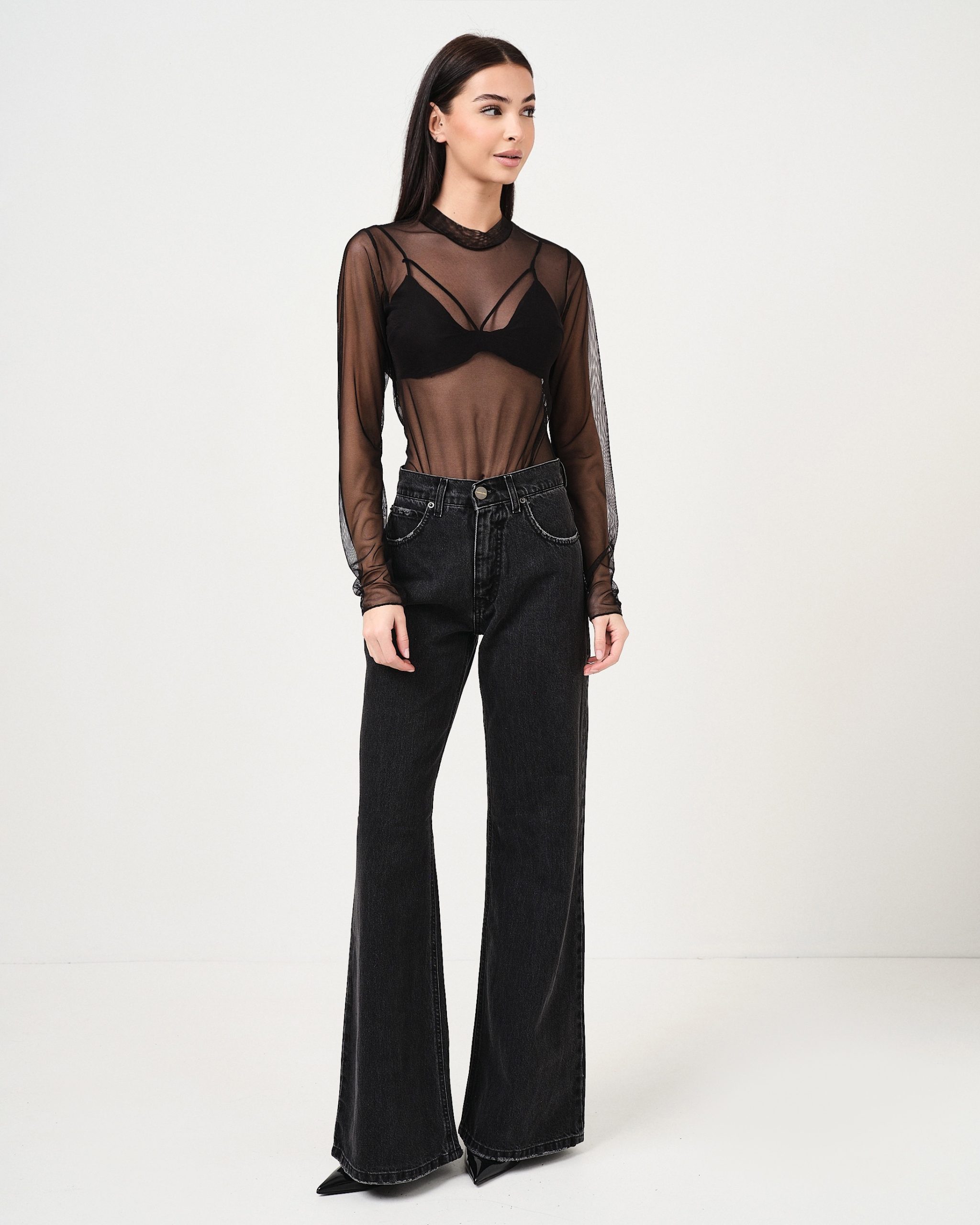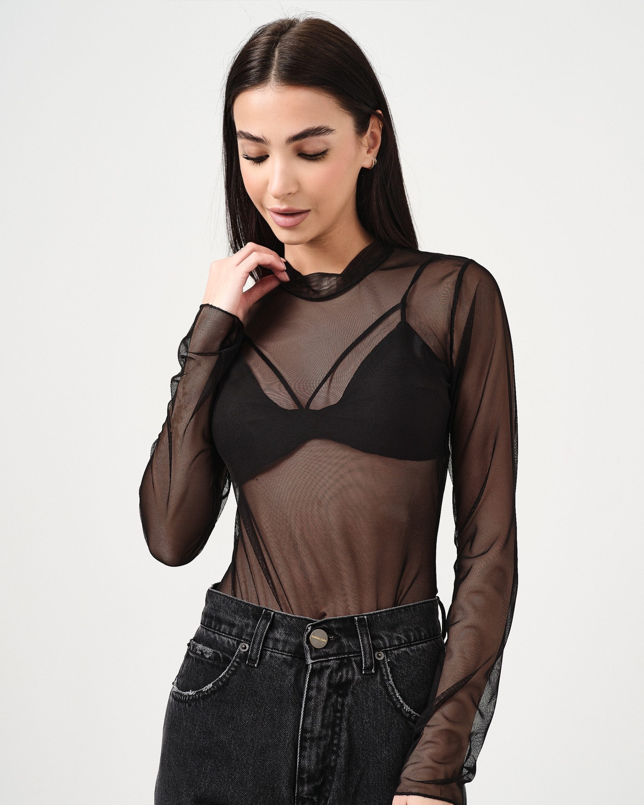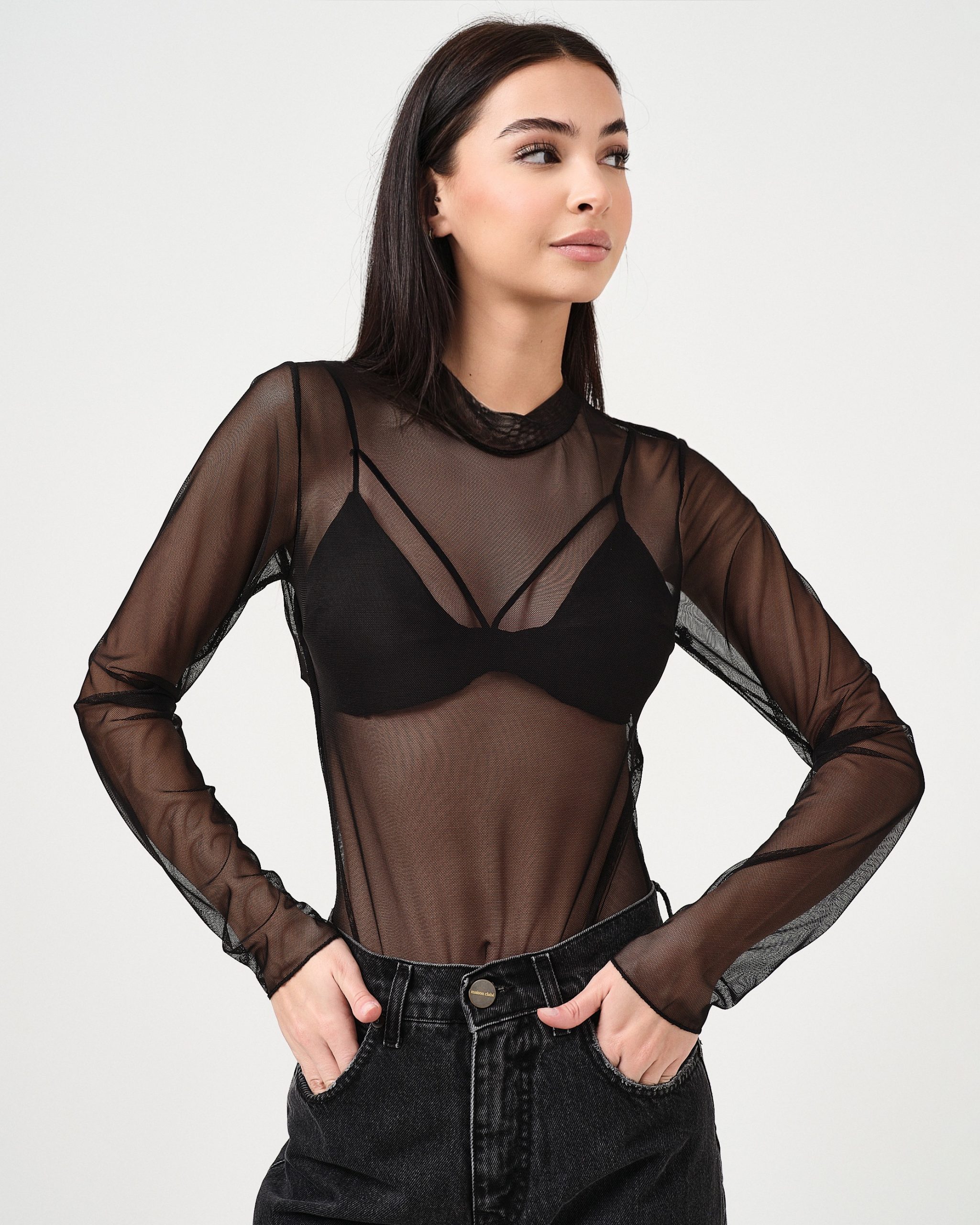 Body a manica lunga in tulle trasparente con collo a lupetto e top a contrasto.
