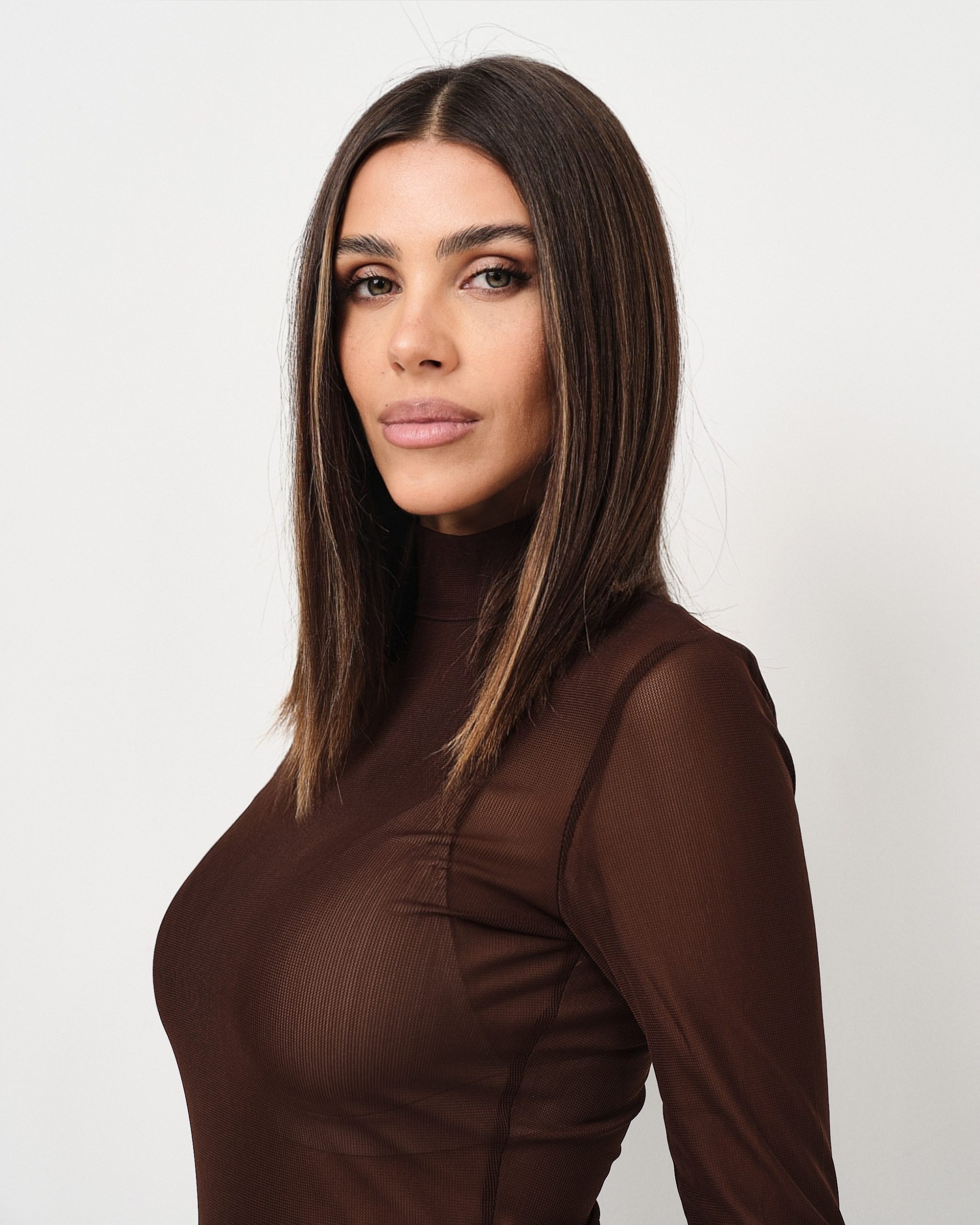 Body in tulle trasparente elasticizzato con collo a lupetto, manica lunga e chiusura regolabile.