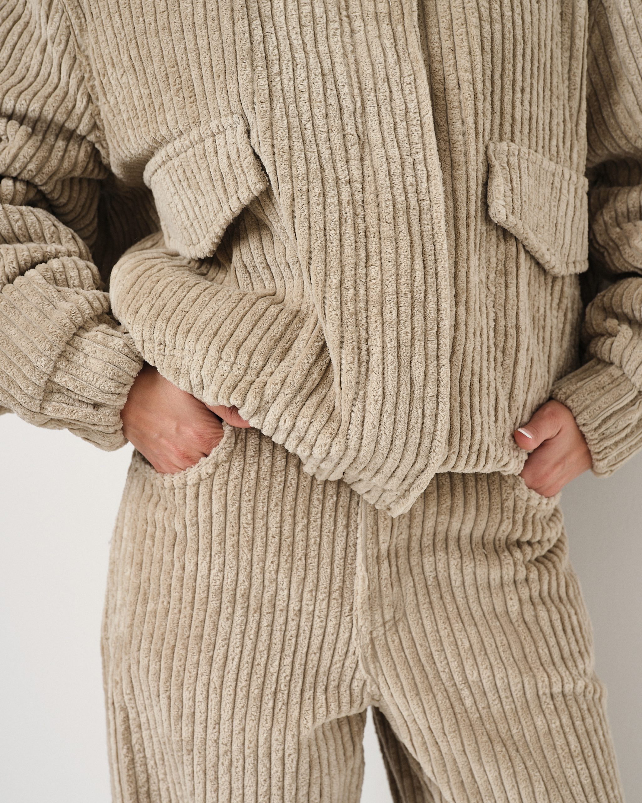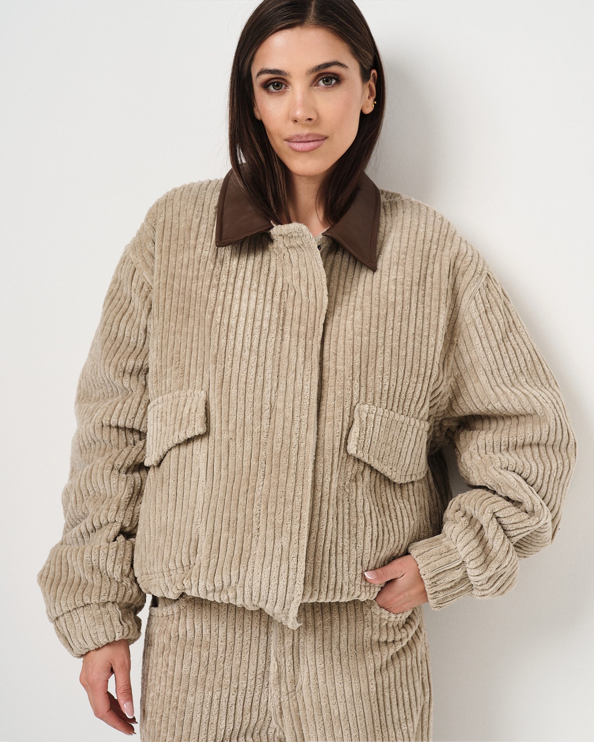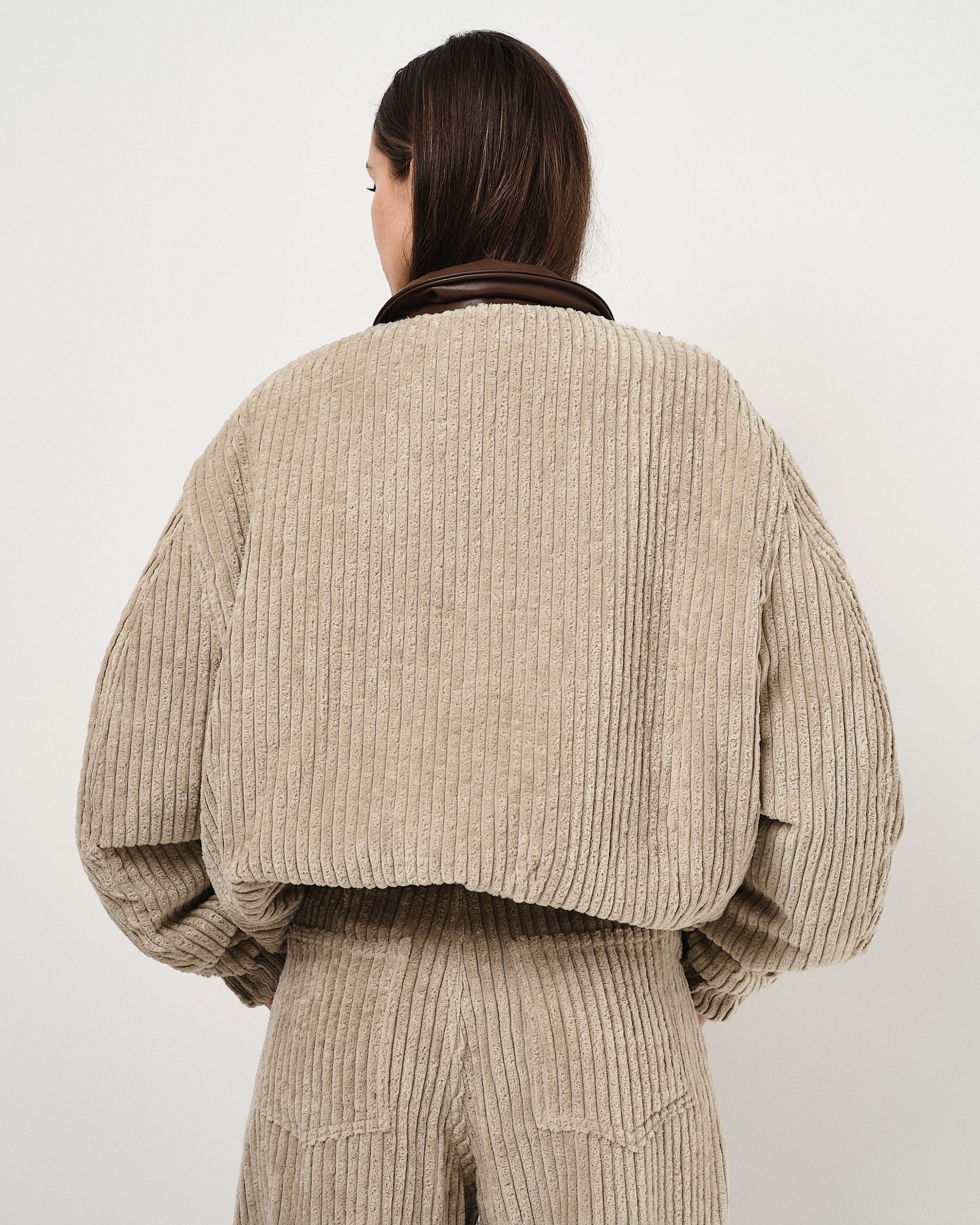 Bomber oversize in velluto a coste, tasche a vista e colletto a contrasto.