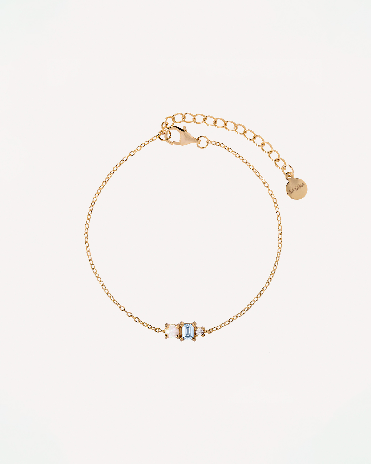 Bracciale a catenella sottile con Pietra della Luna e Zirconi sui toni dell’azzurro. Chiusura con moschettone.
