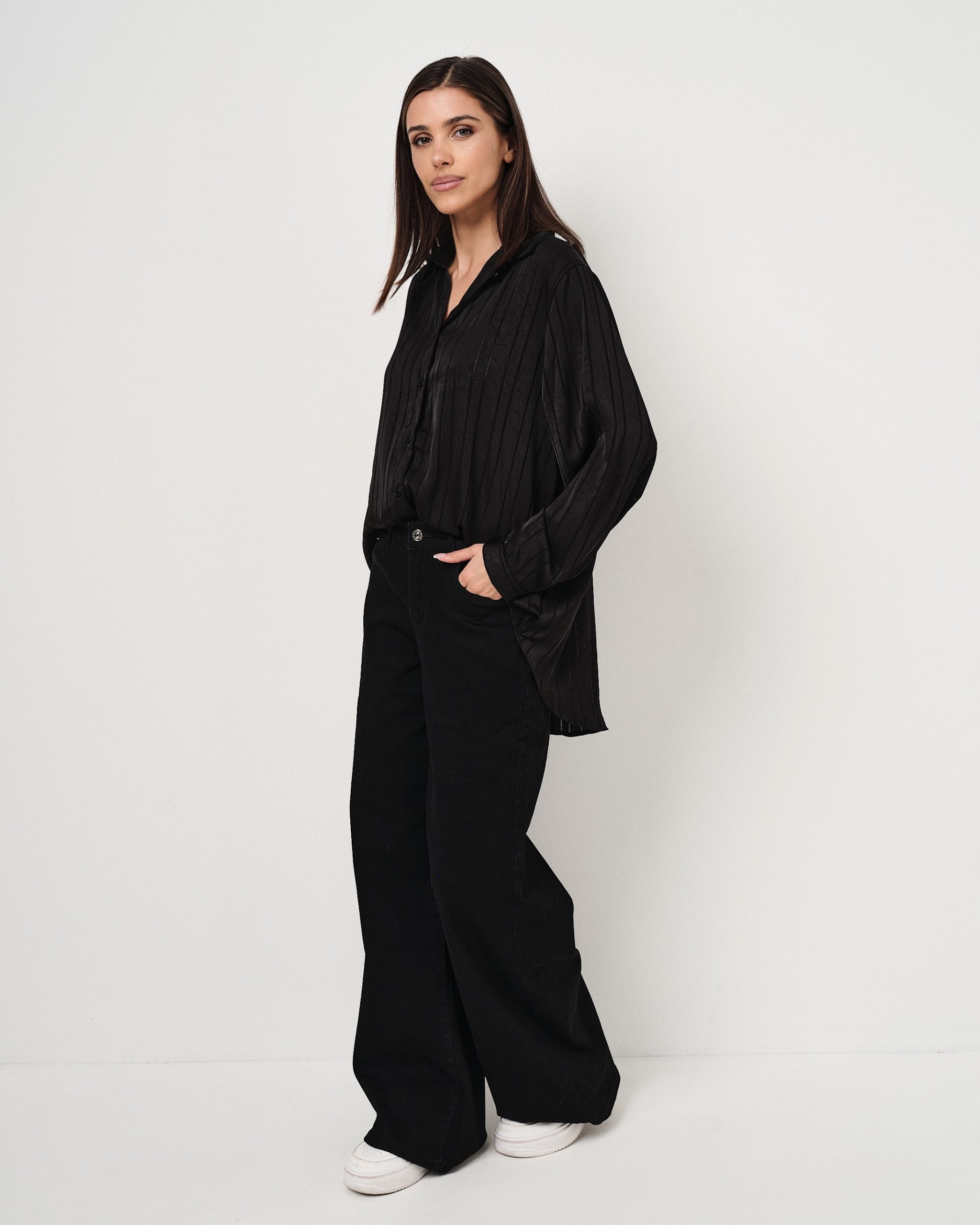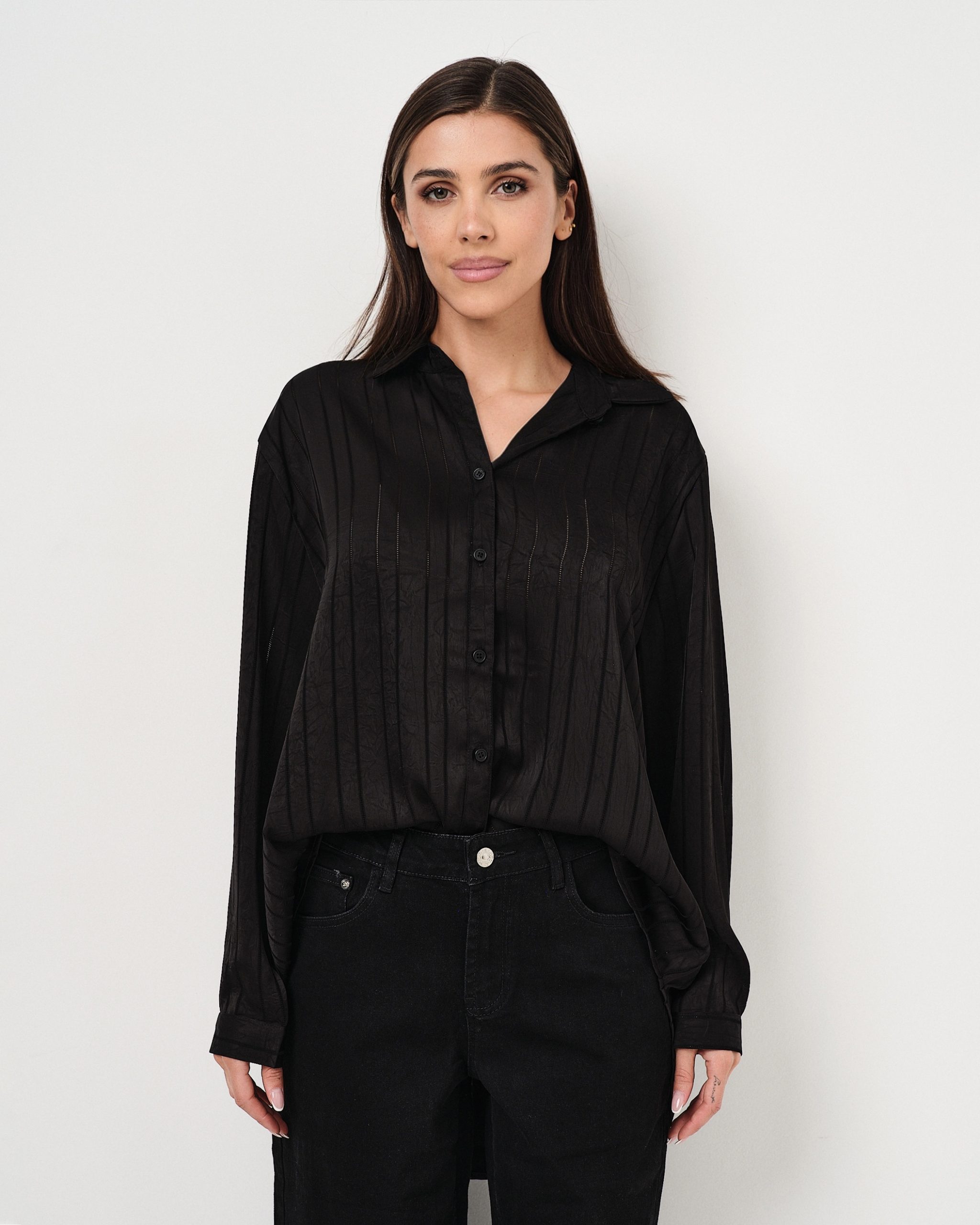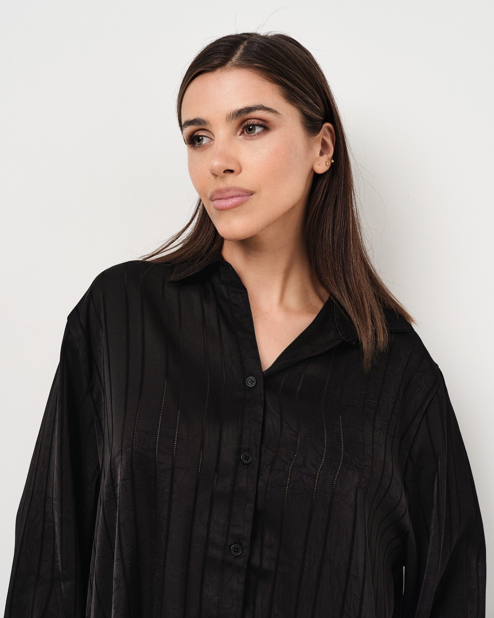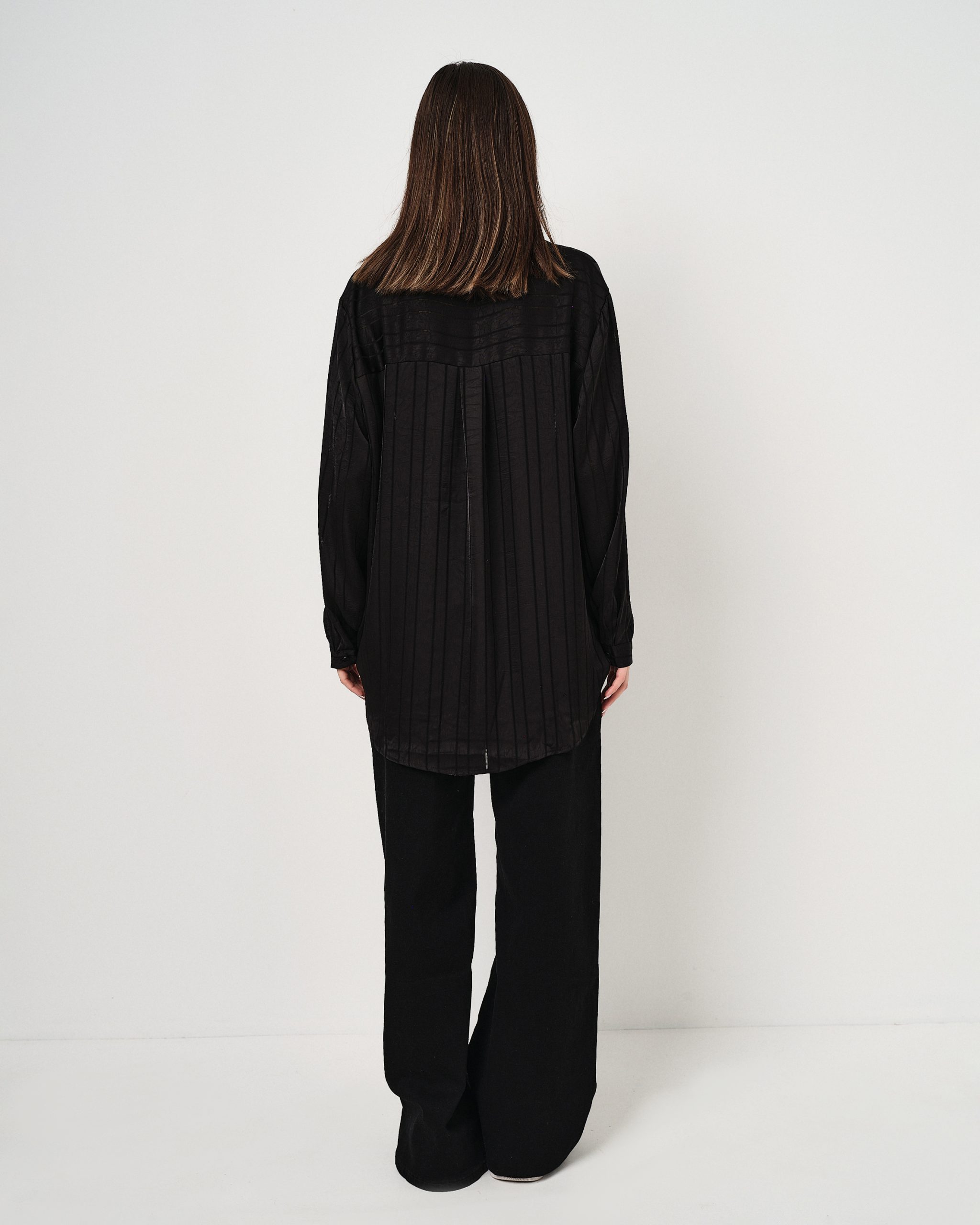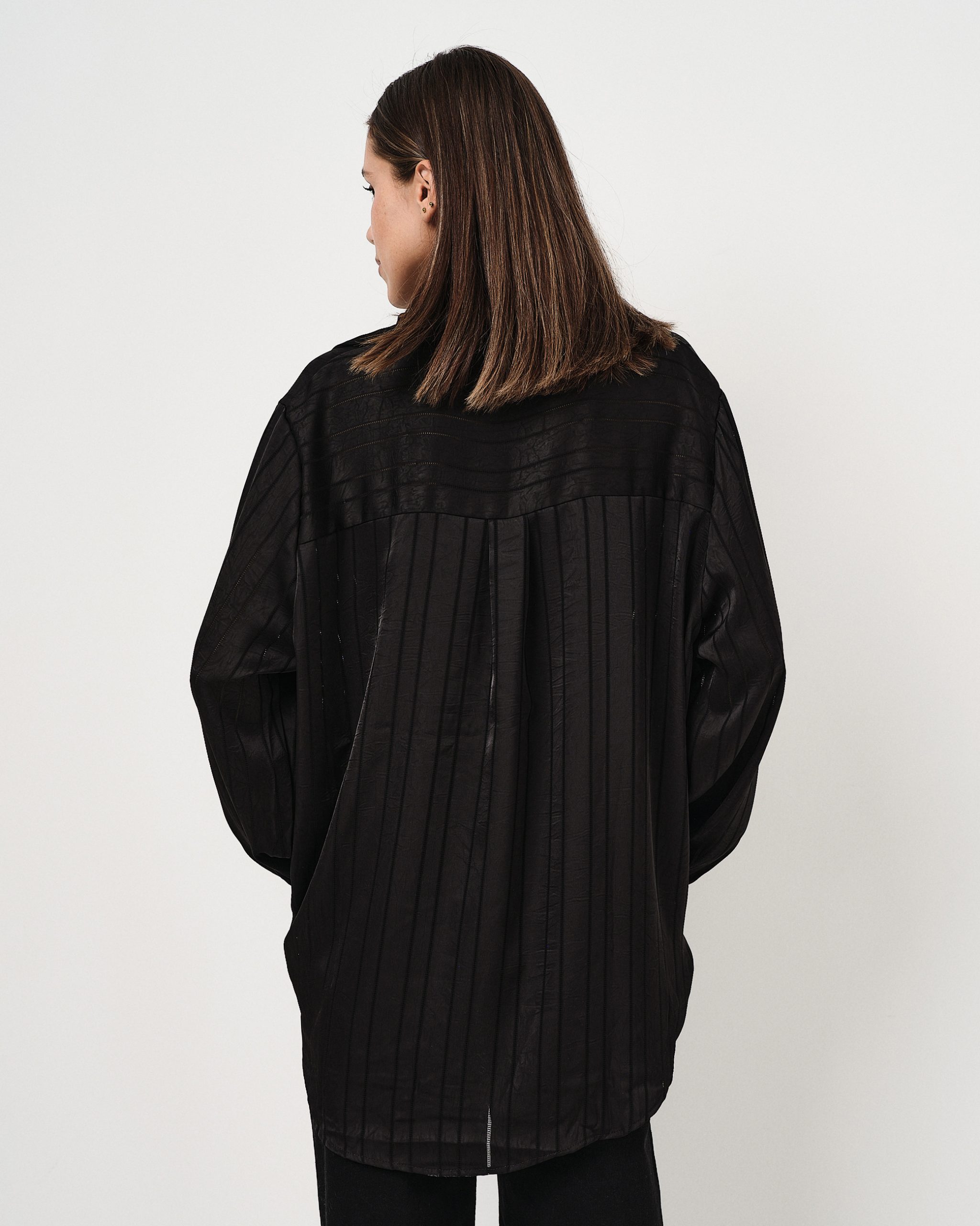 Camicia leggera in satin oversize con righe tono su tono in lurex.