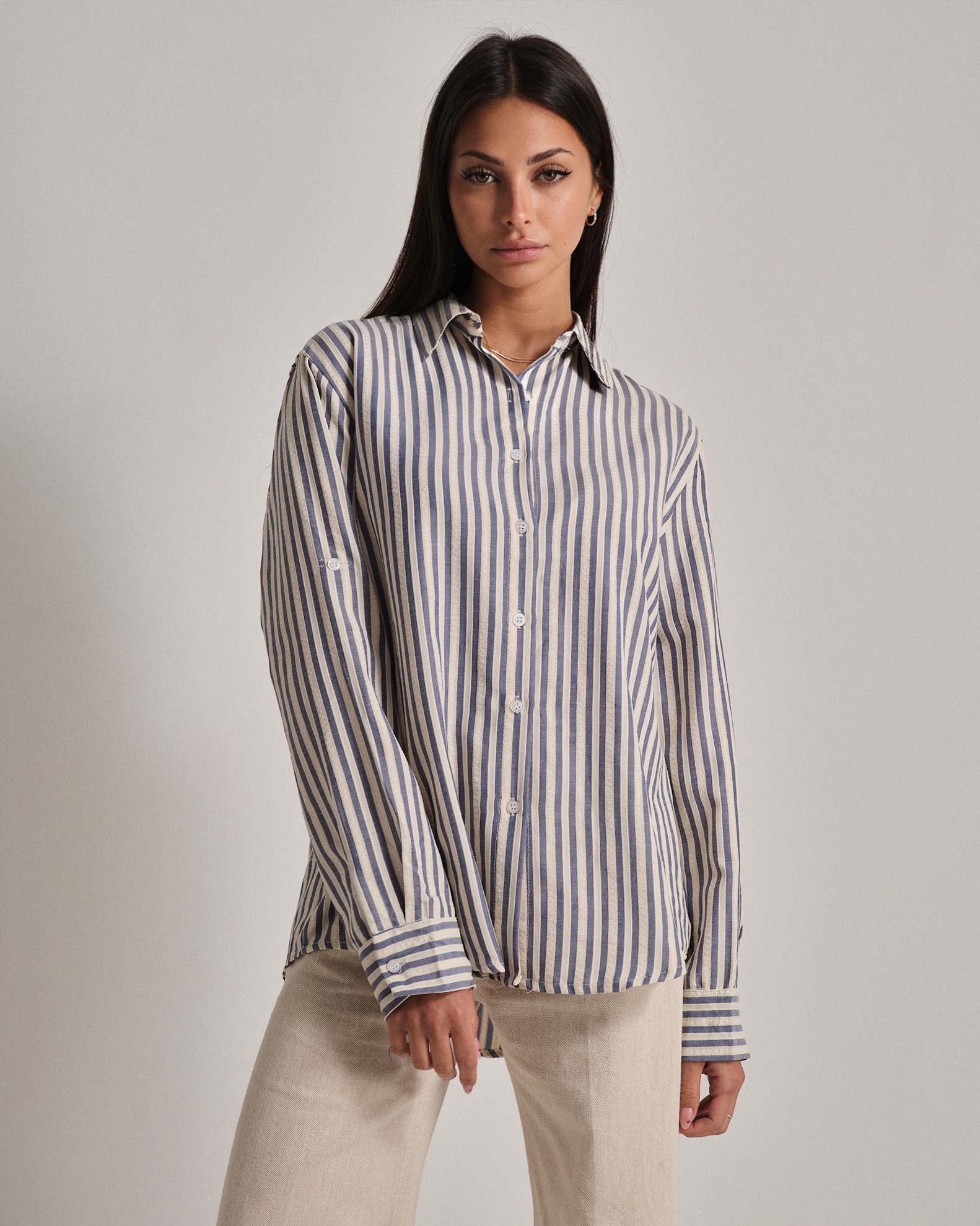 Camicia oversize in puro cotone a righe con colletto e bottoni.