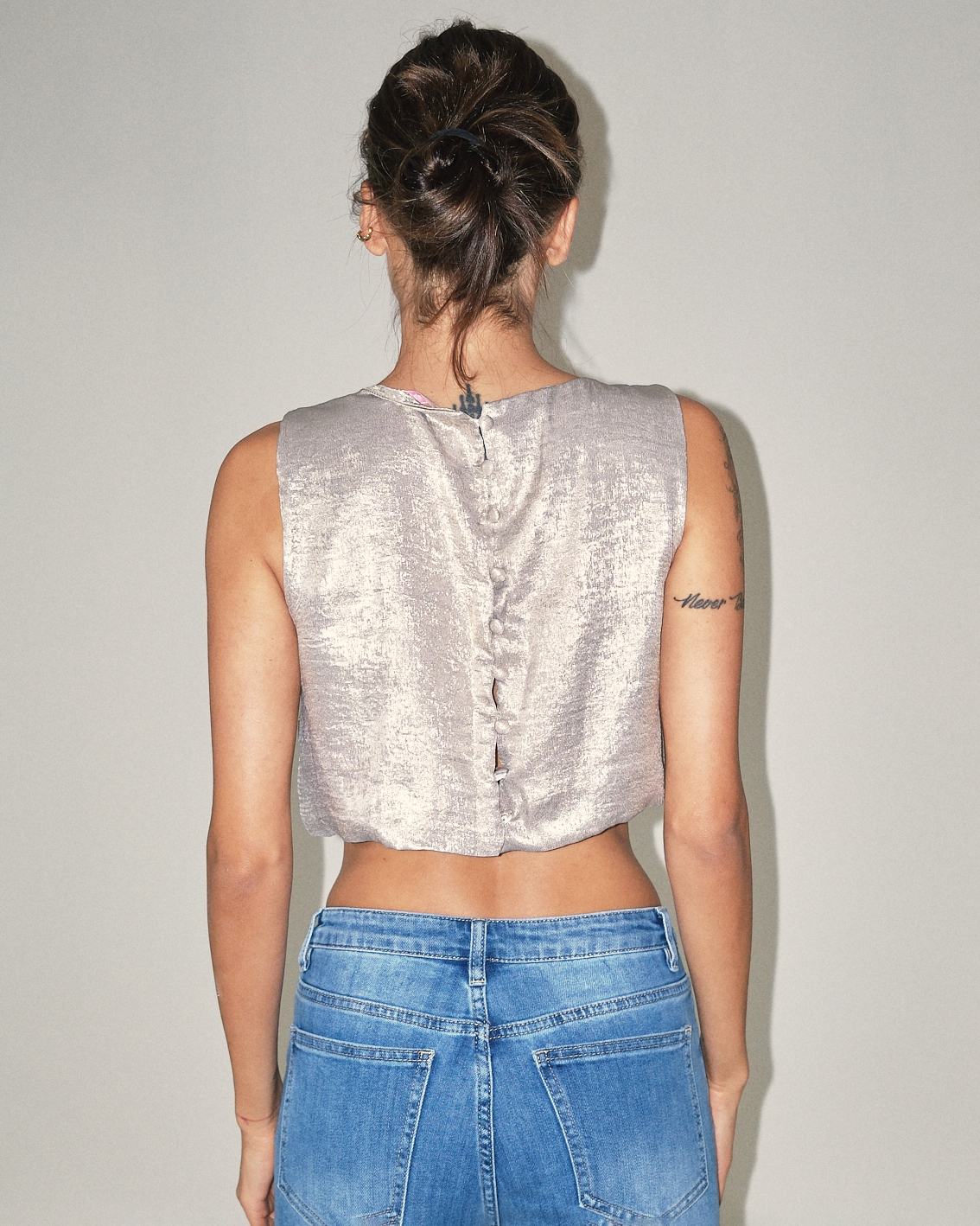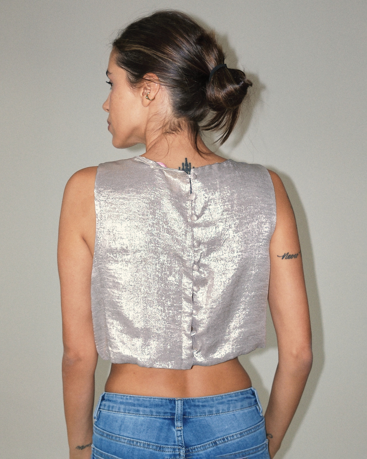 Canotta cropped in tessuto laminato con bottoncini in tessuto sul retro.