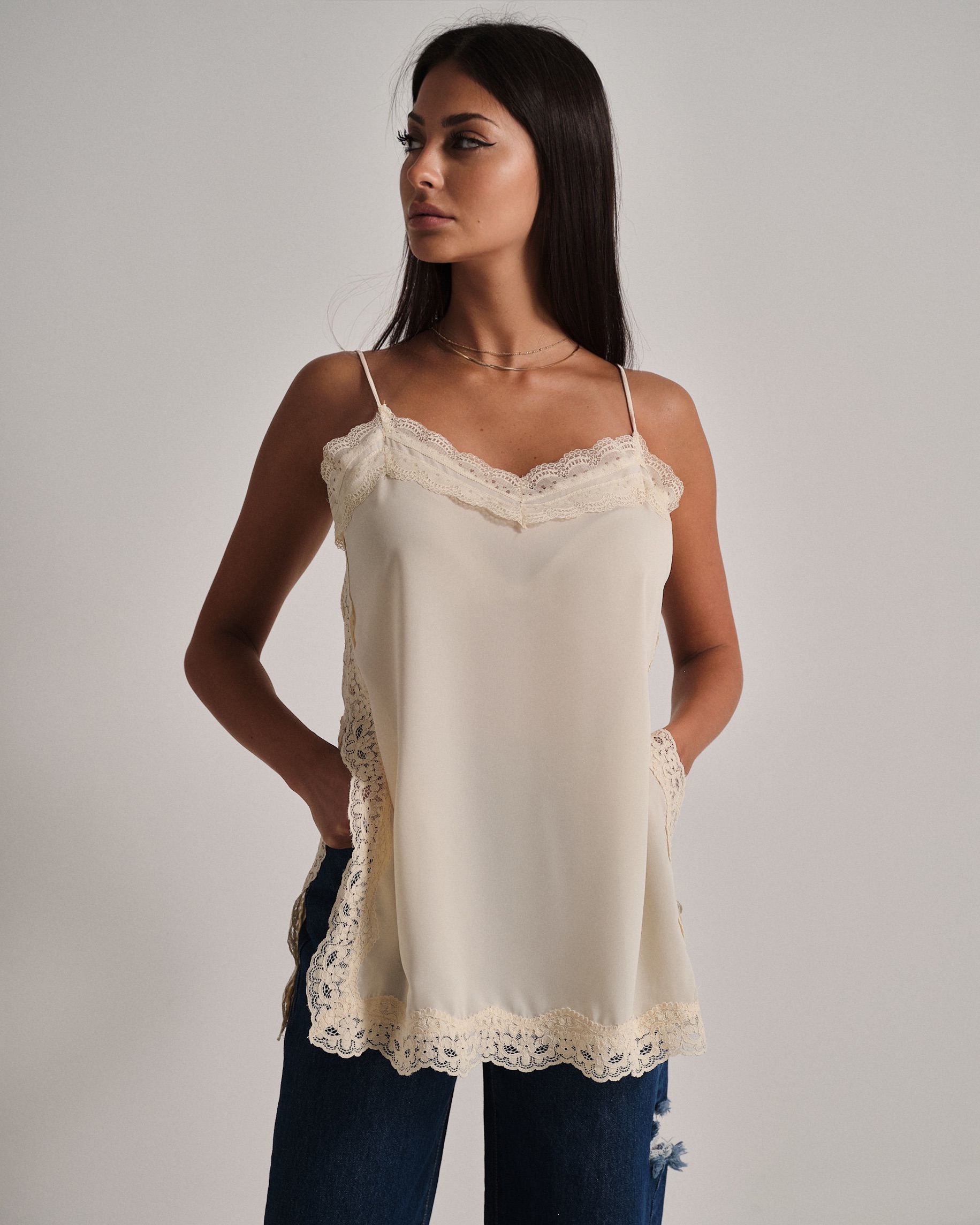 Canotta morbida in raso con spalline regolabili e bordi in pizzo ricamato.