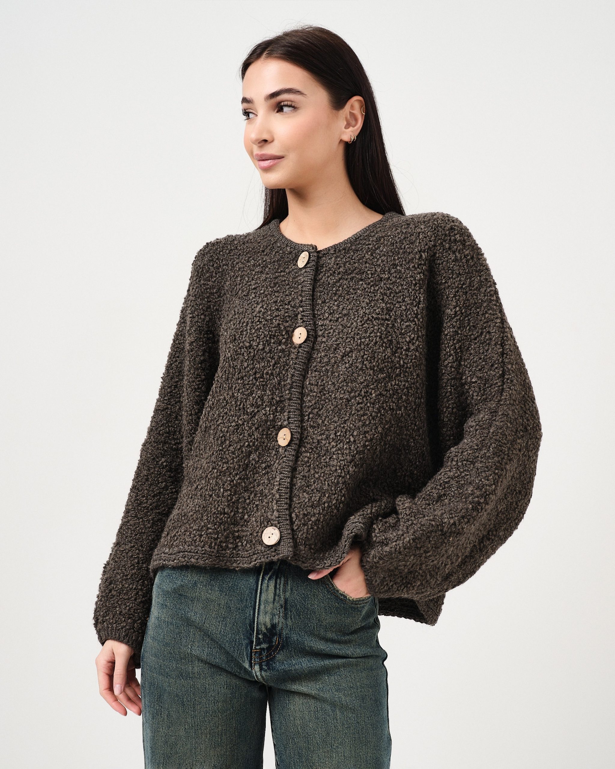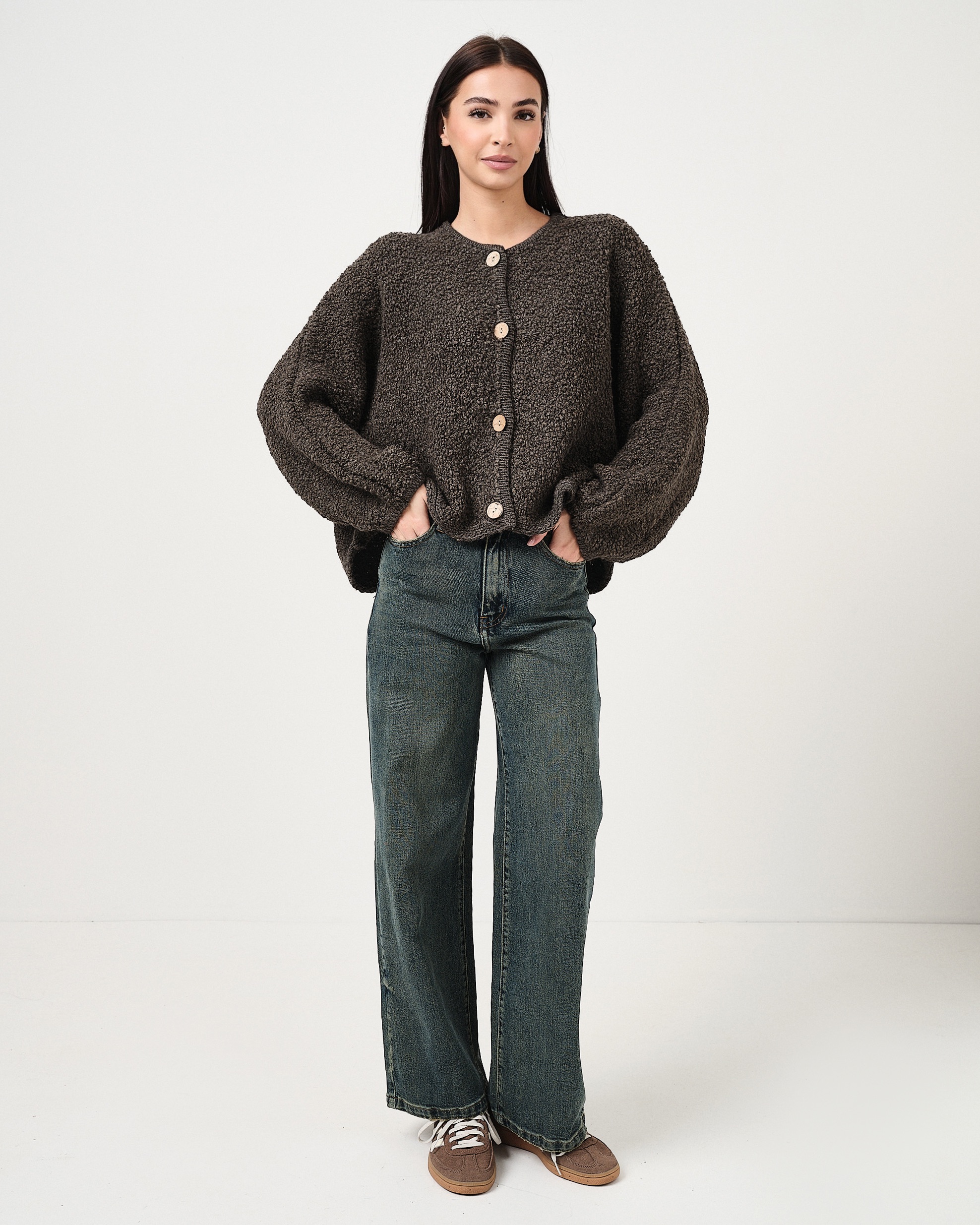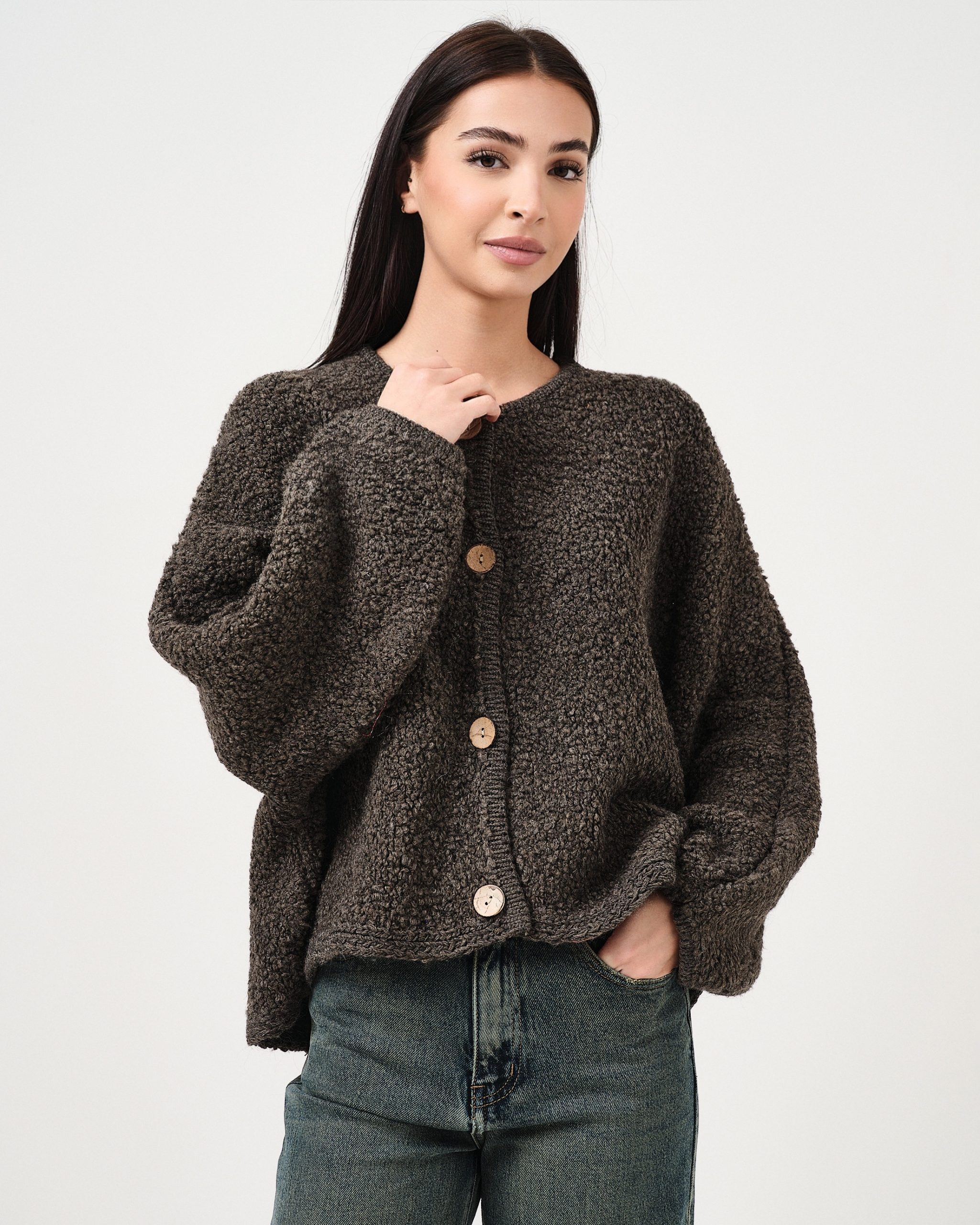Cardigan oversize soft touch in tessuto bouclé con bottoni e manica a palloncino.