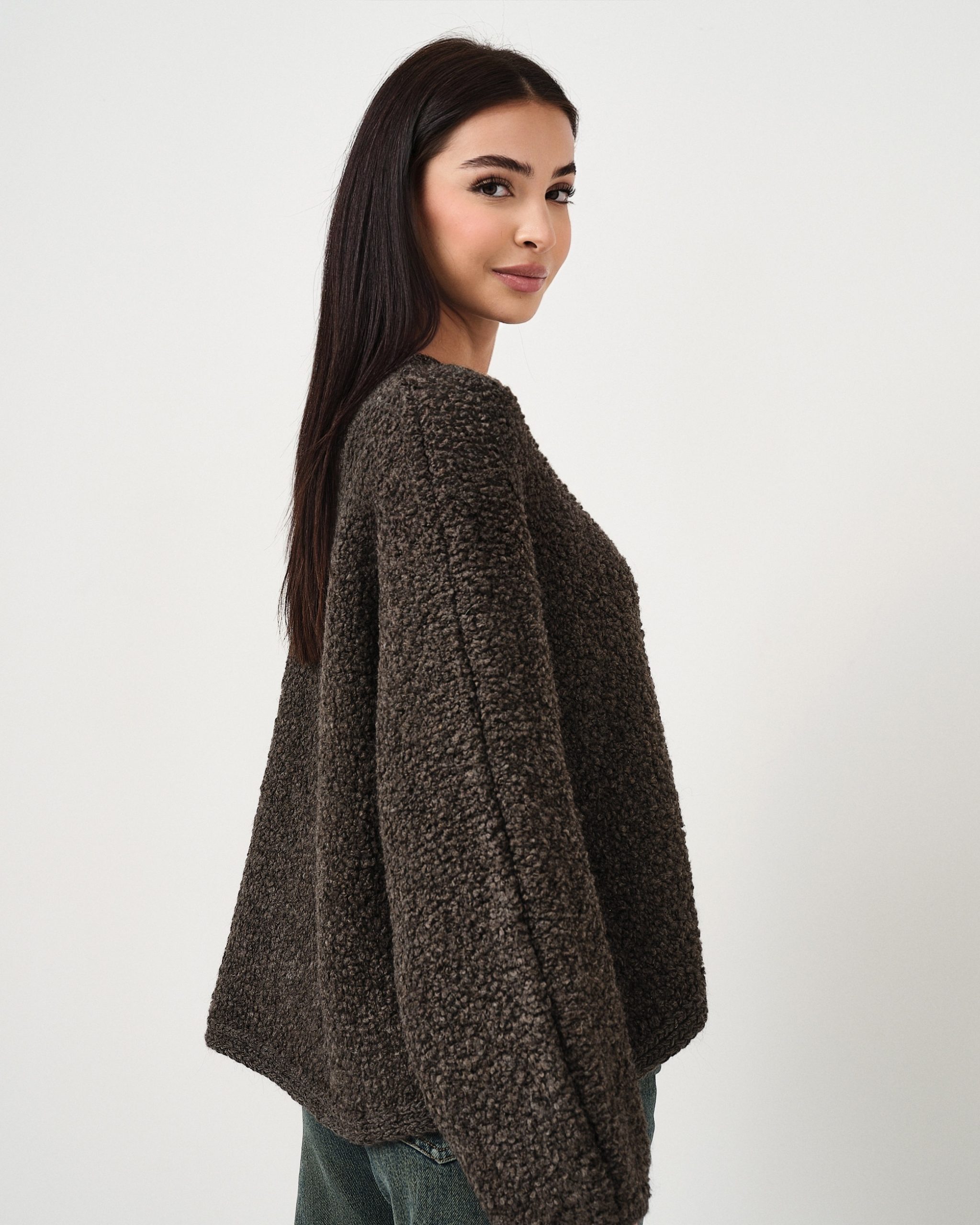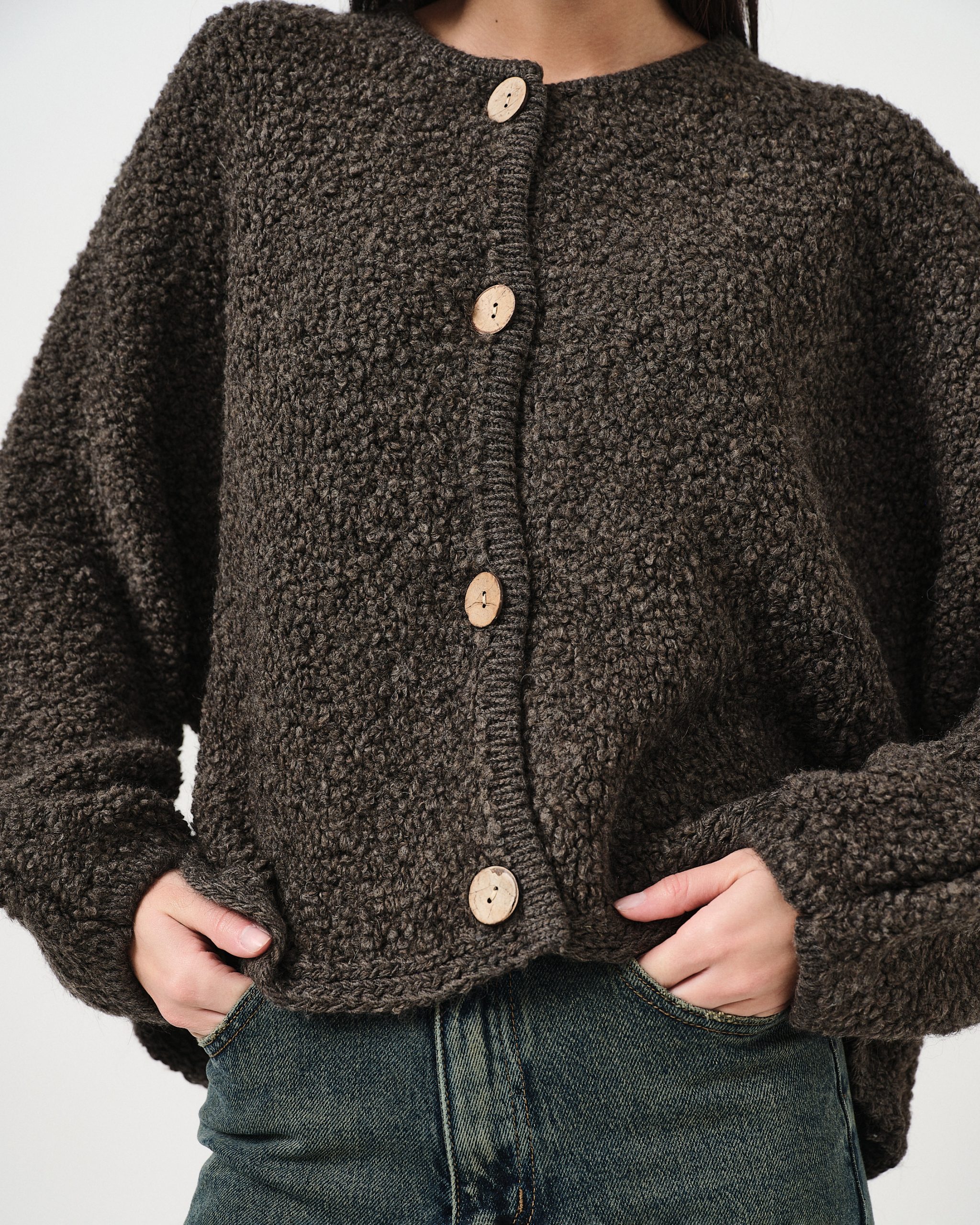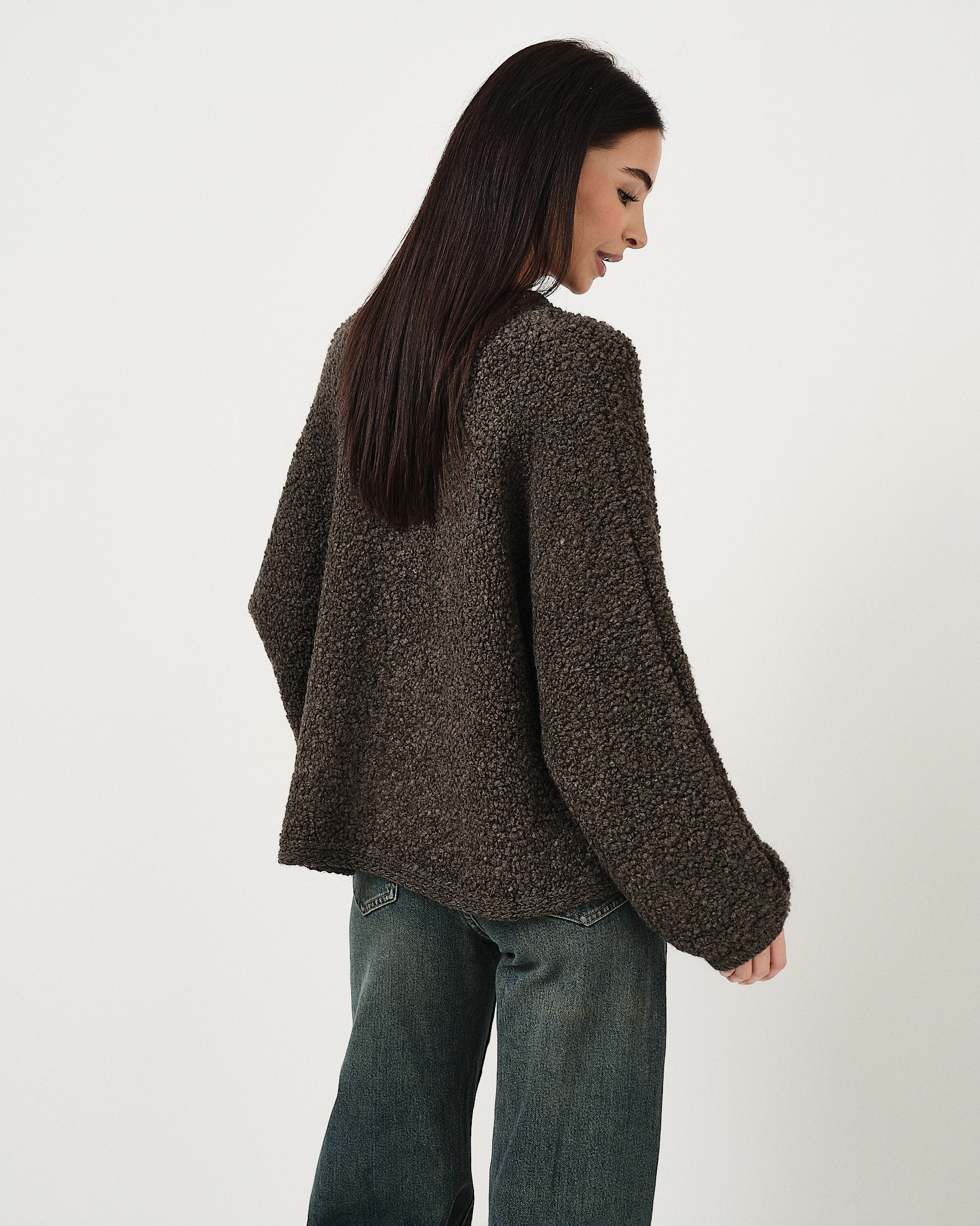 Cardigan oversize soft touch in tessuto bouclé con bottoni e manica a palloncino.