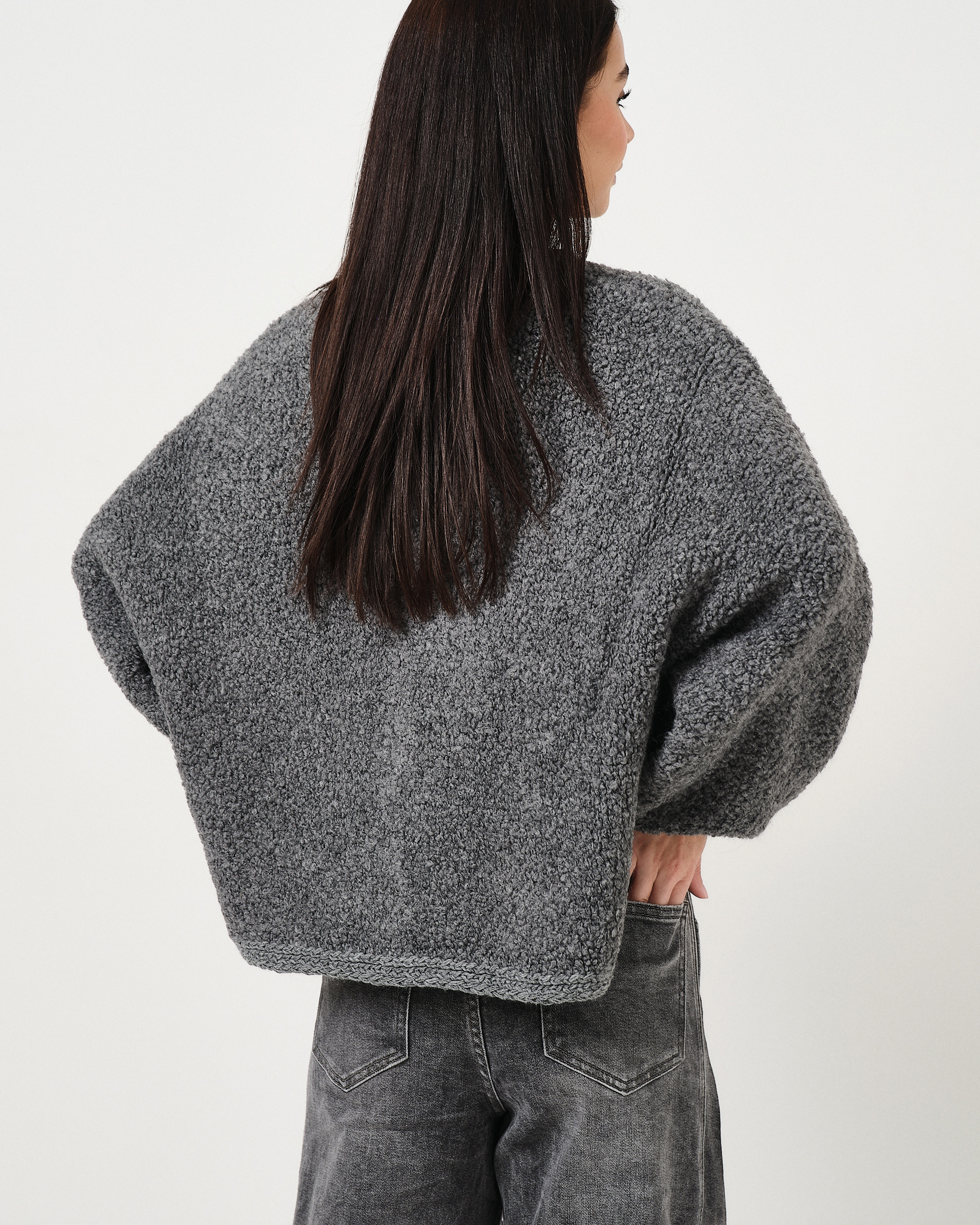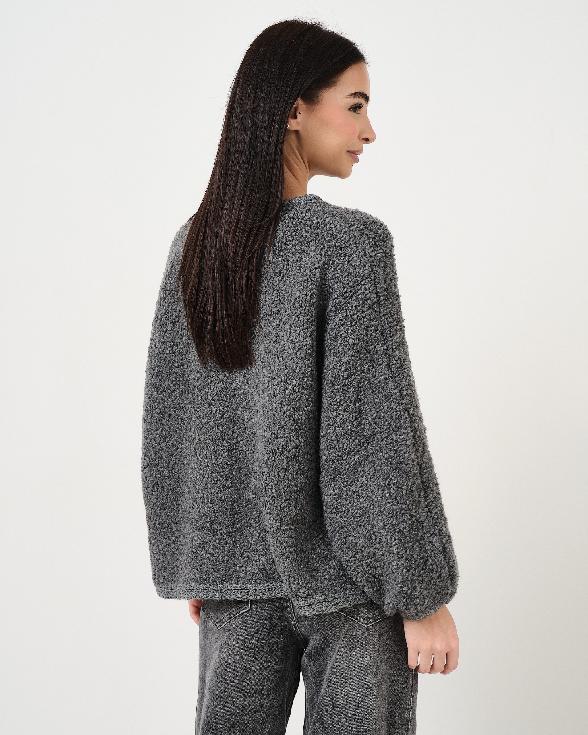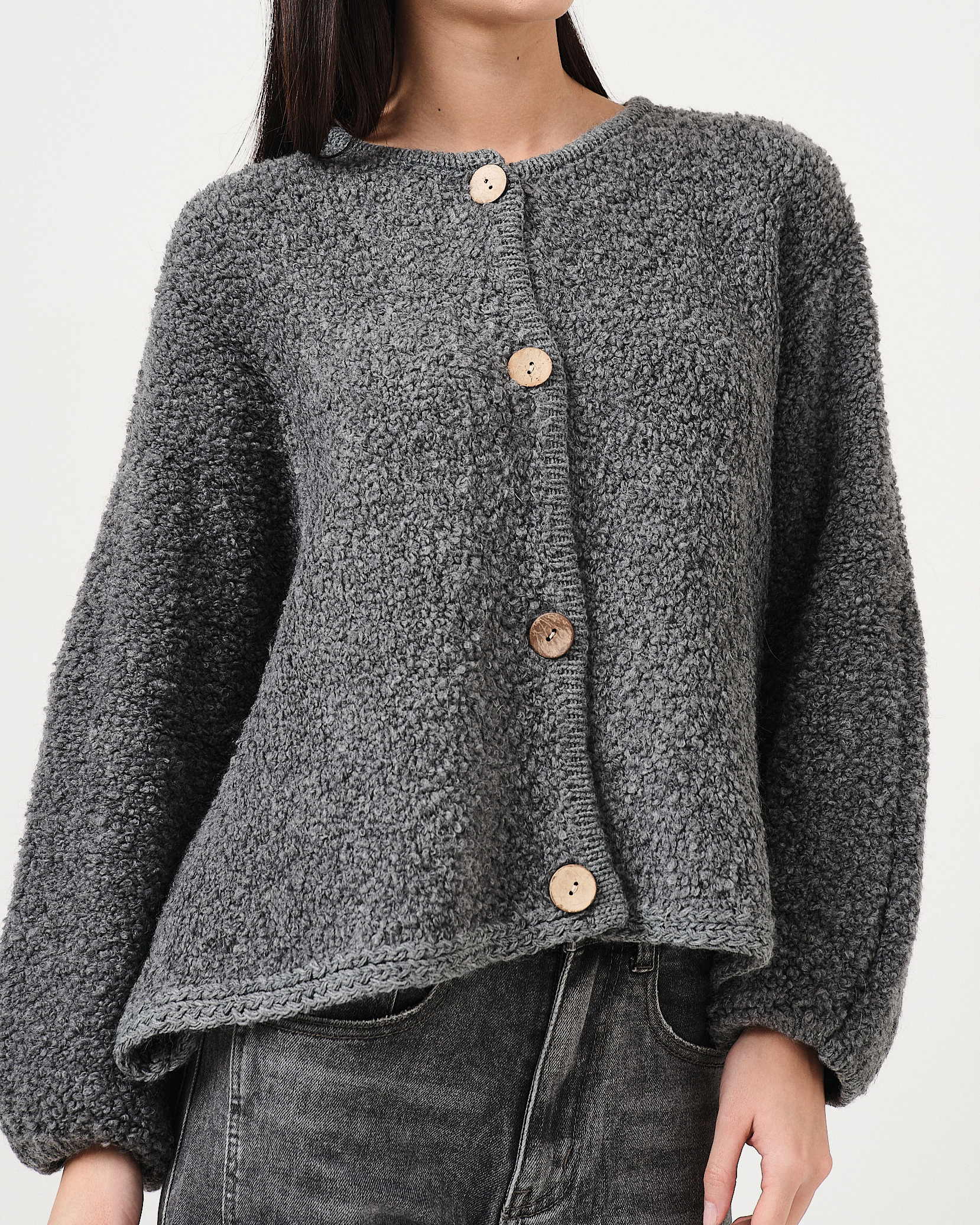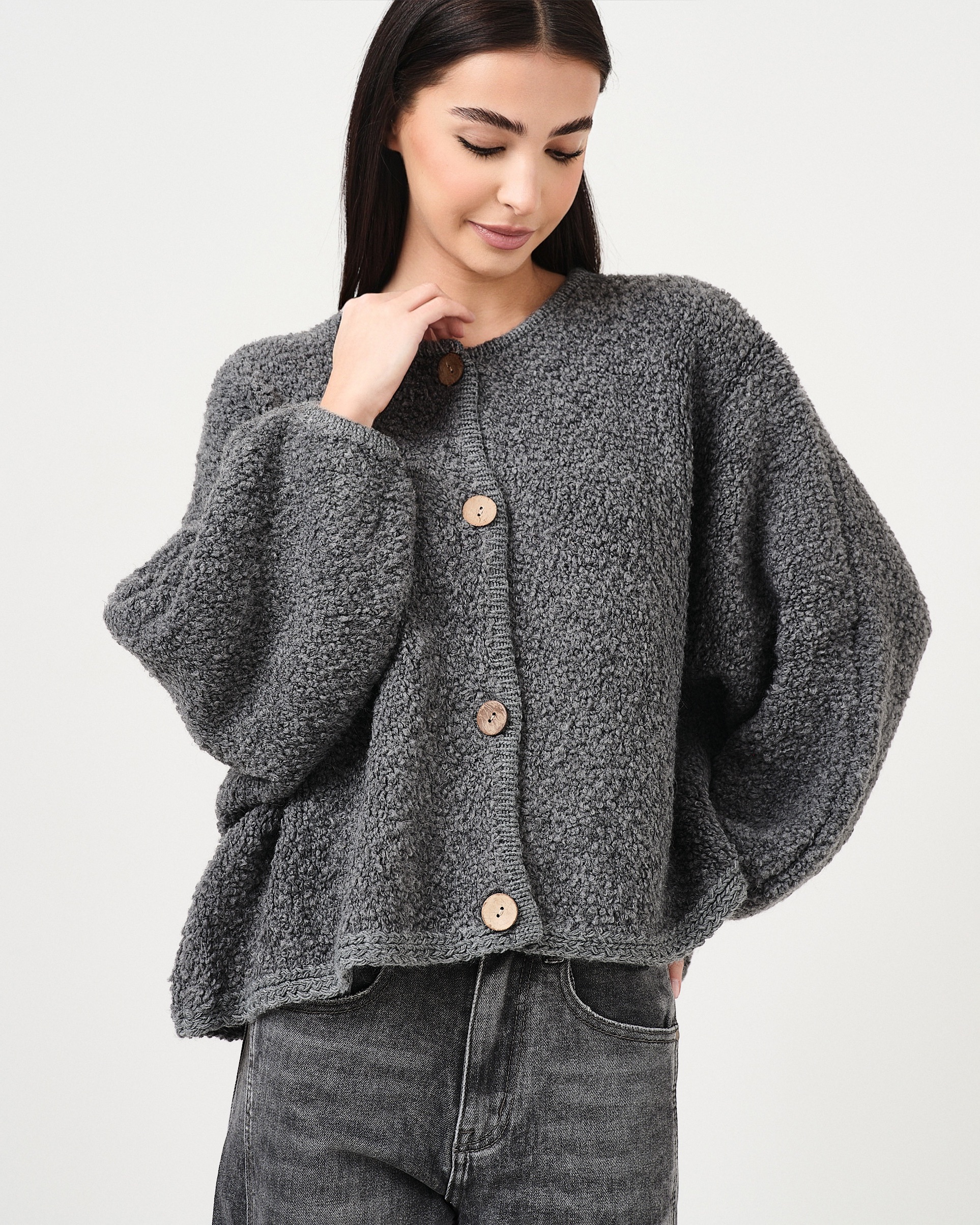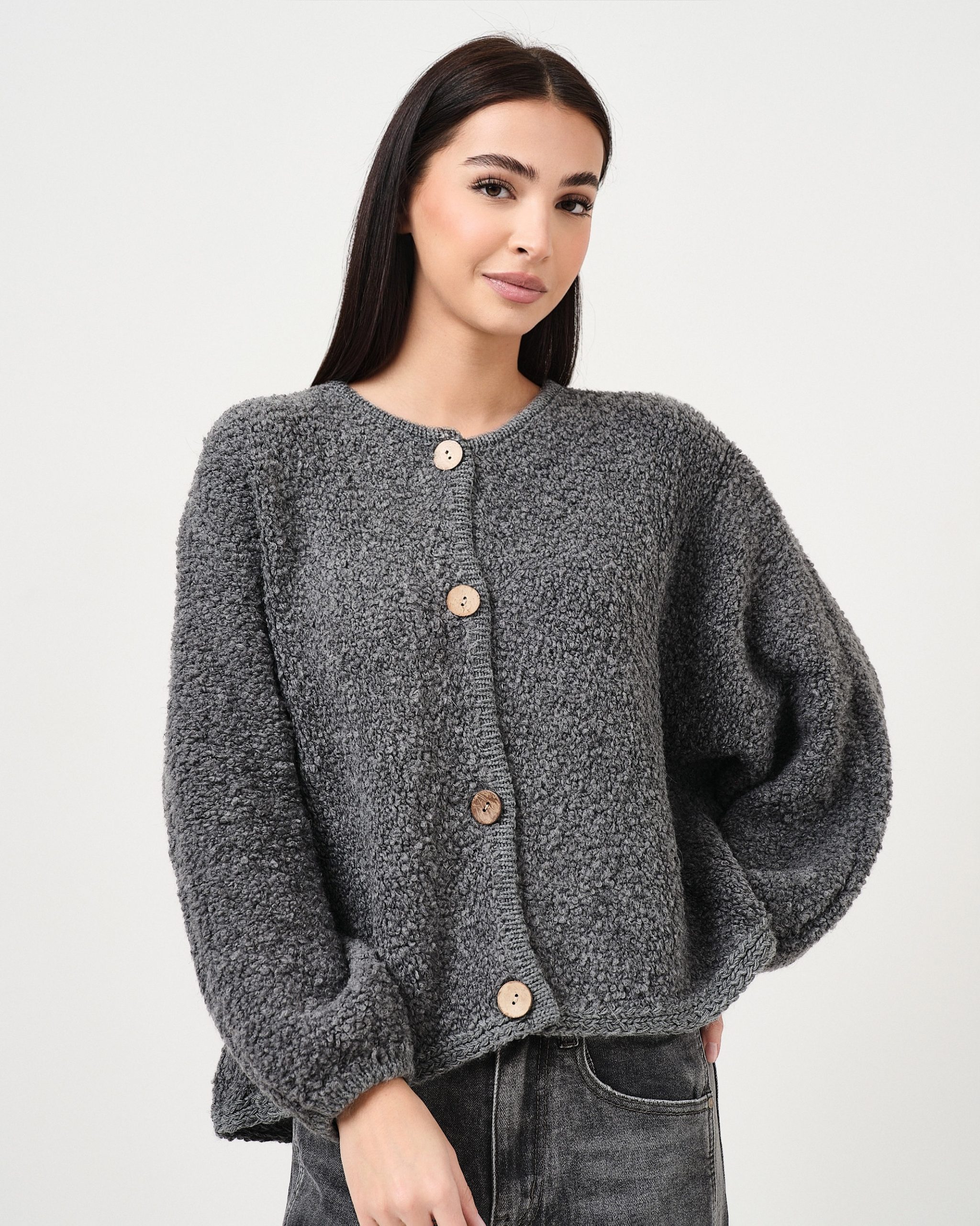 Cardigan oversize soft touch in tessuto bouclé con bottoni e manica a palloncino.