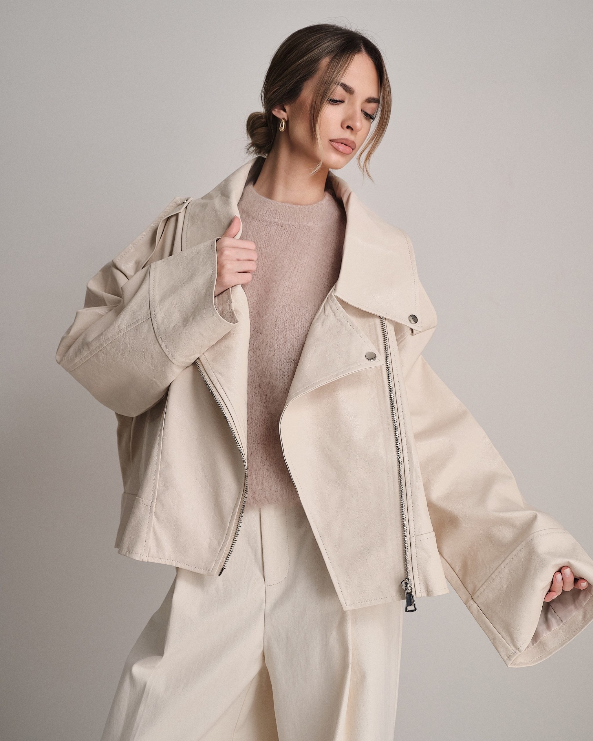 Giaccone in ecopelle oversize con zip, bottoni e manica ampia.