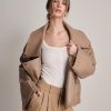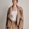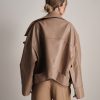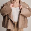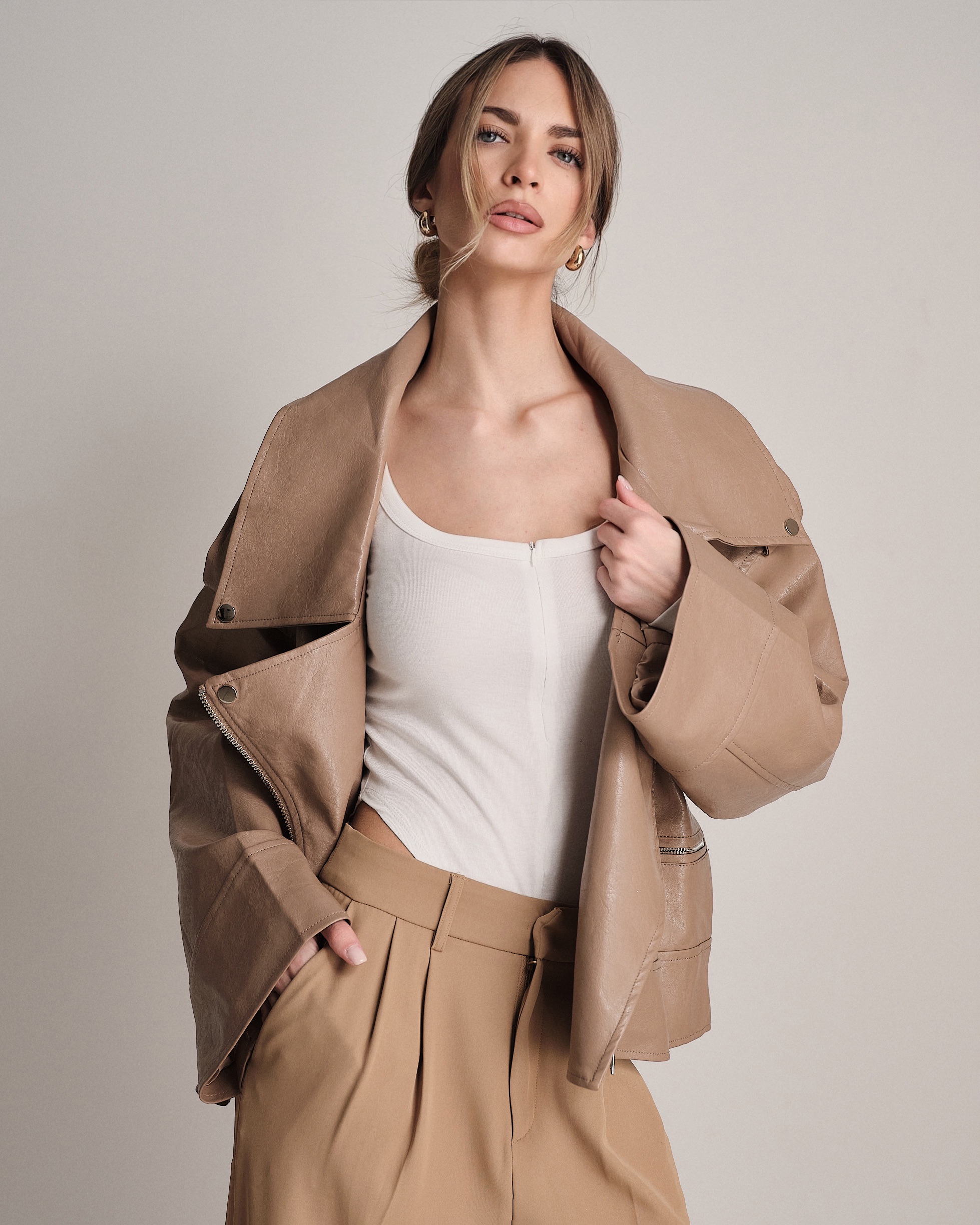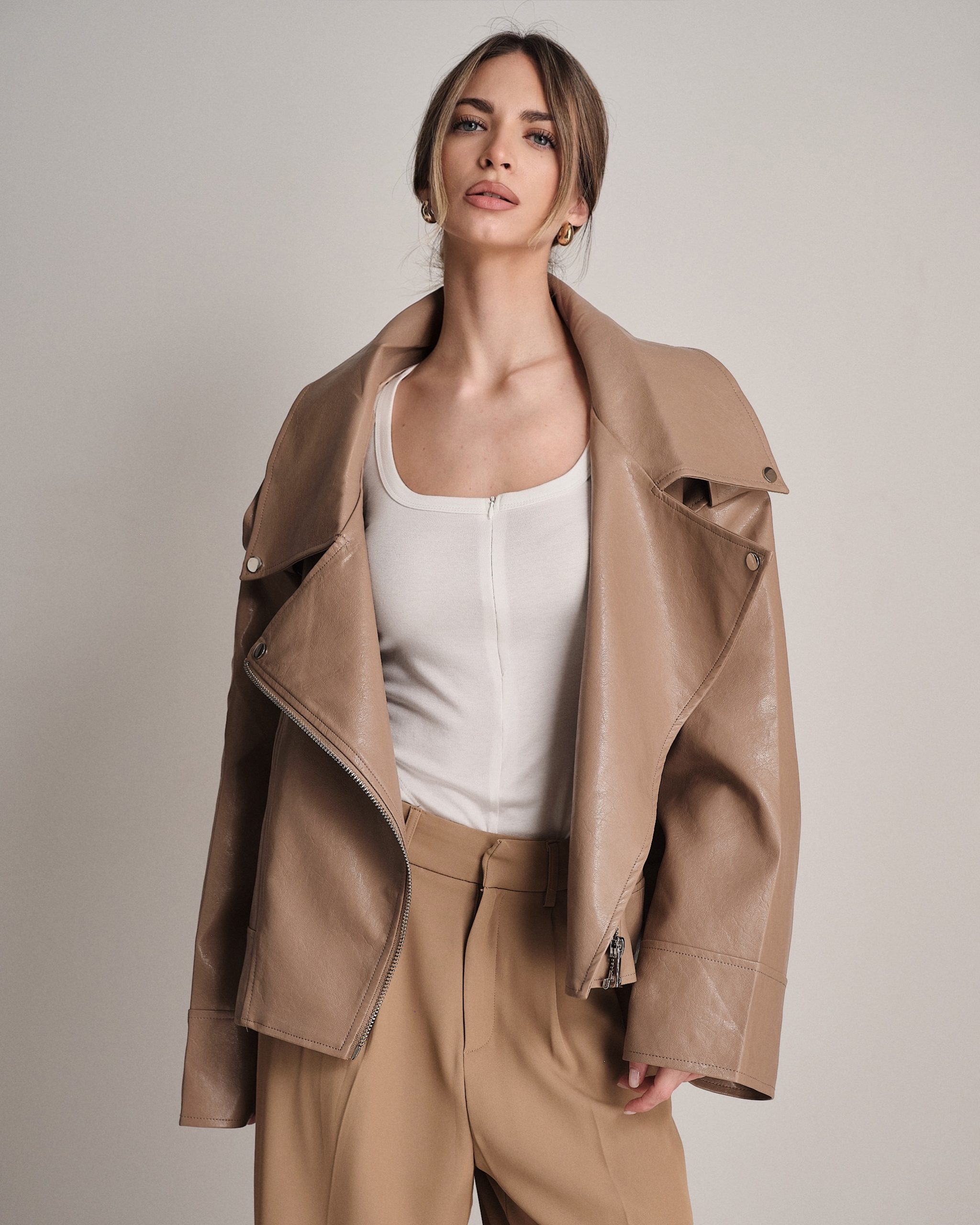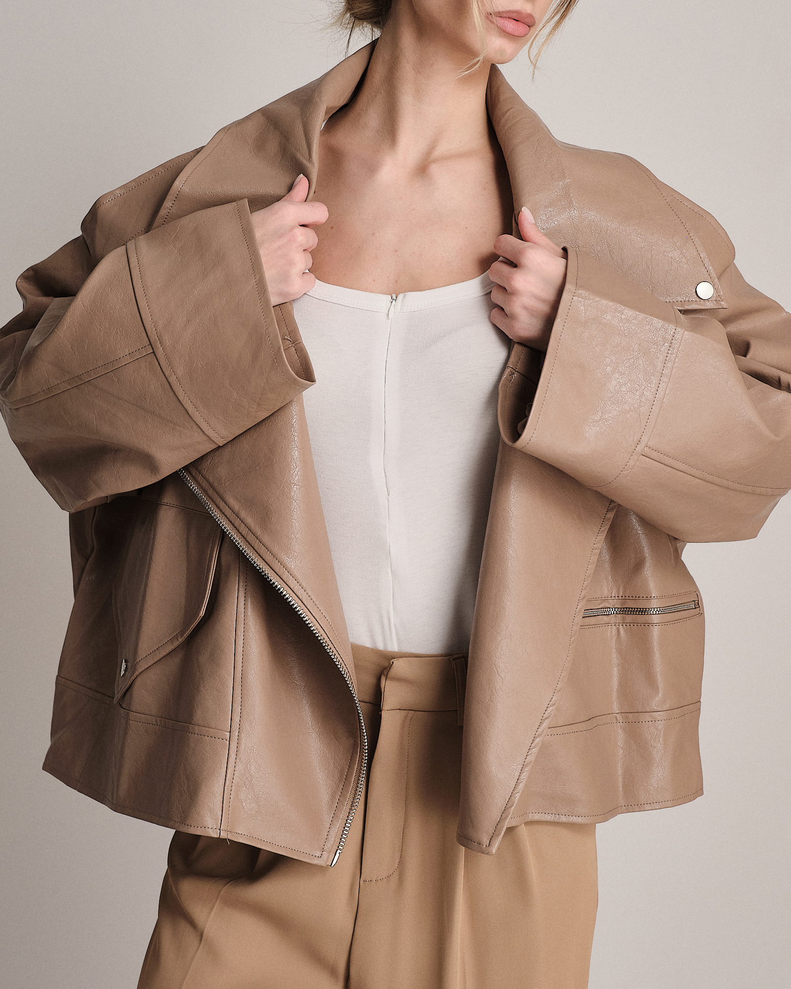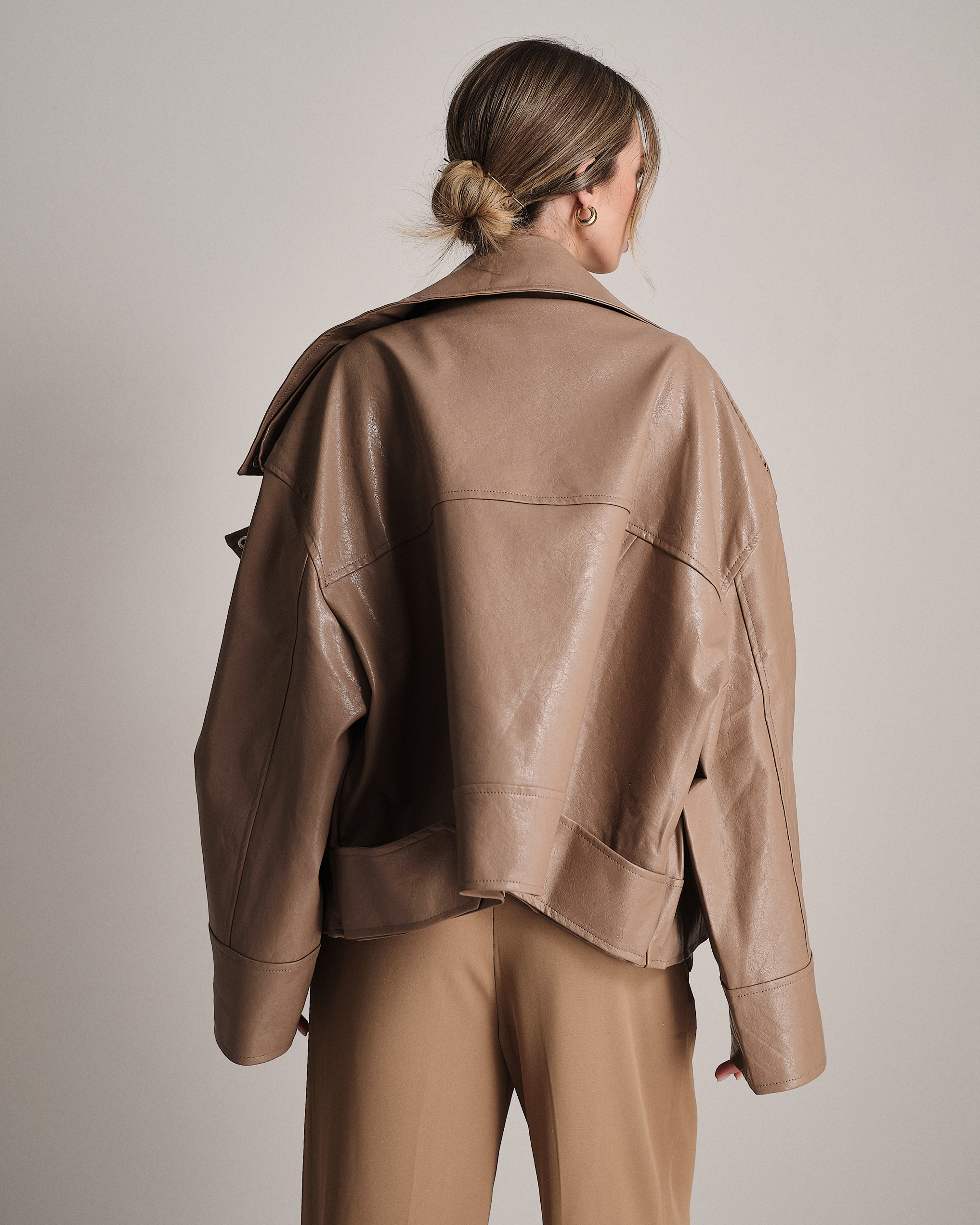 Giaccone in ecopelle oversize con zip, bottoni e manica ampia.