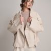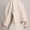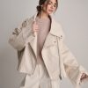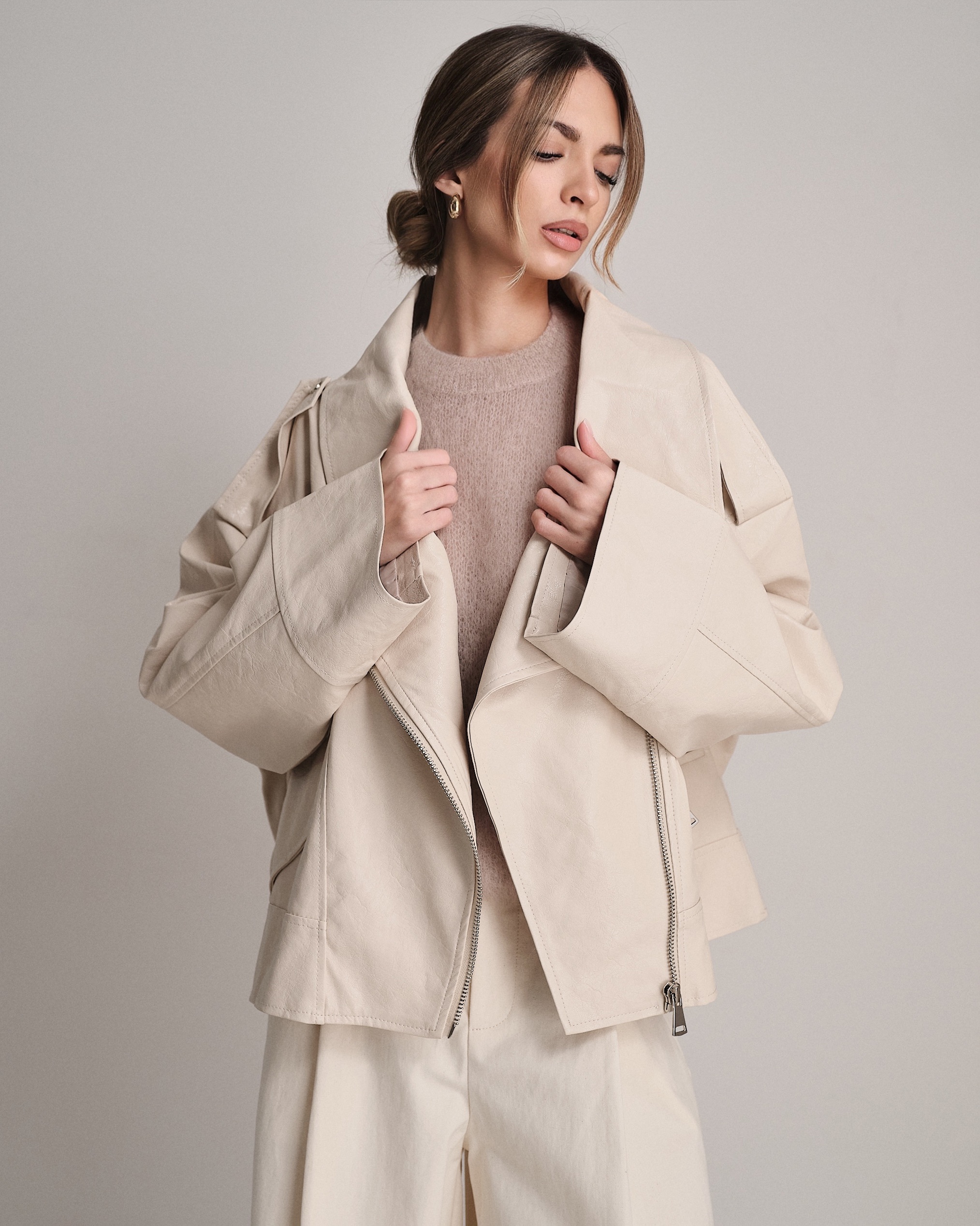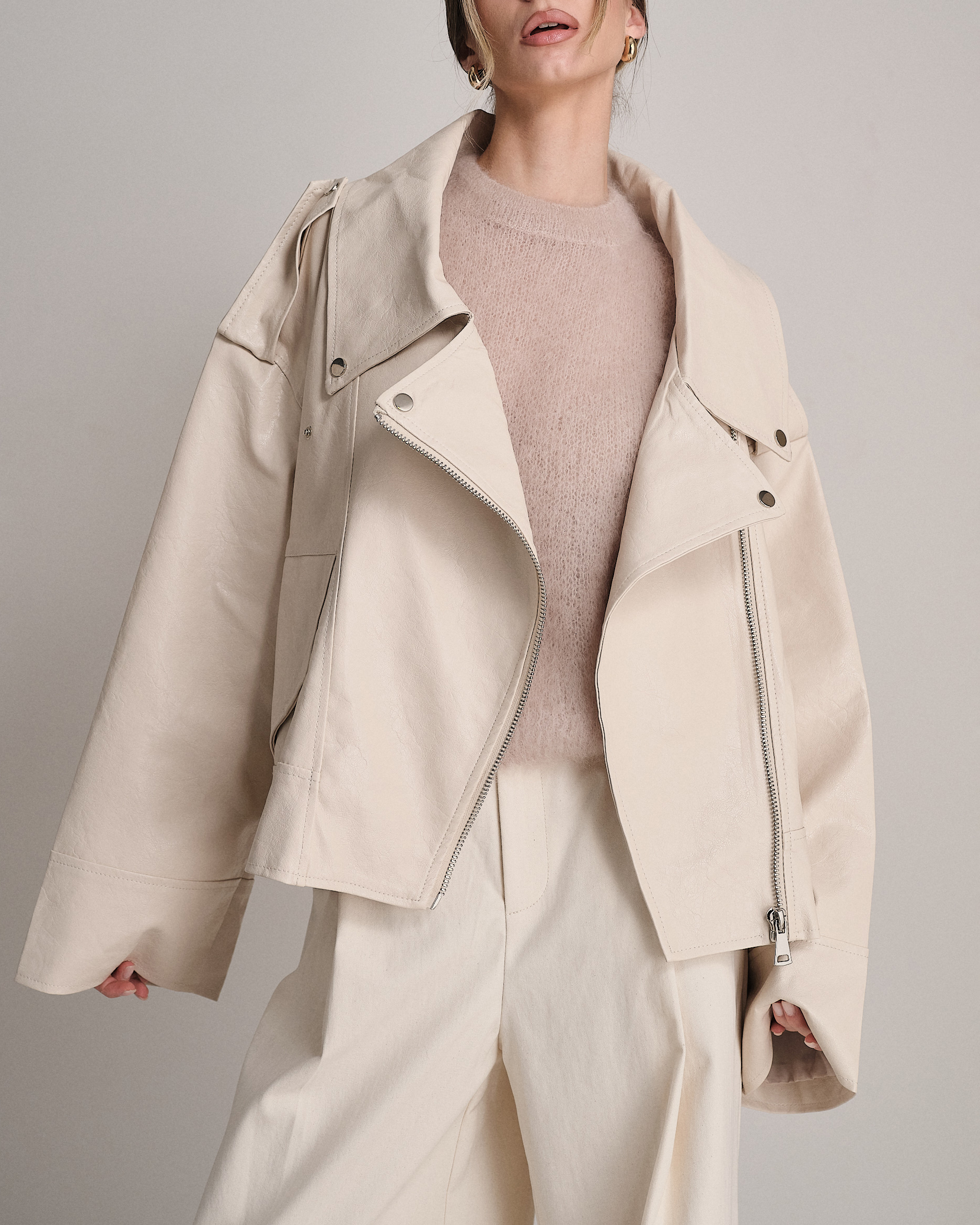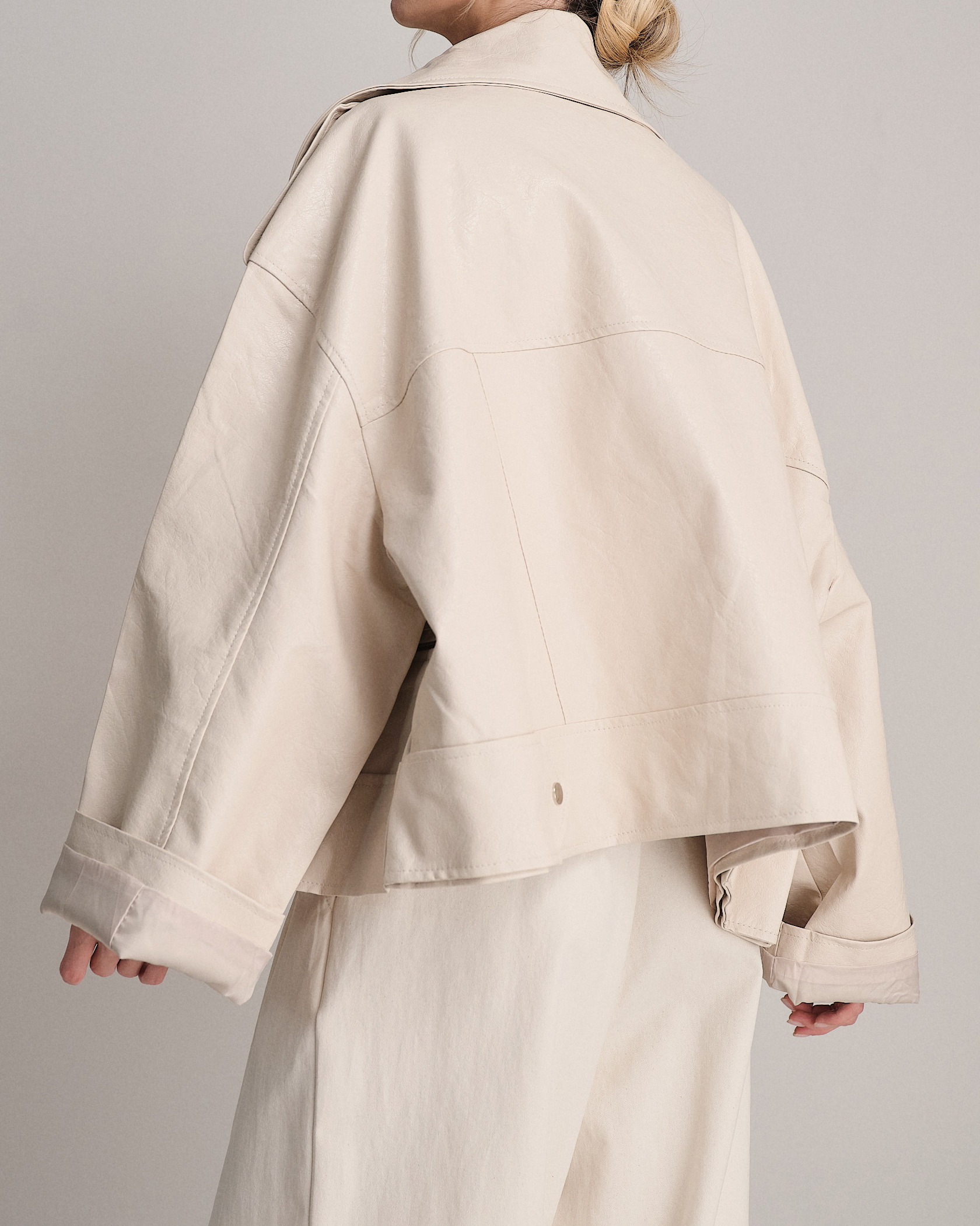 Giaccone in ecopelle oversize con zip, bottoni e manica ampia.