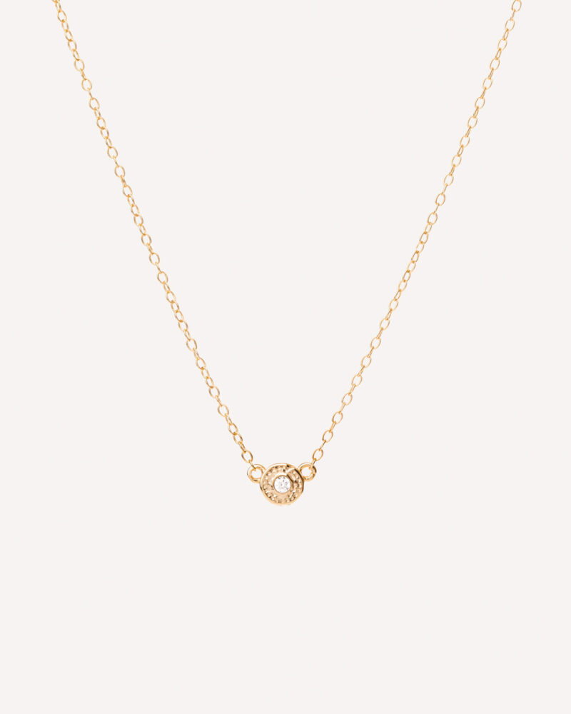 Girocollo con pendente lavorato a mano e zircone bianco incastonato. Chiusura con moschettone.