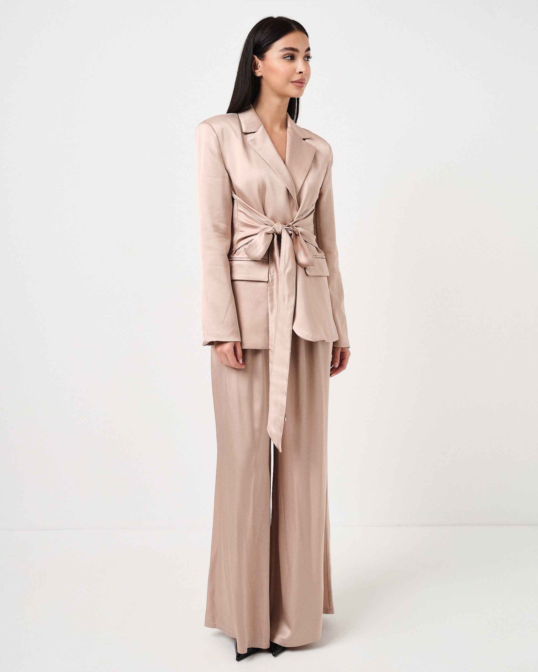 Tailleur in raso con pantalone ampio e blazer in figura con tasche e chiusura con fusciacca.