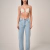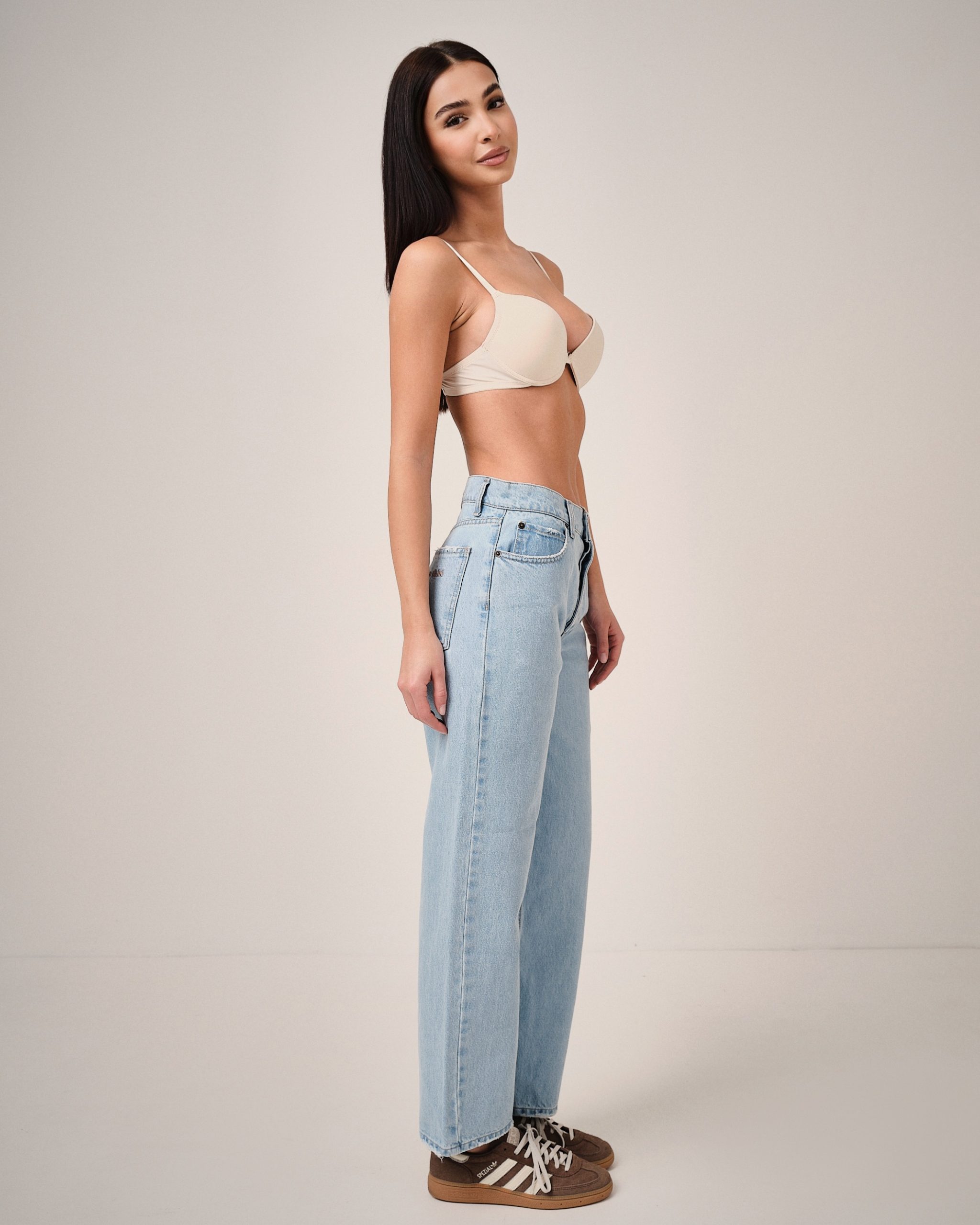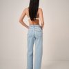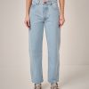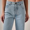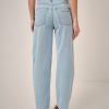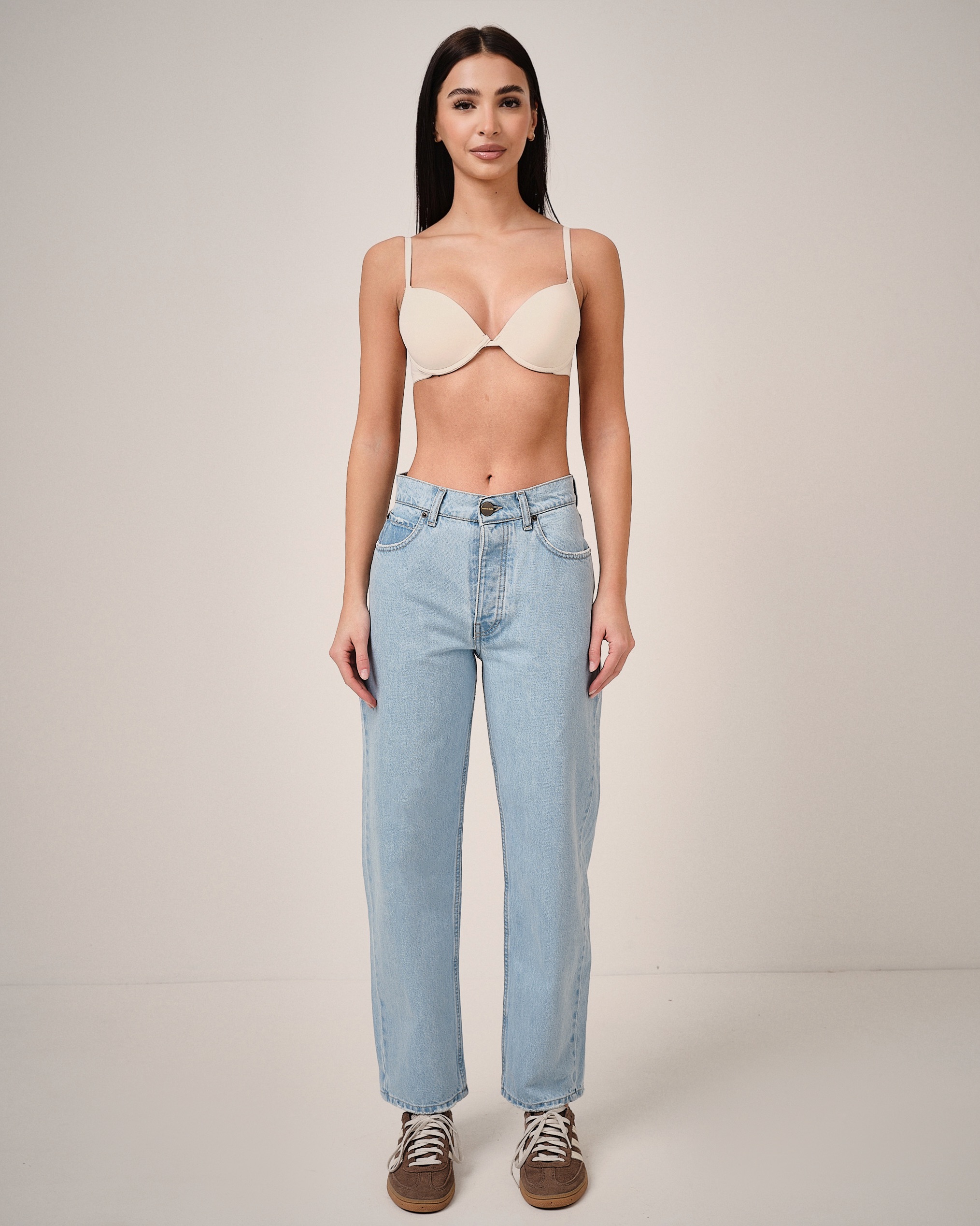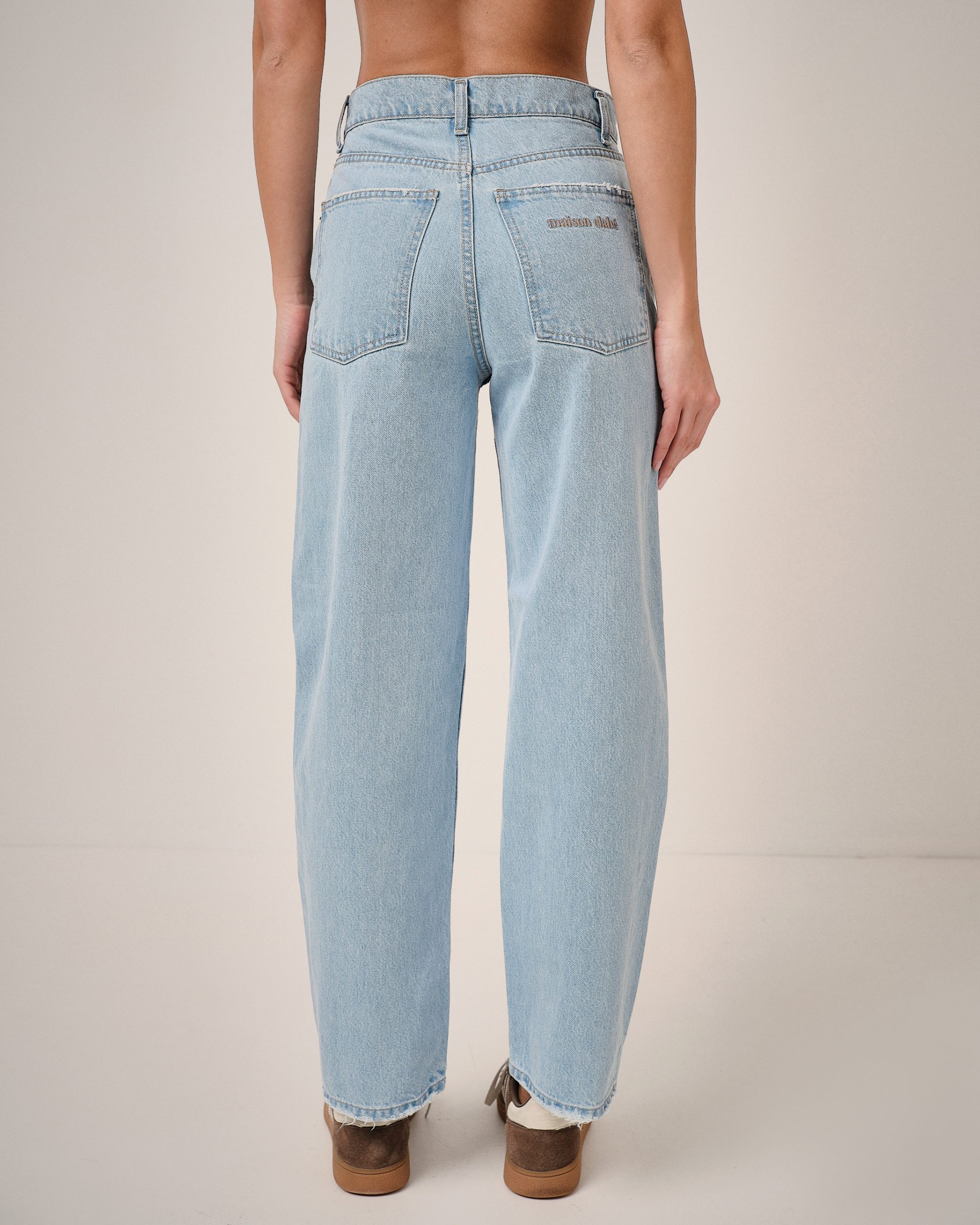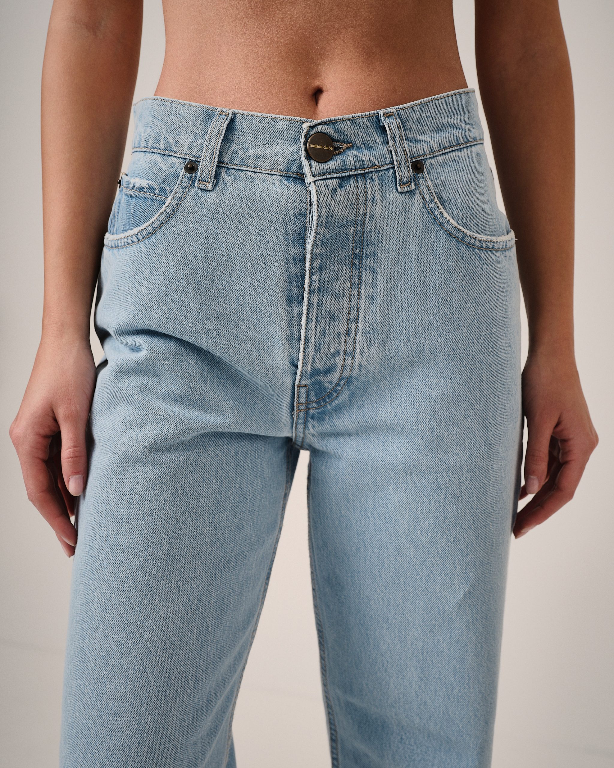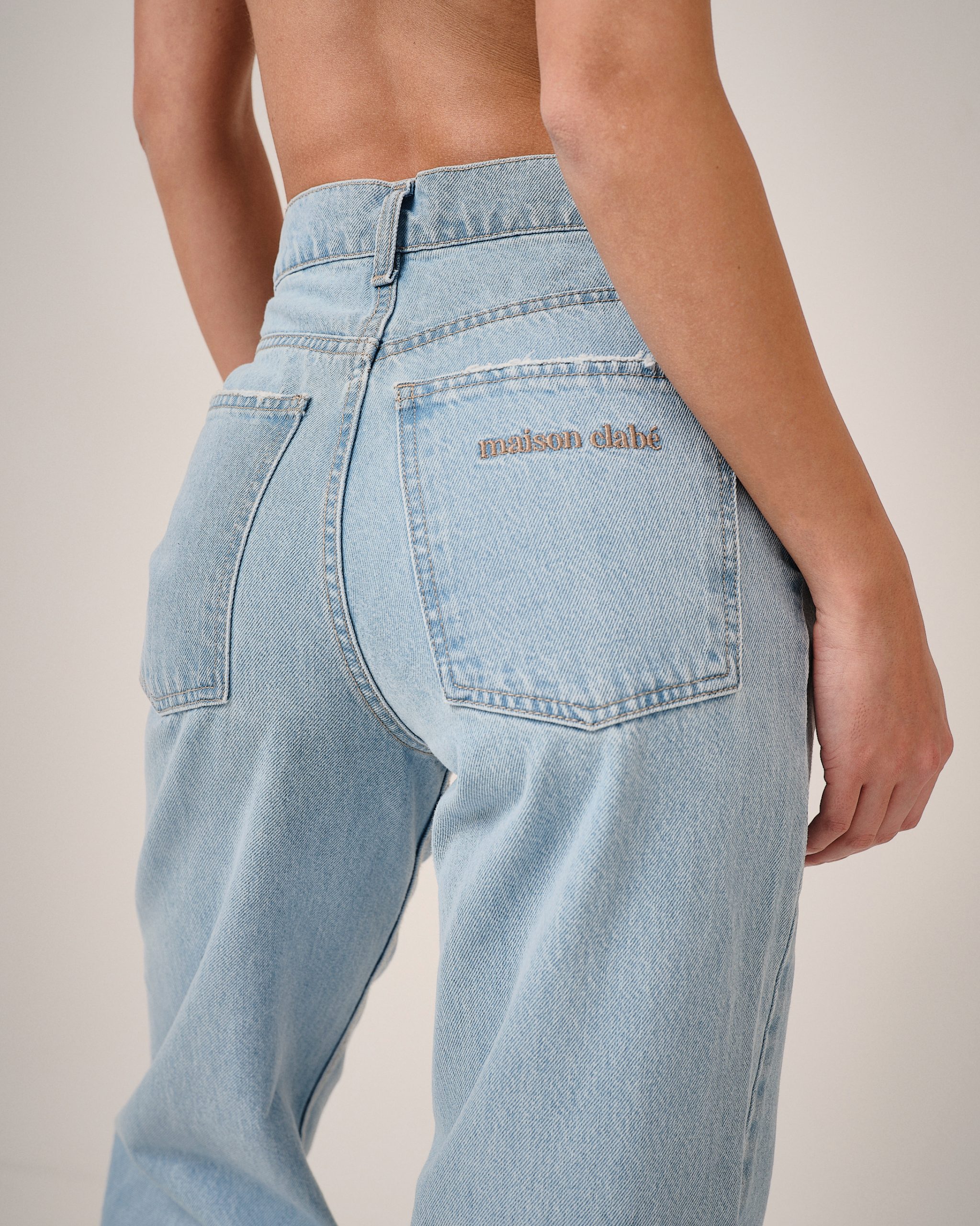 Denim a vita alta modello piombo a gamba dritta, chiusura con bottoni a scomparsa e ricamo “Maison Clabé” a contrasto sul retro. Lavaggio used.