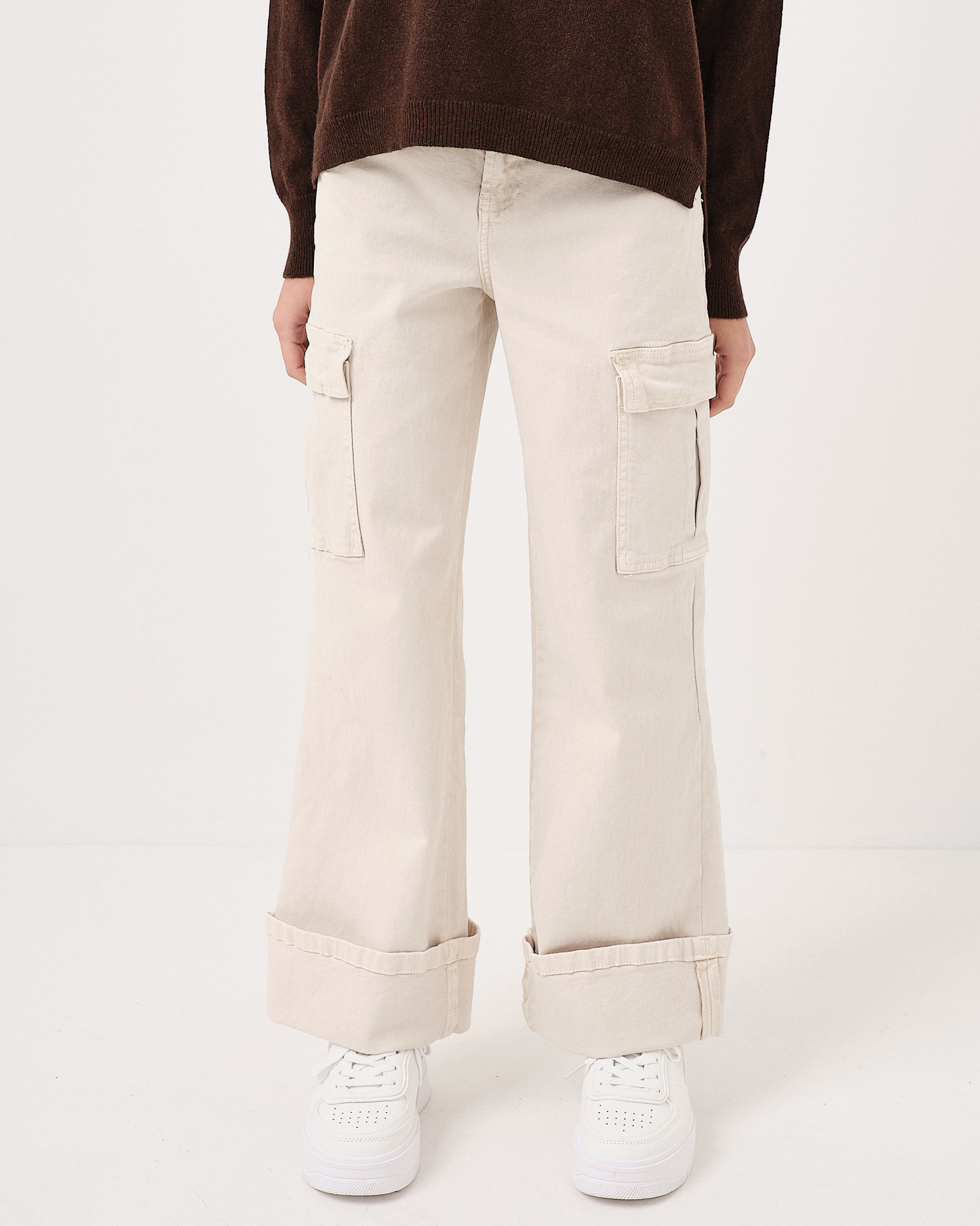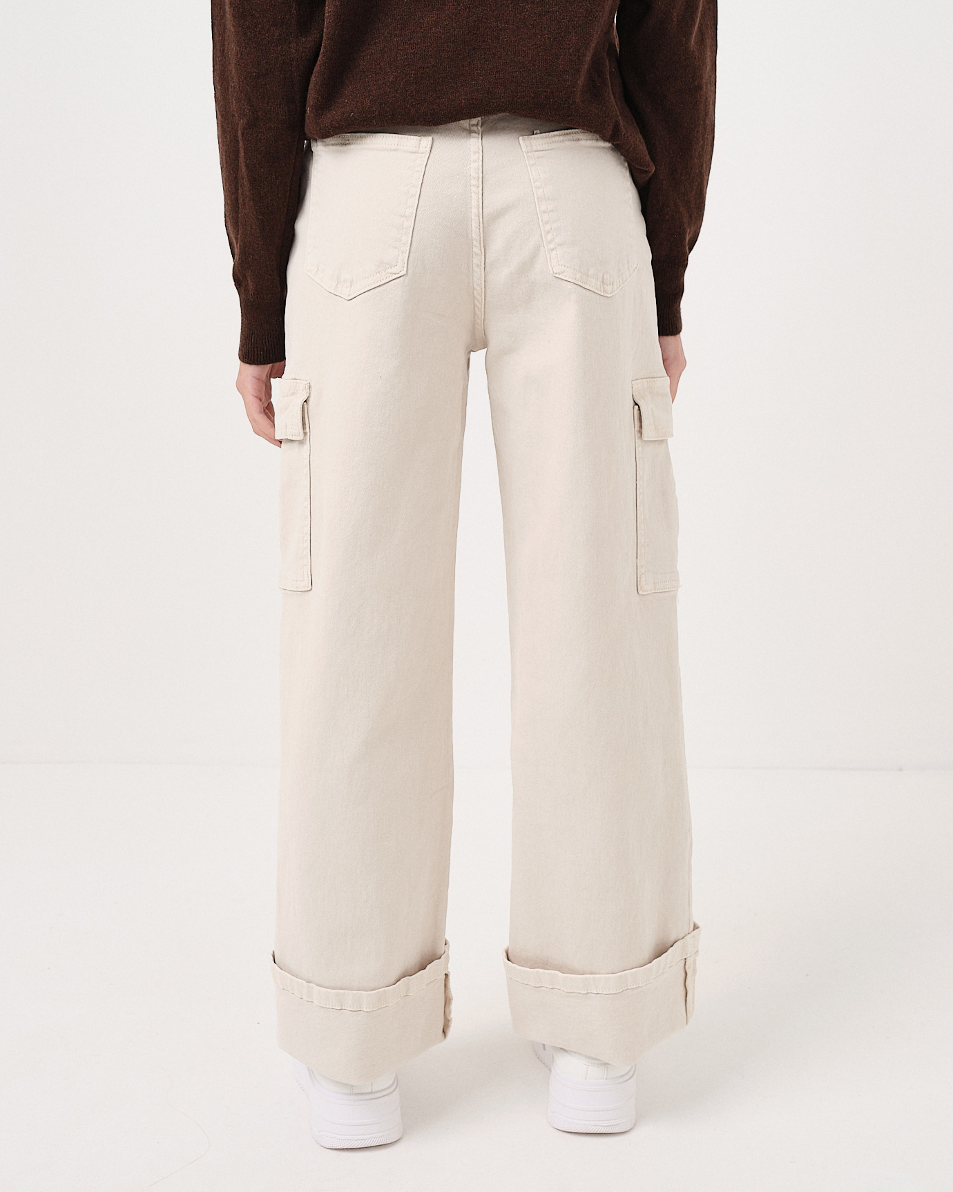 Pantalone in denim a vita alta elasticizzato con tasche laterali e balze.
