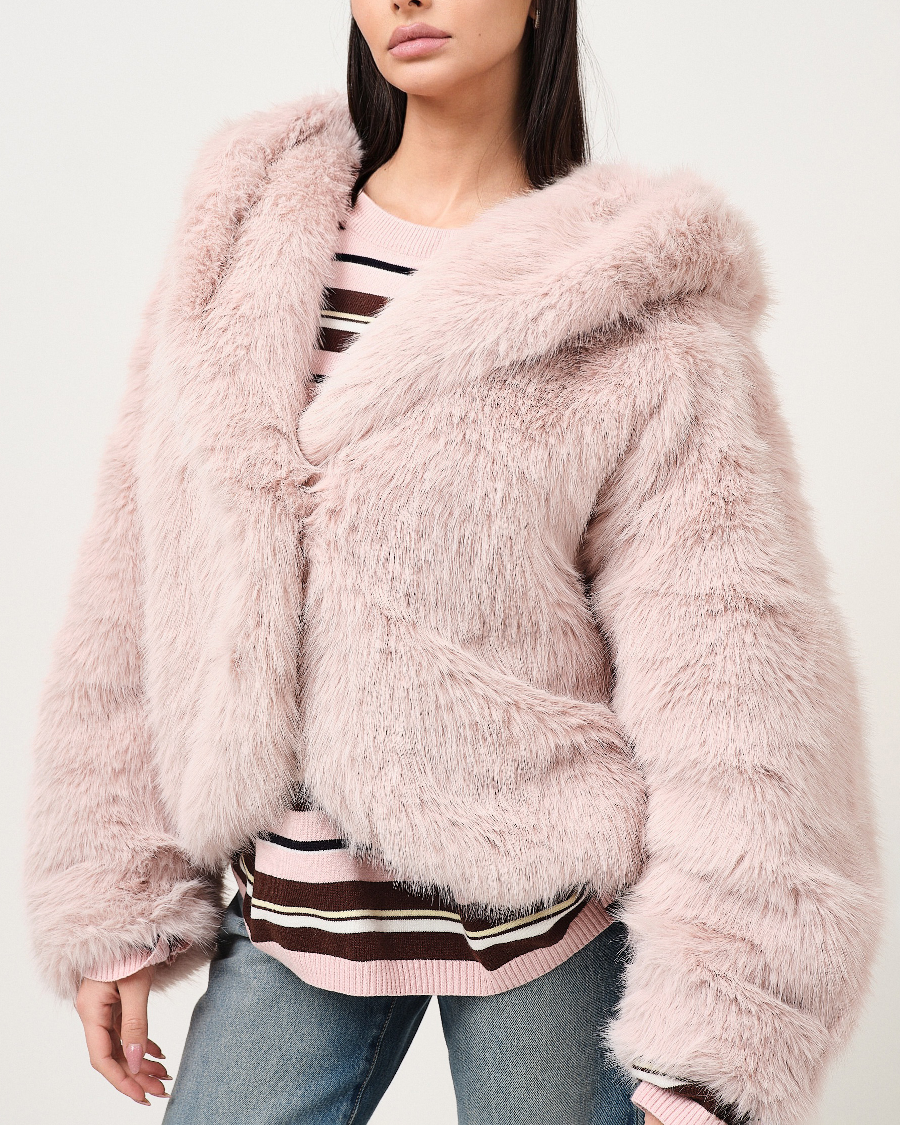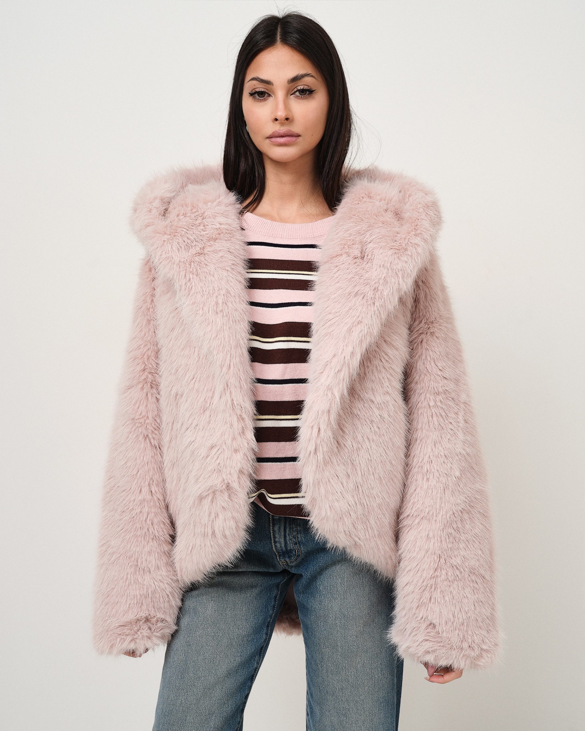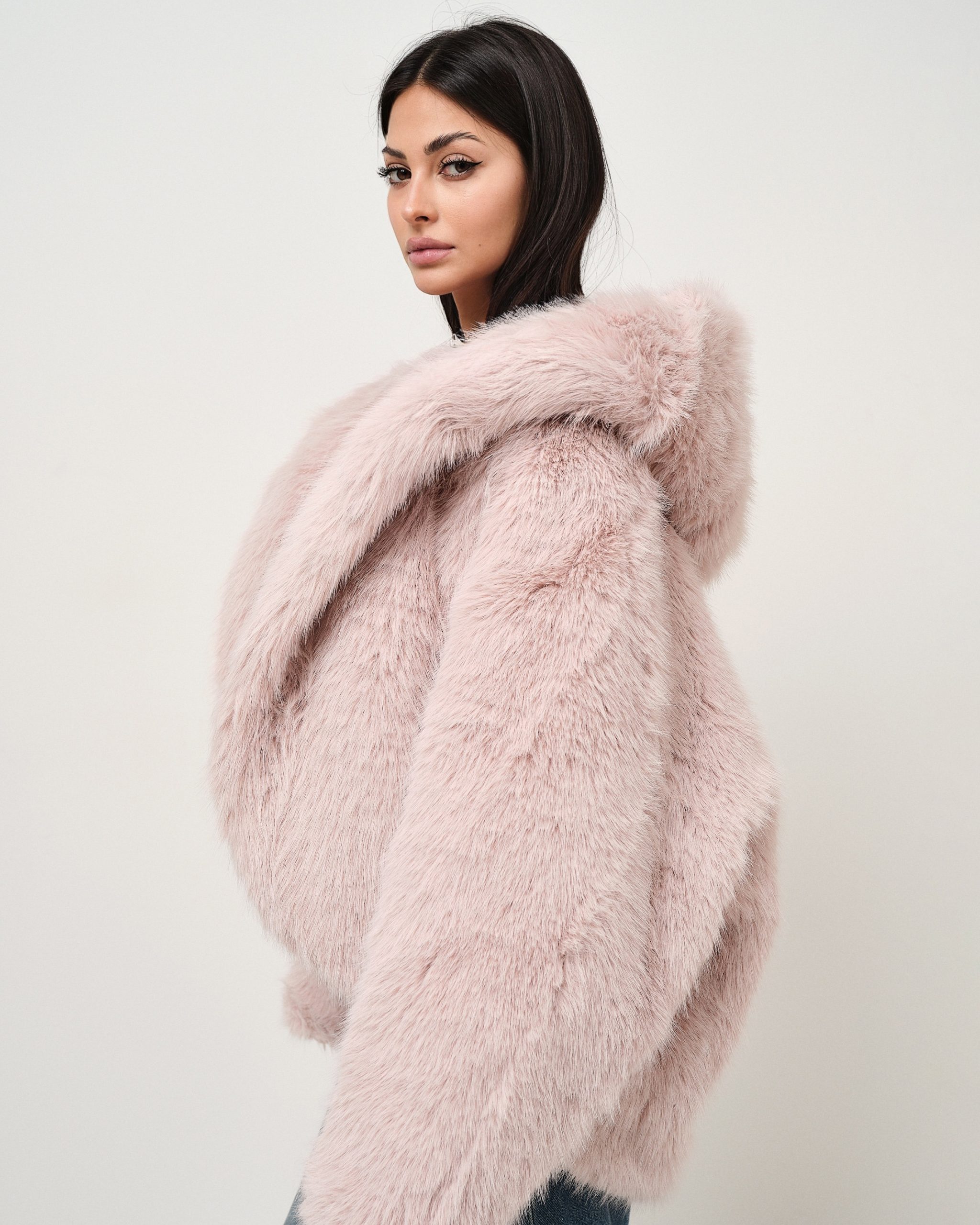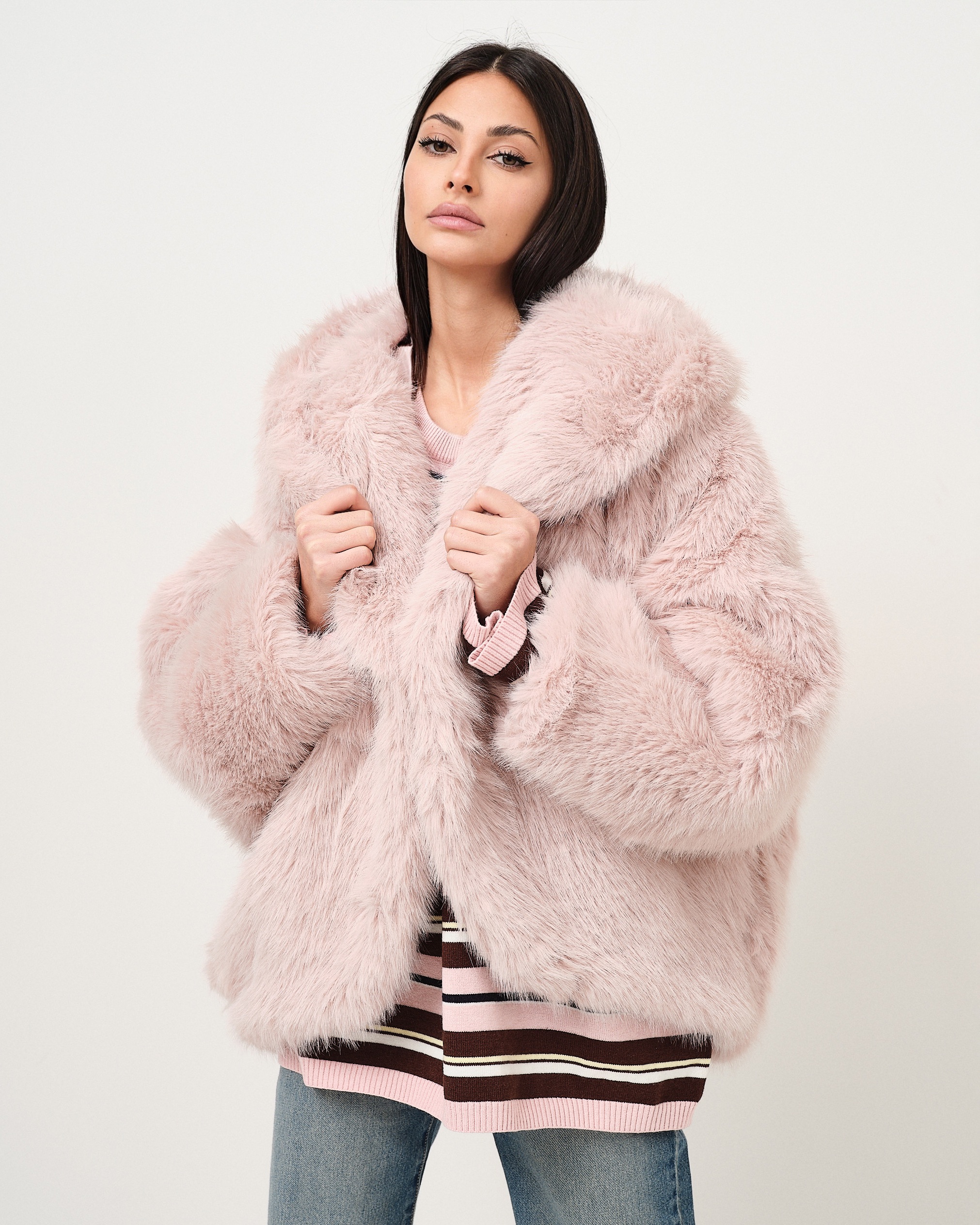 Maxi pelliccia vestibilità oversize con cappuccio e chiusura con singolo gancio.