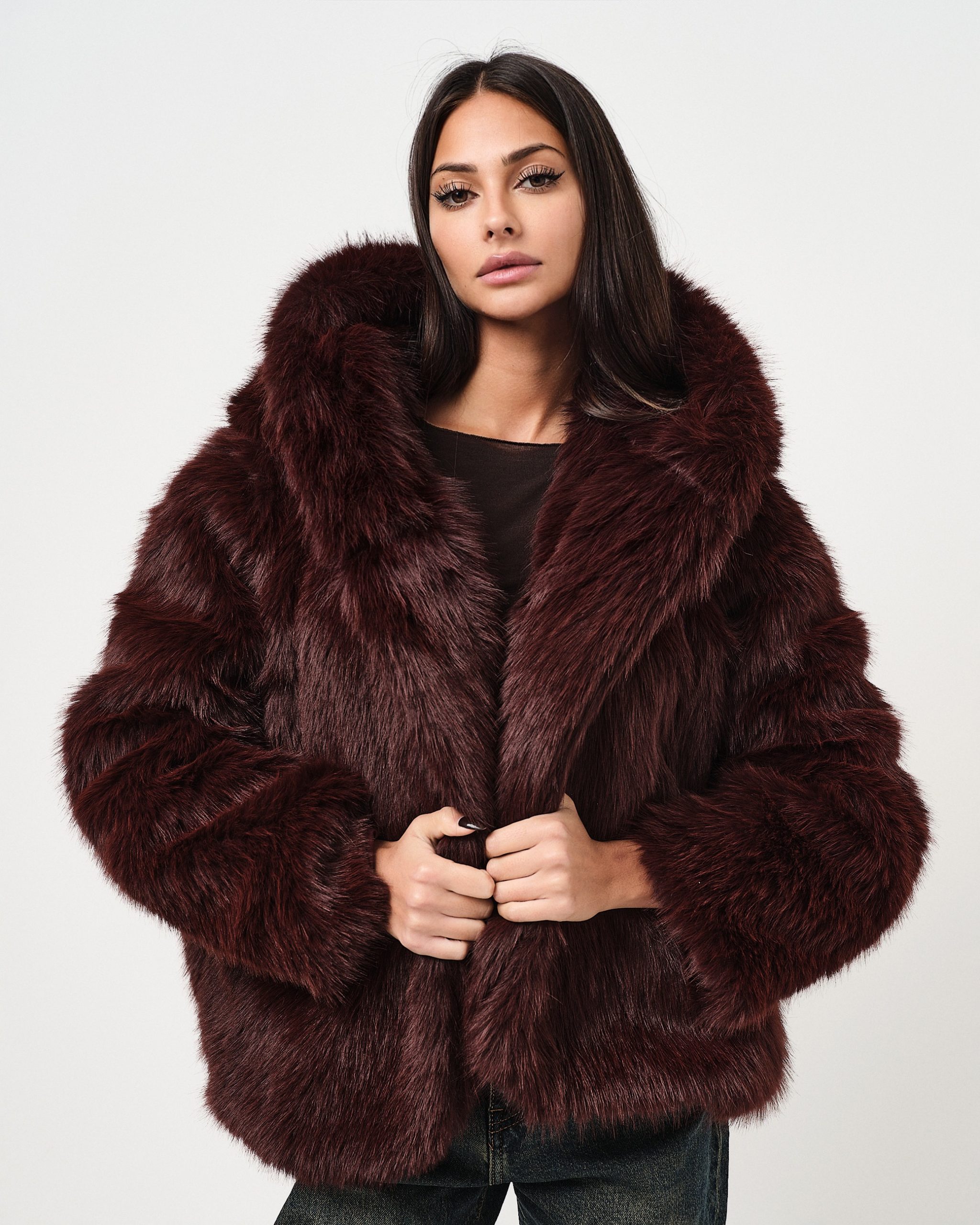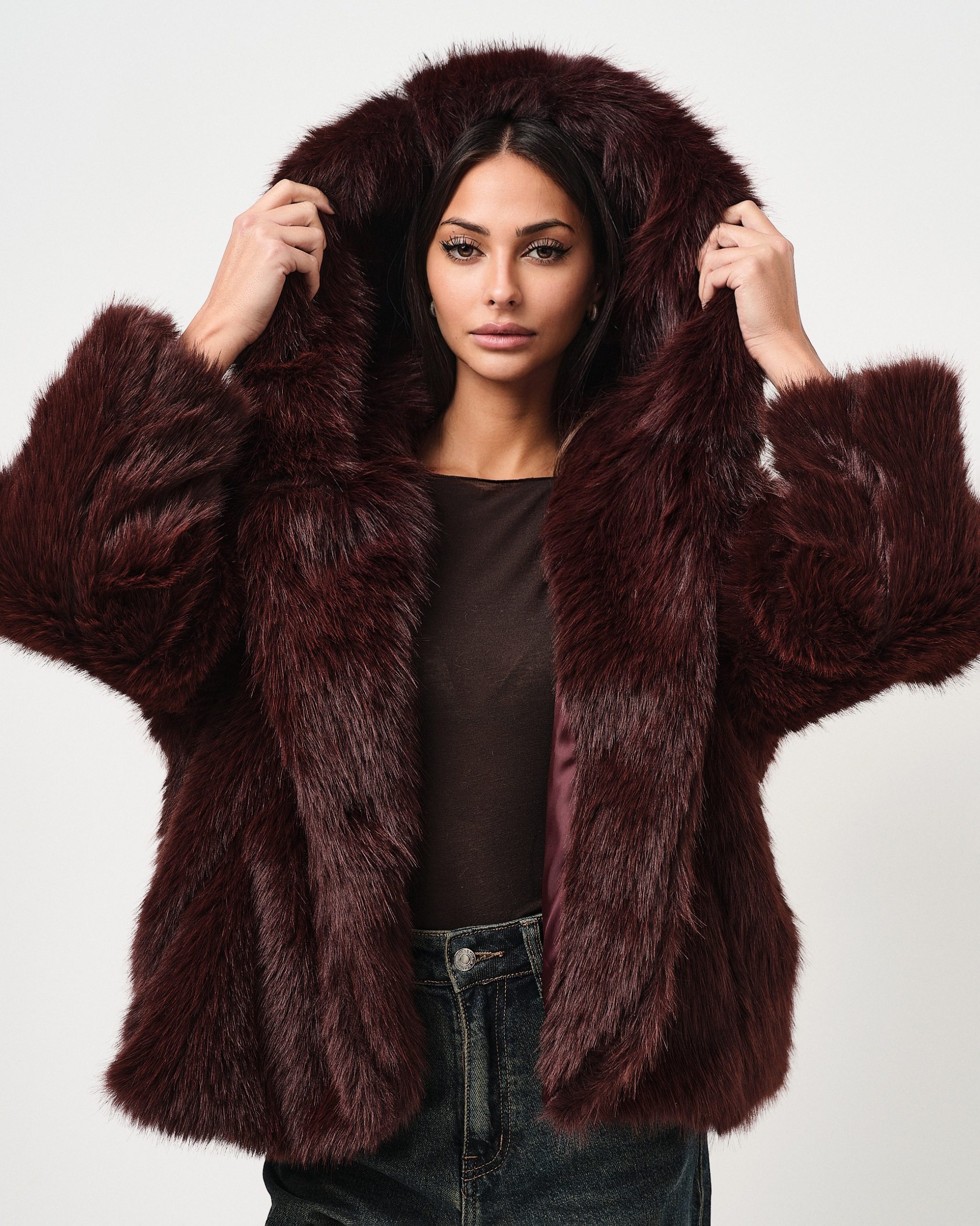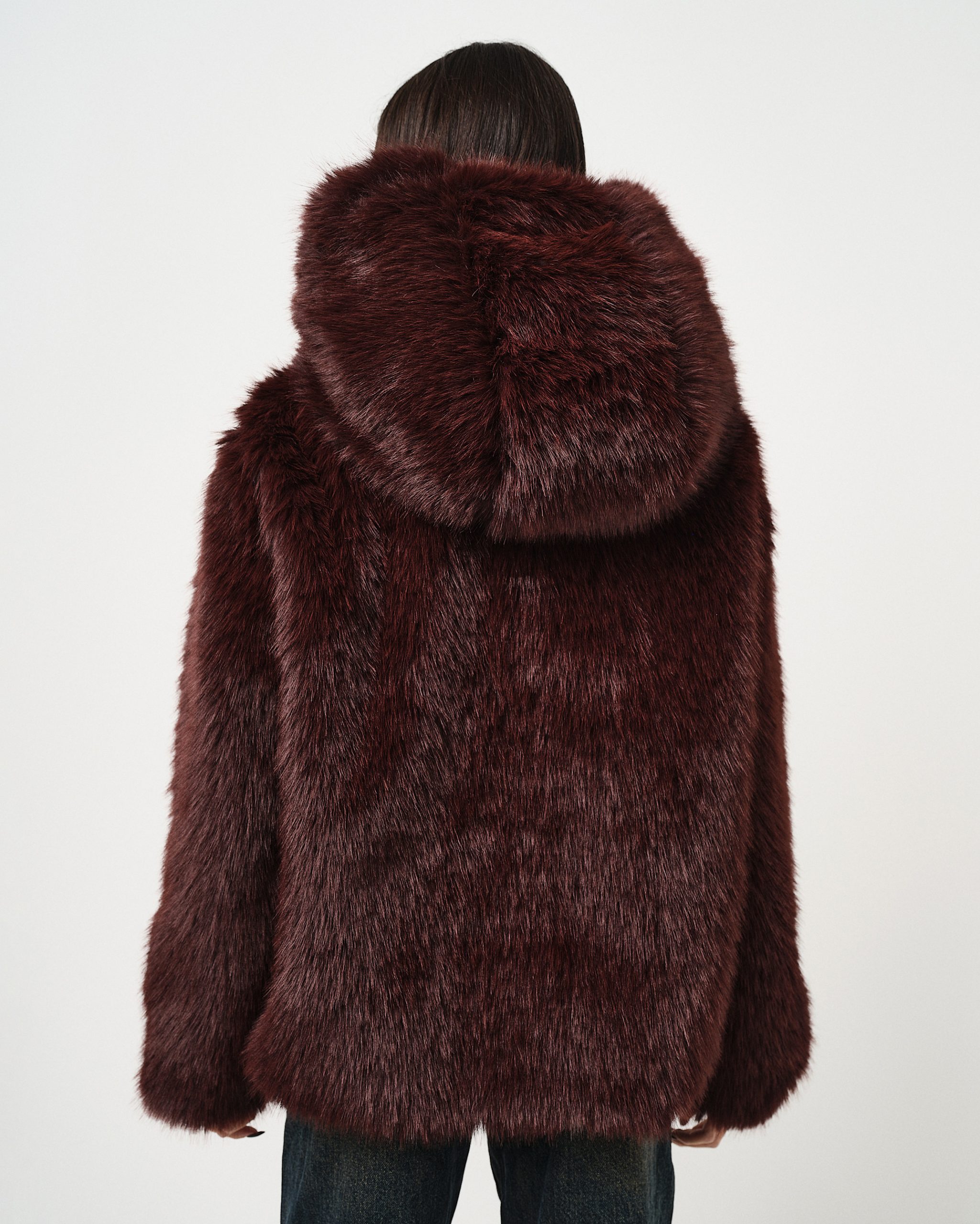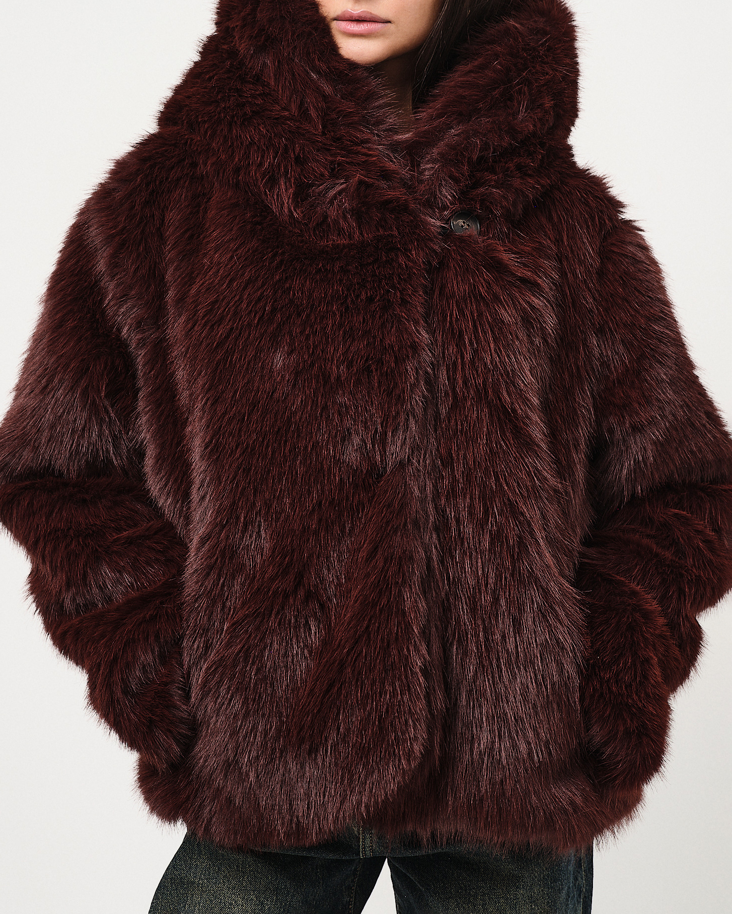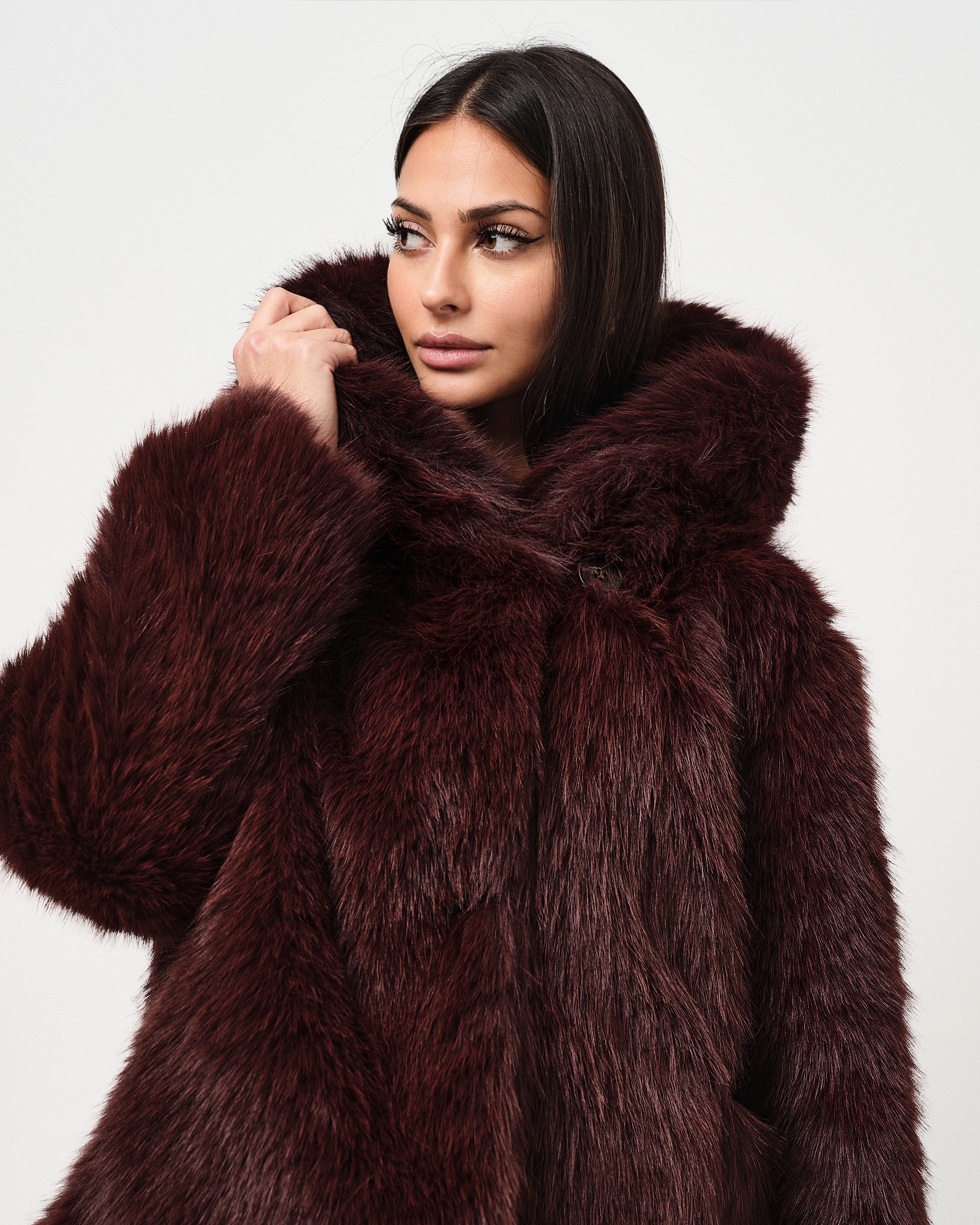Eco-pelliccia con cappuccio e chiusura con bottone.