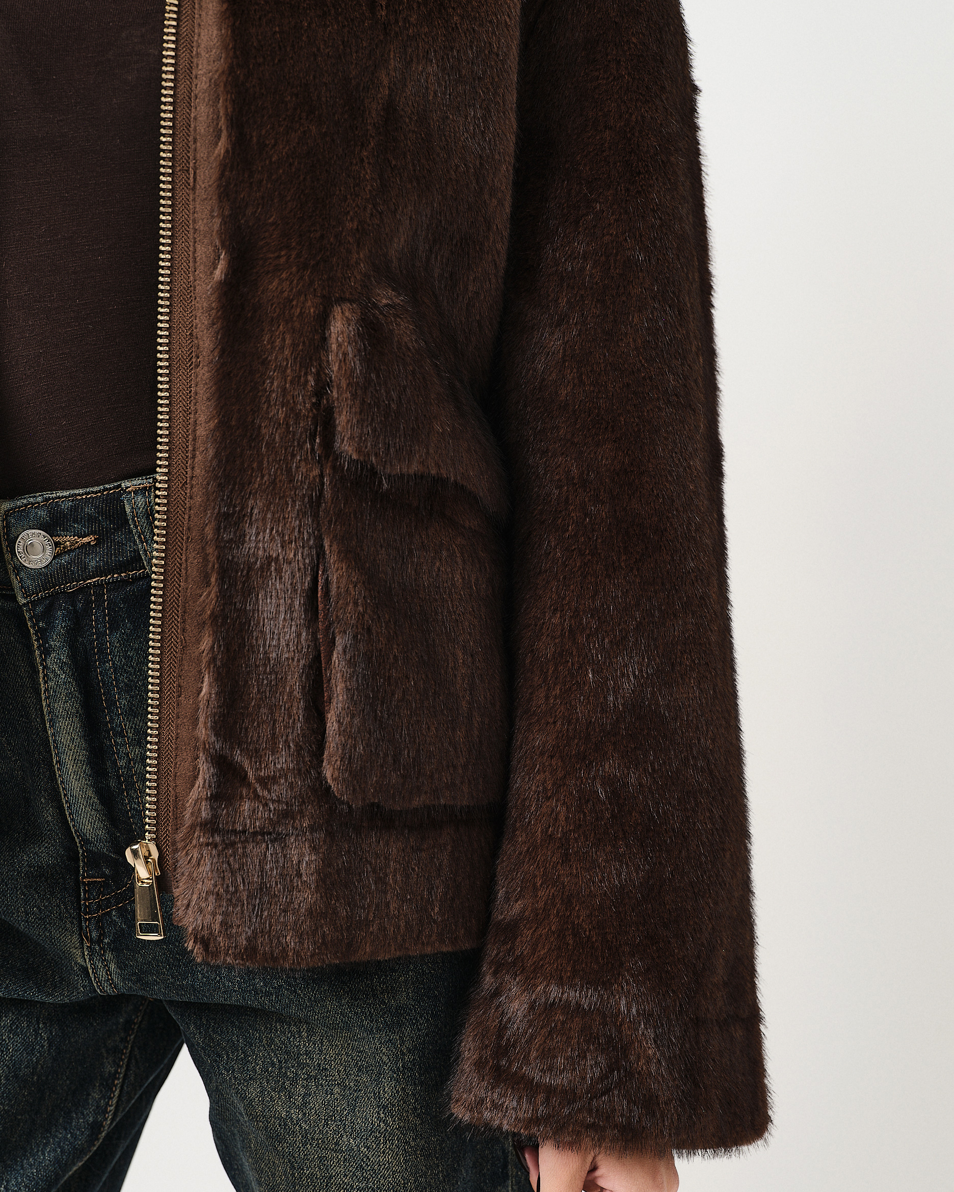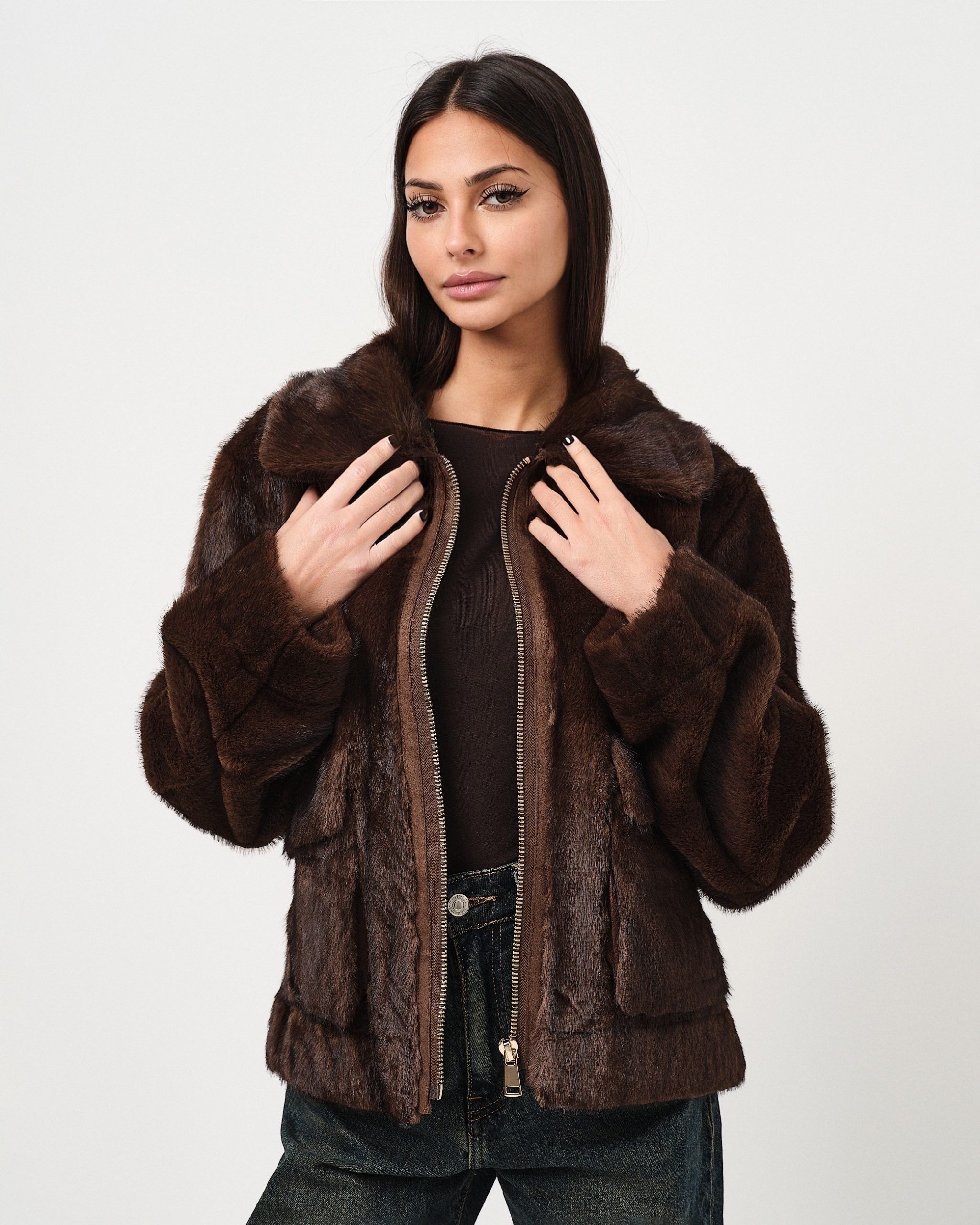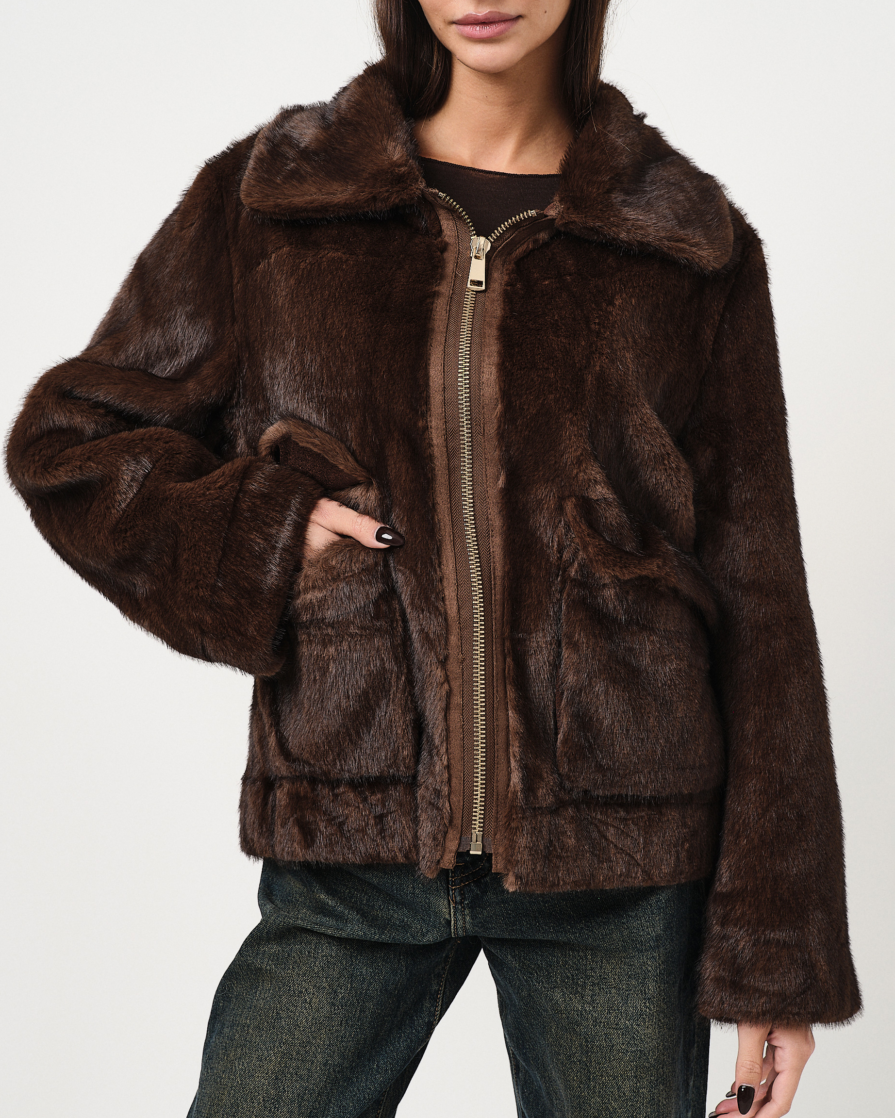 Eco-pelliccia cropped regular fit con colletto, zip e tasche a vista.