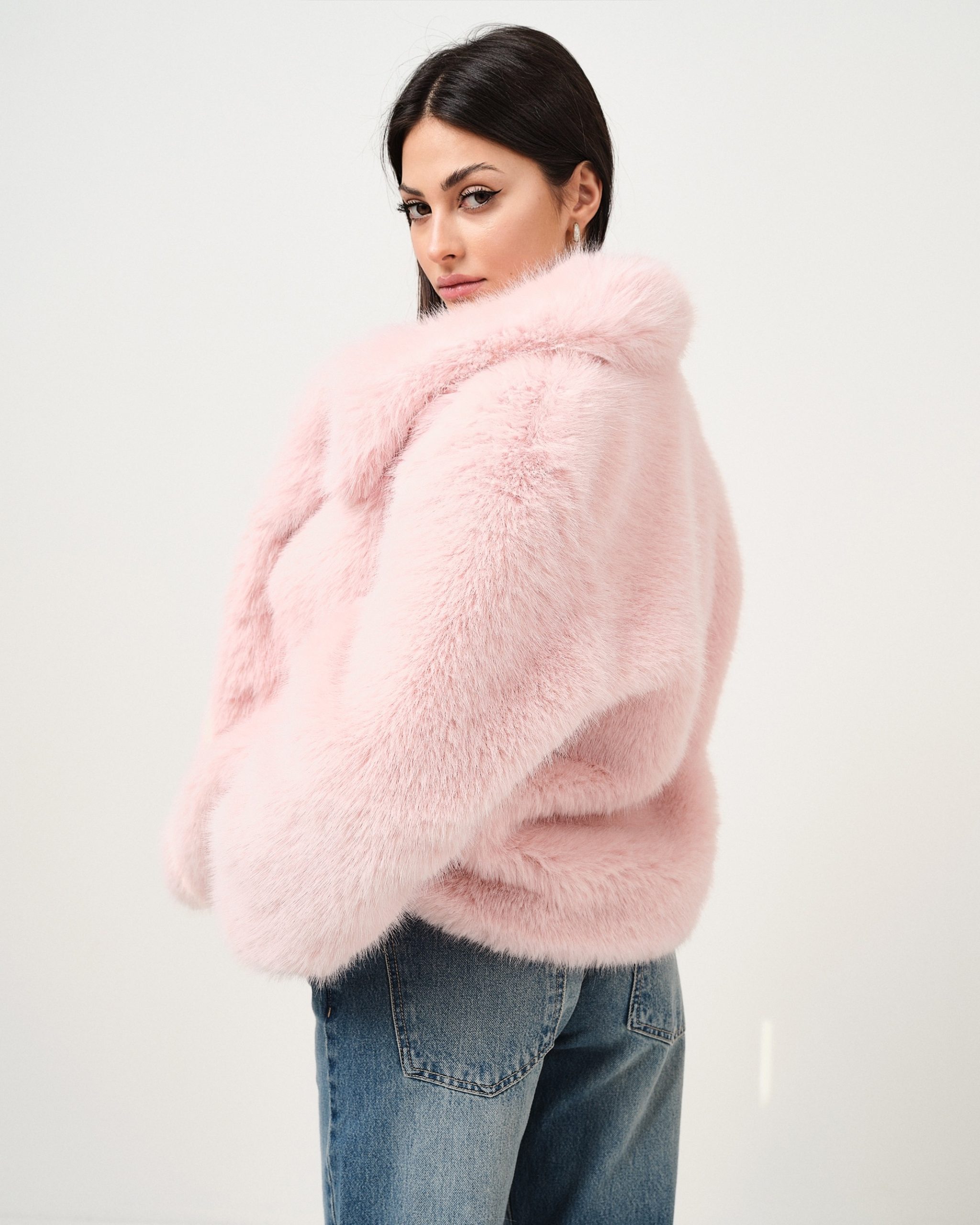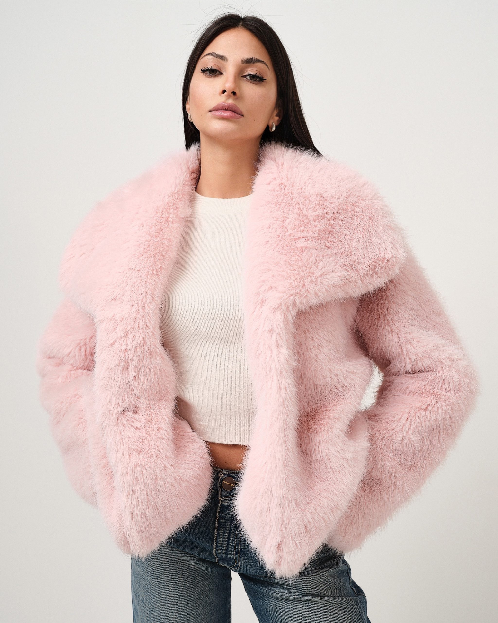 Eco-pelliccia cropped con dettaglio del collo ampio e chiusura con singolo gancetto.