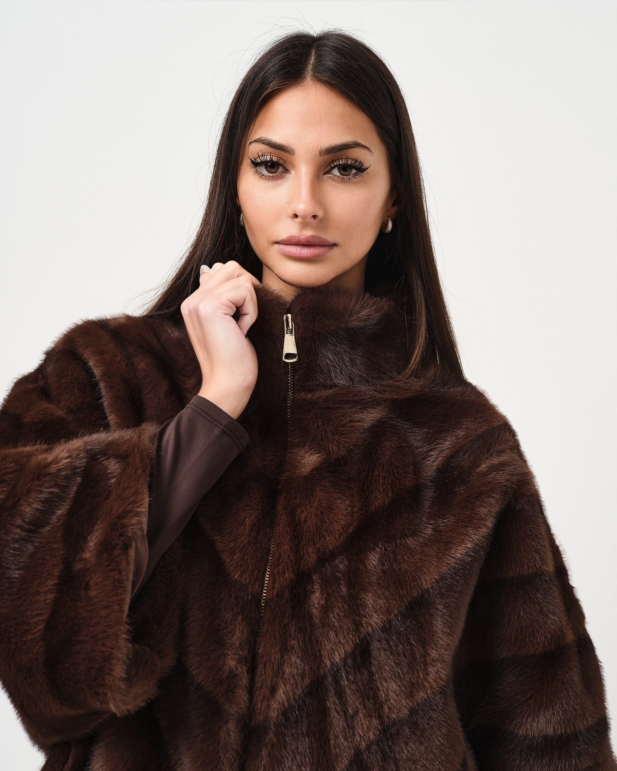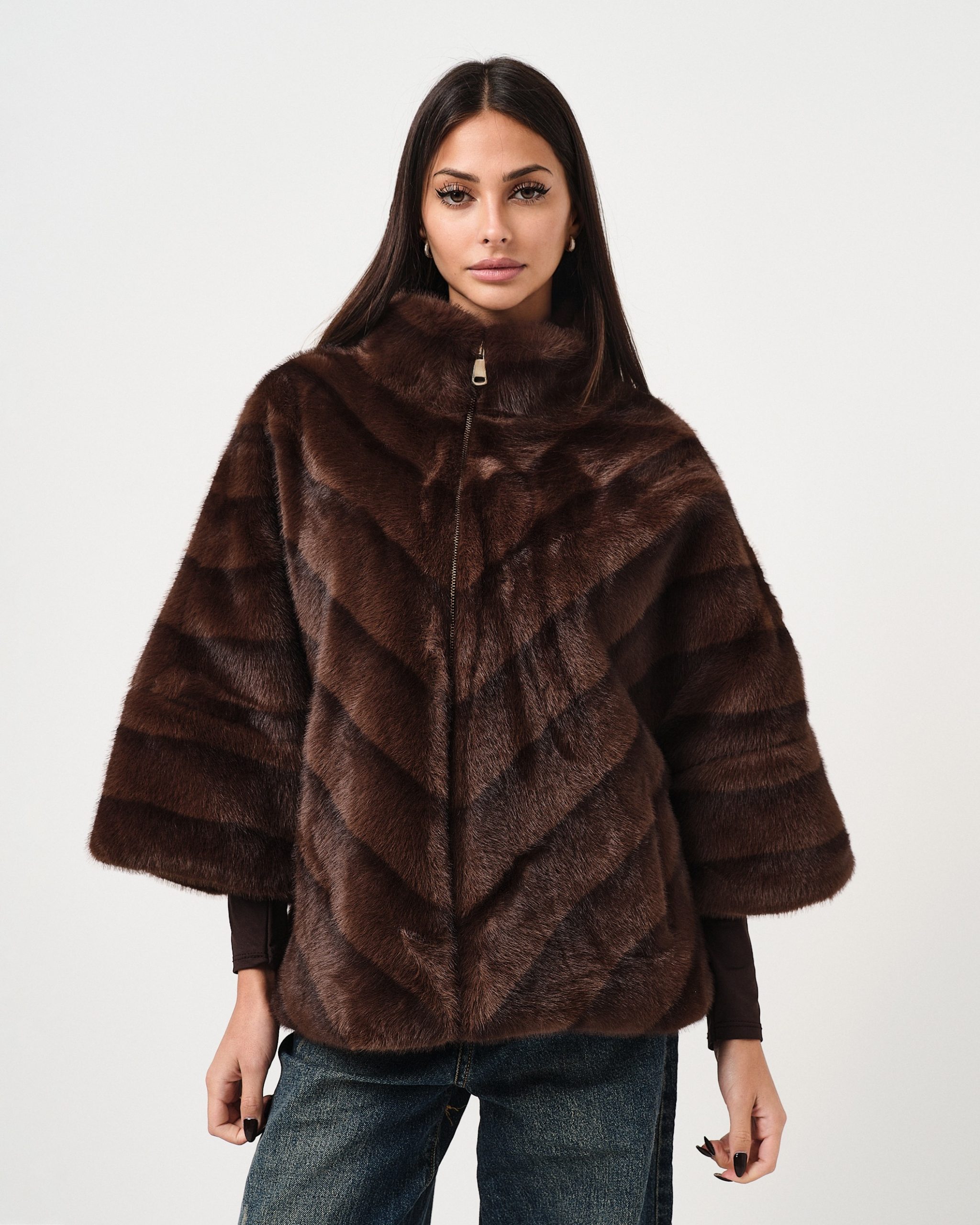 Pelliccia ecologica con manica a tre quarti, collo alto e chiusura con zip.
