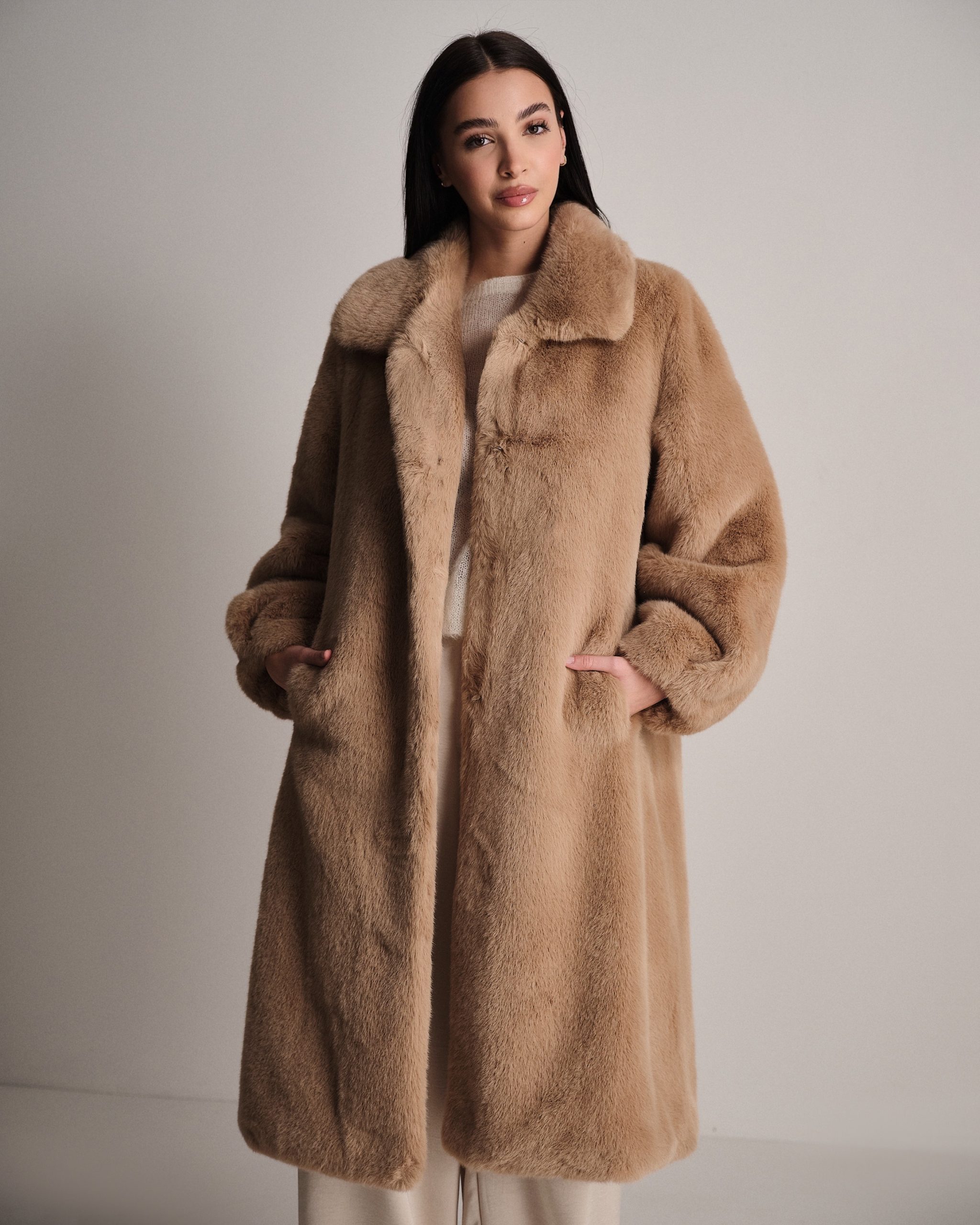 Eco-fur lunga oversize in tessuto soft touch con colletto, tasche e bottoni.