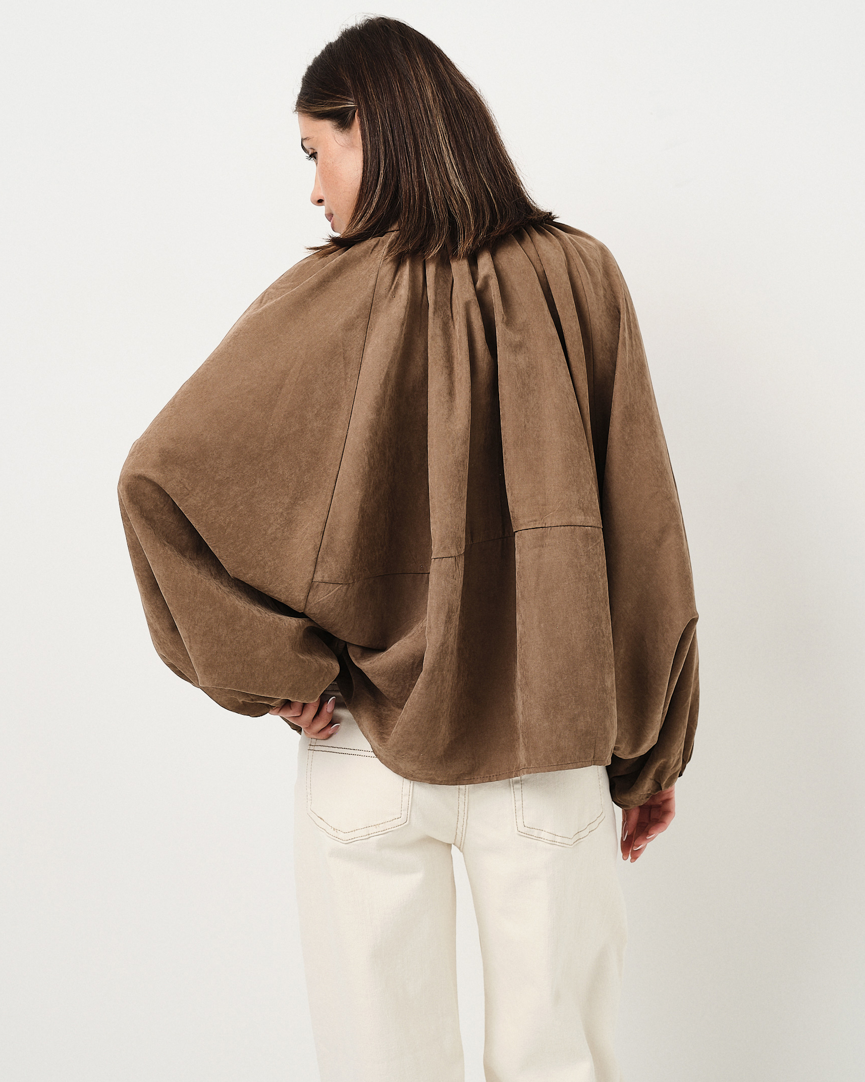Giubbino oversize in suede con zip e colletto, effetto drappeggiato.