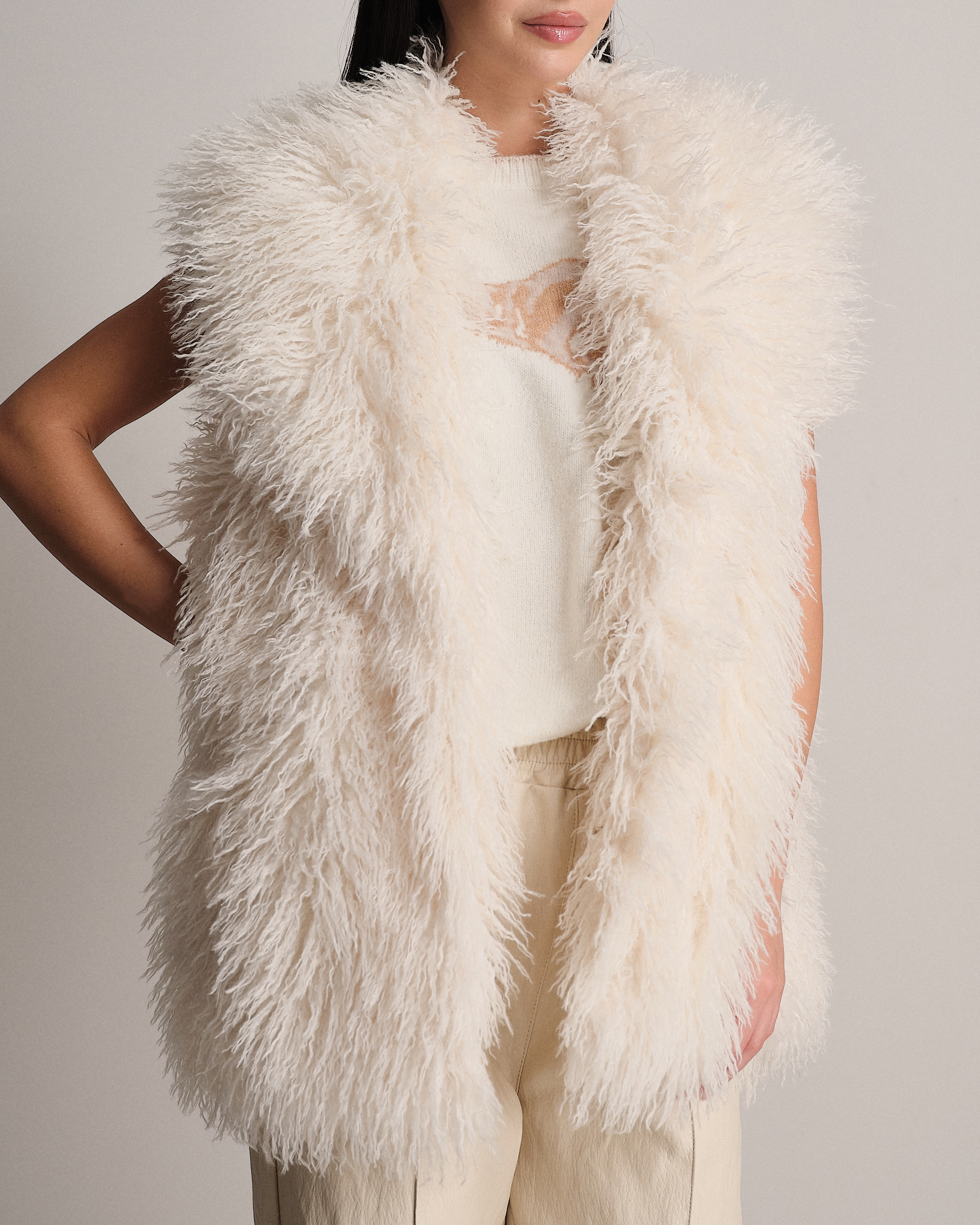 Eco-pelliccia smanicata in mongolia con vestibilità oversize.