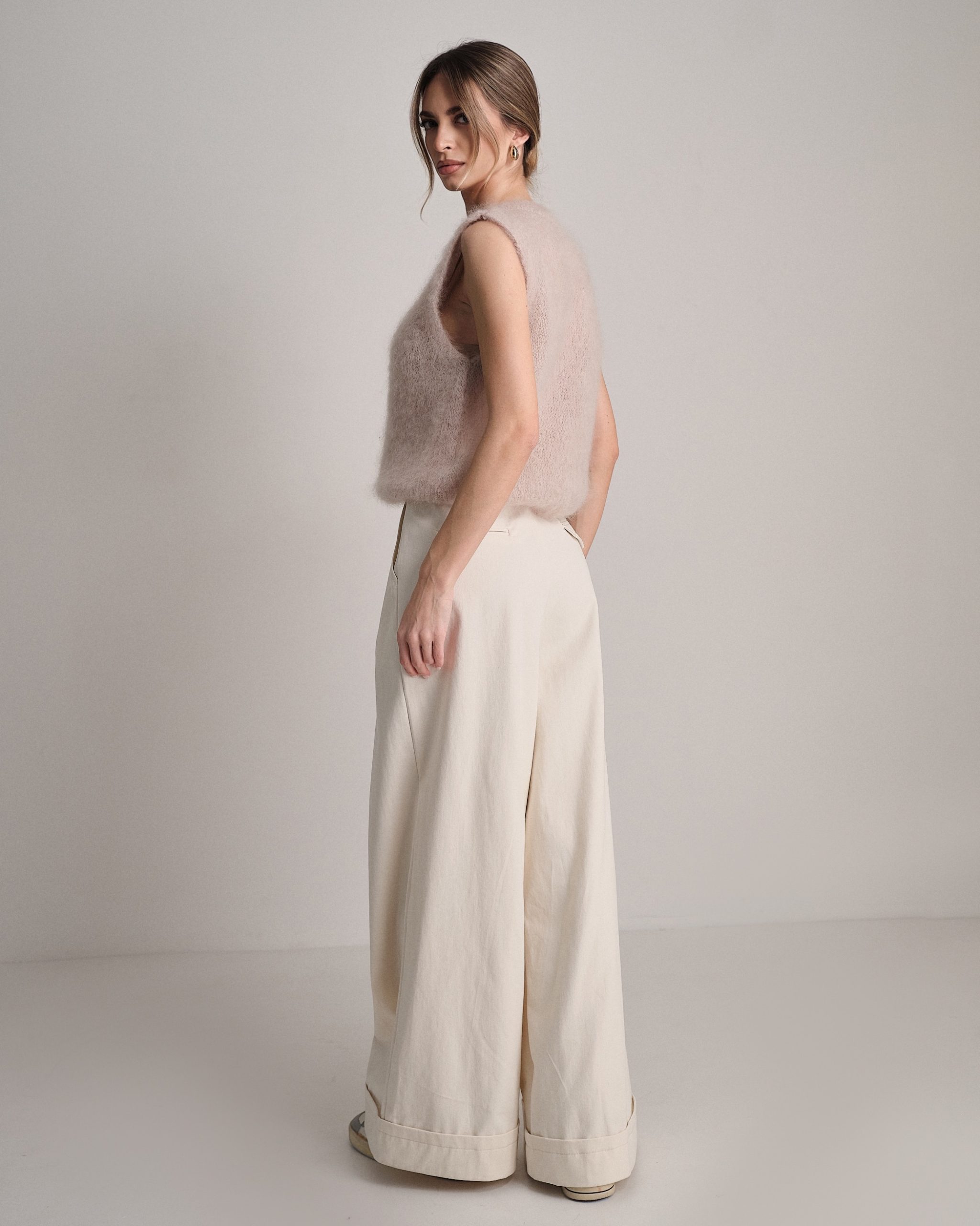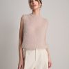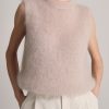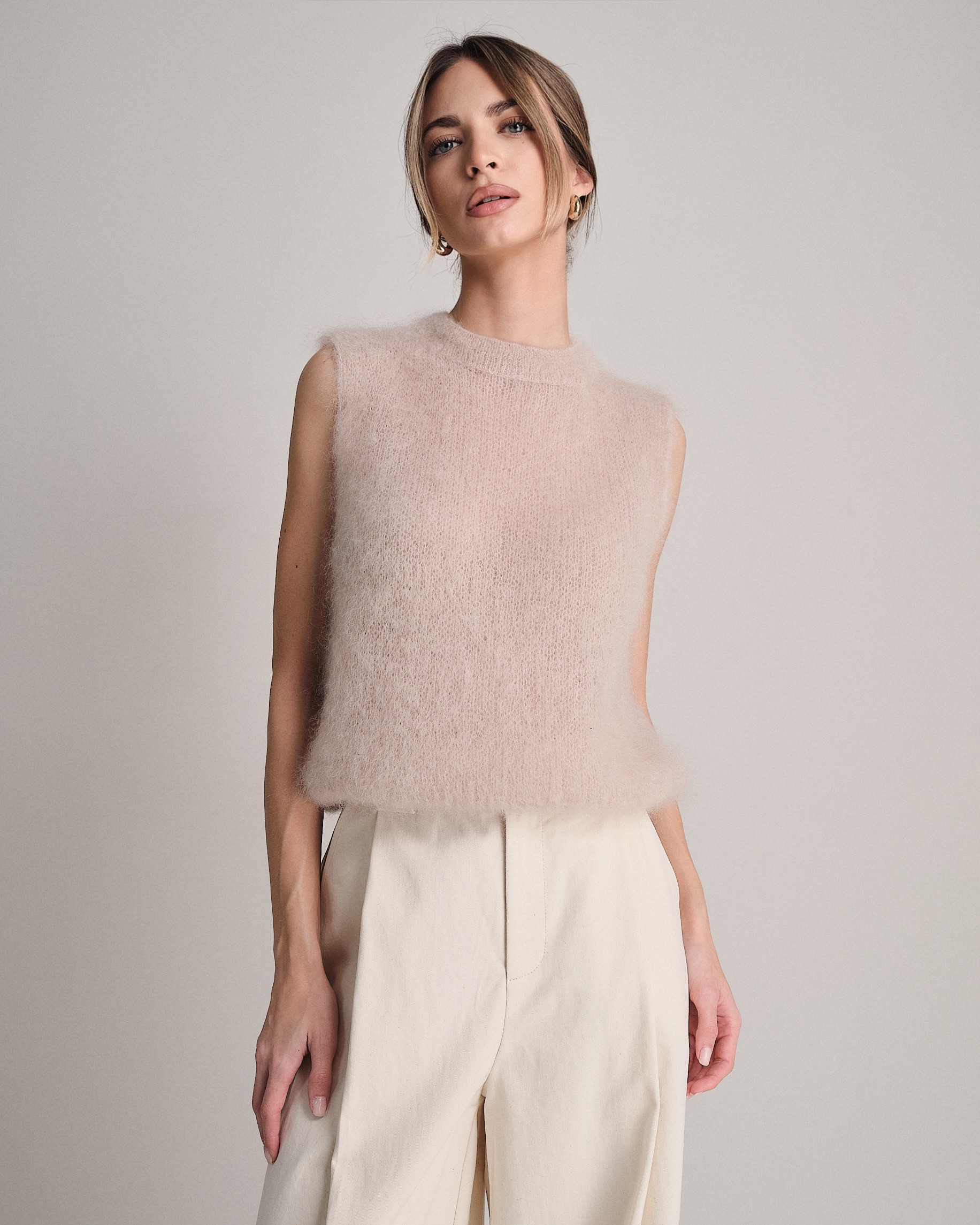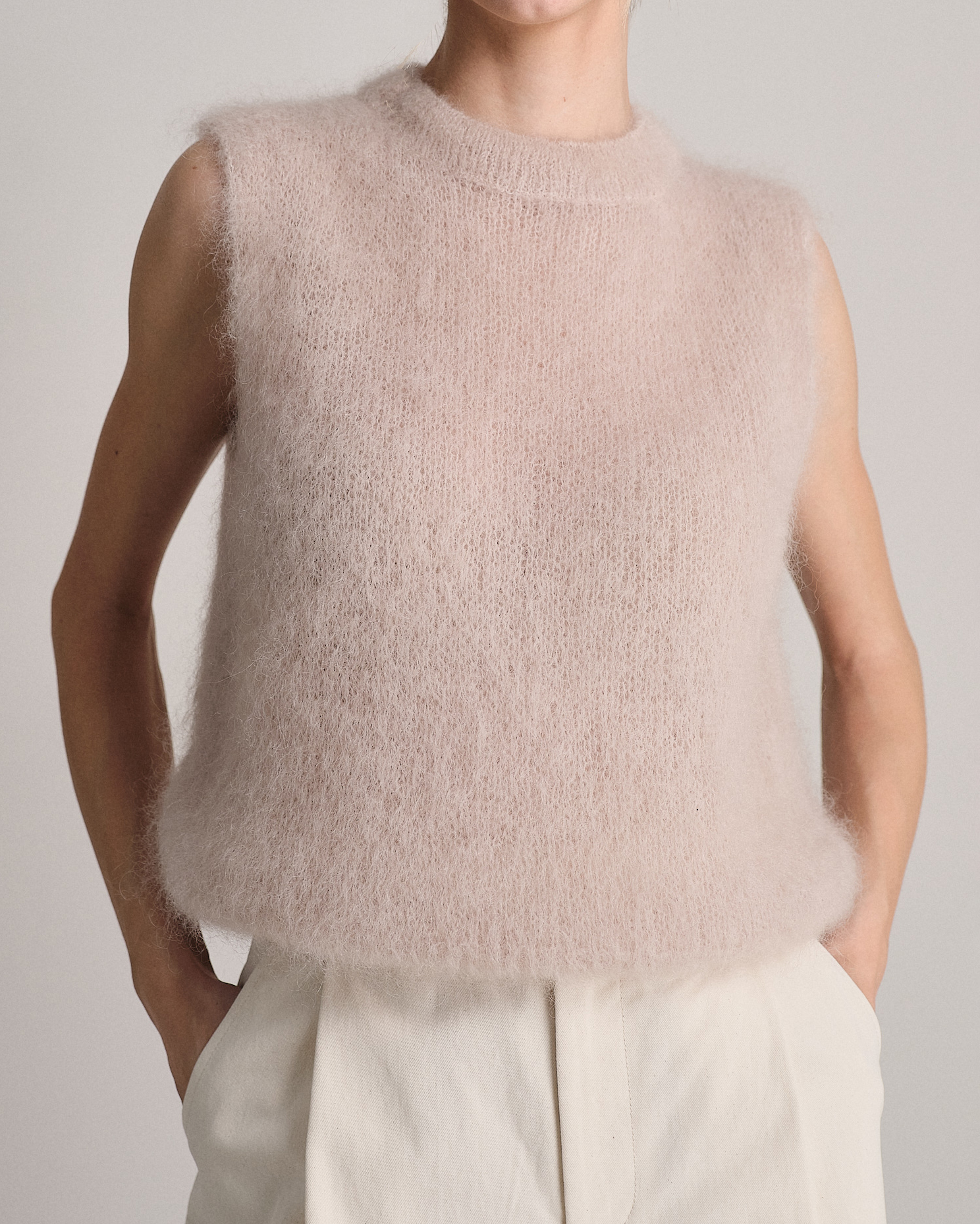 Gilet smanicato fluffy a girocollo in kid mohair.