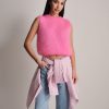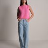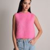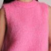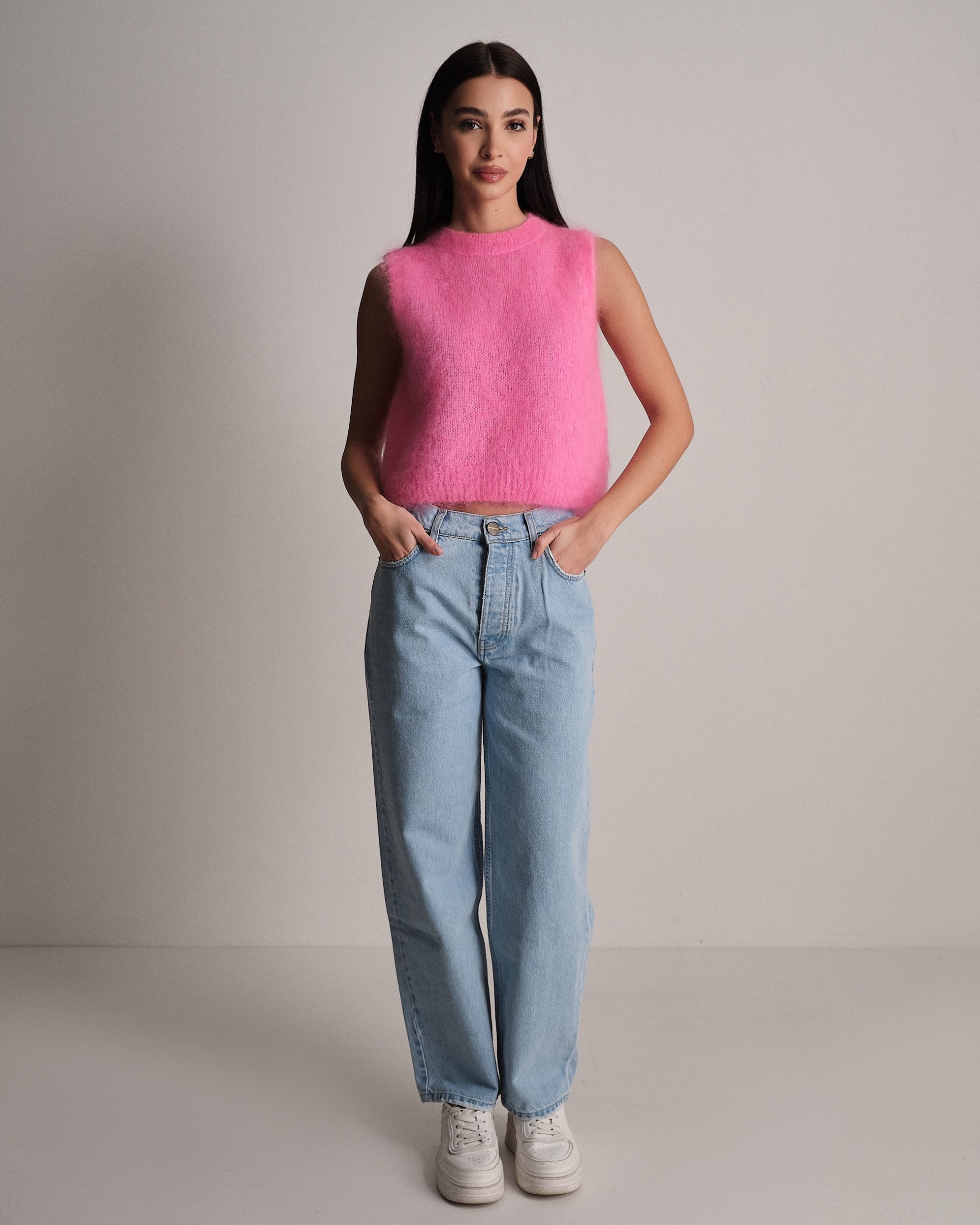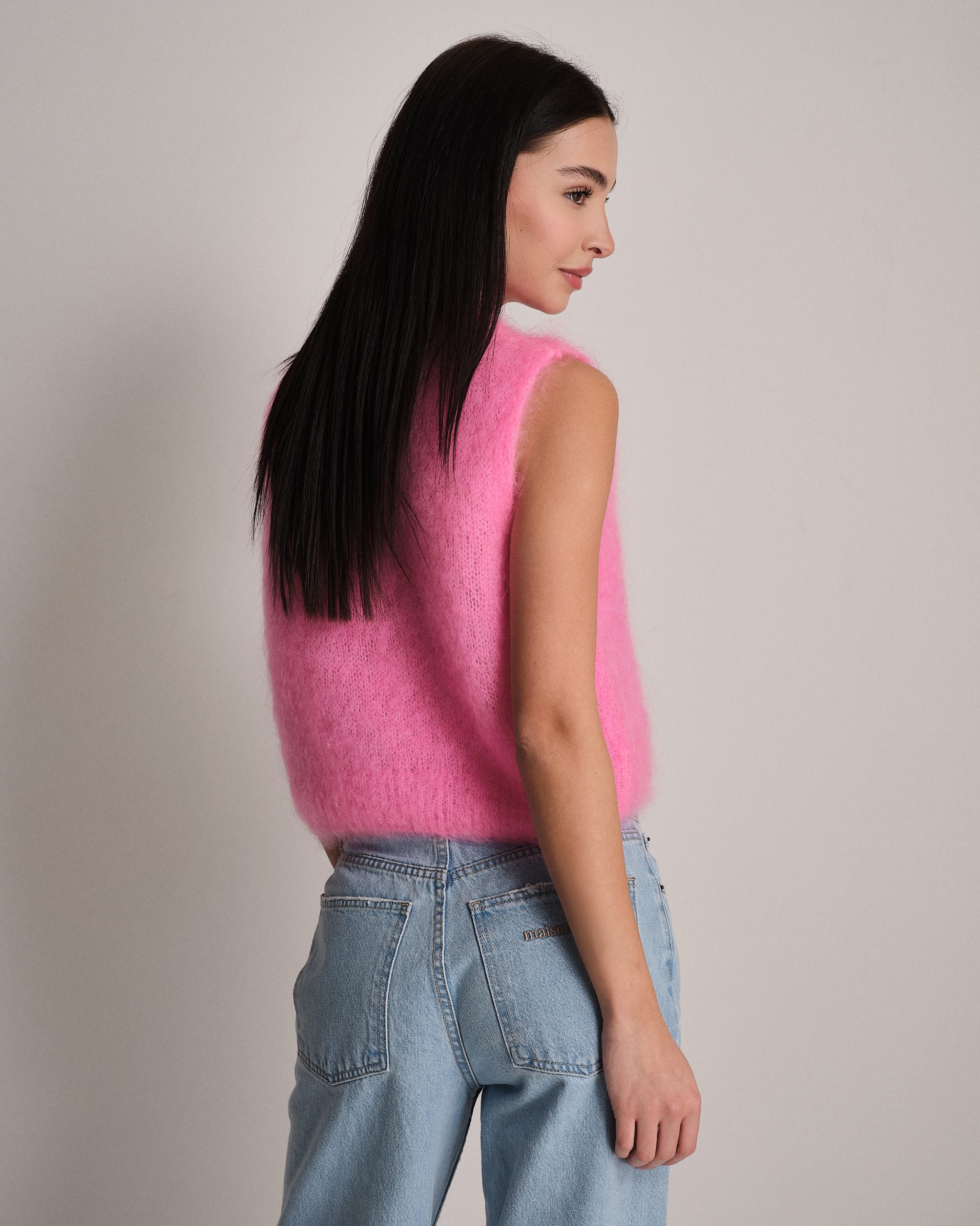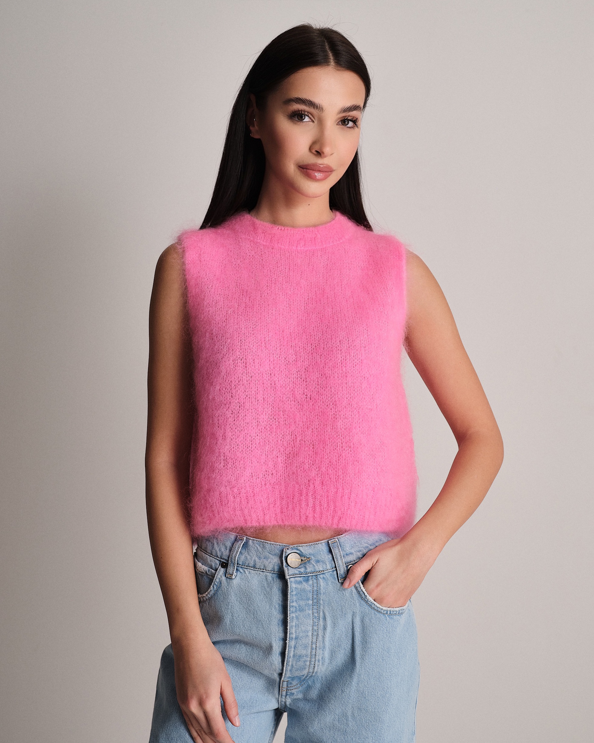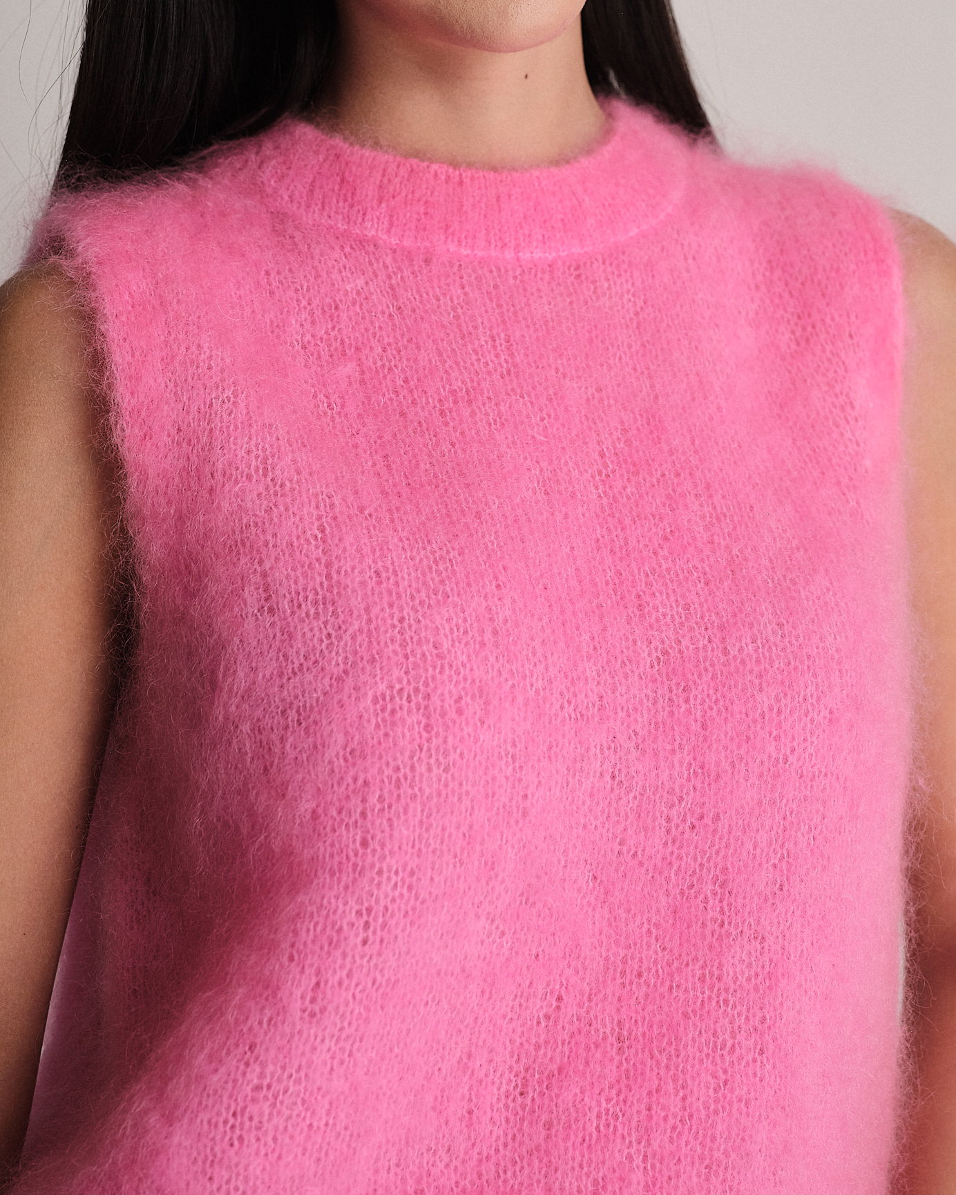 Gilet smanicato fluffy a girocollo in kid mohair.