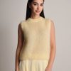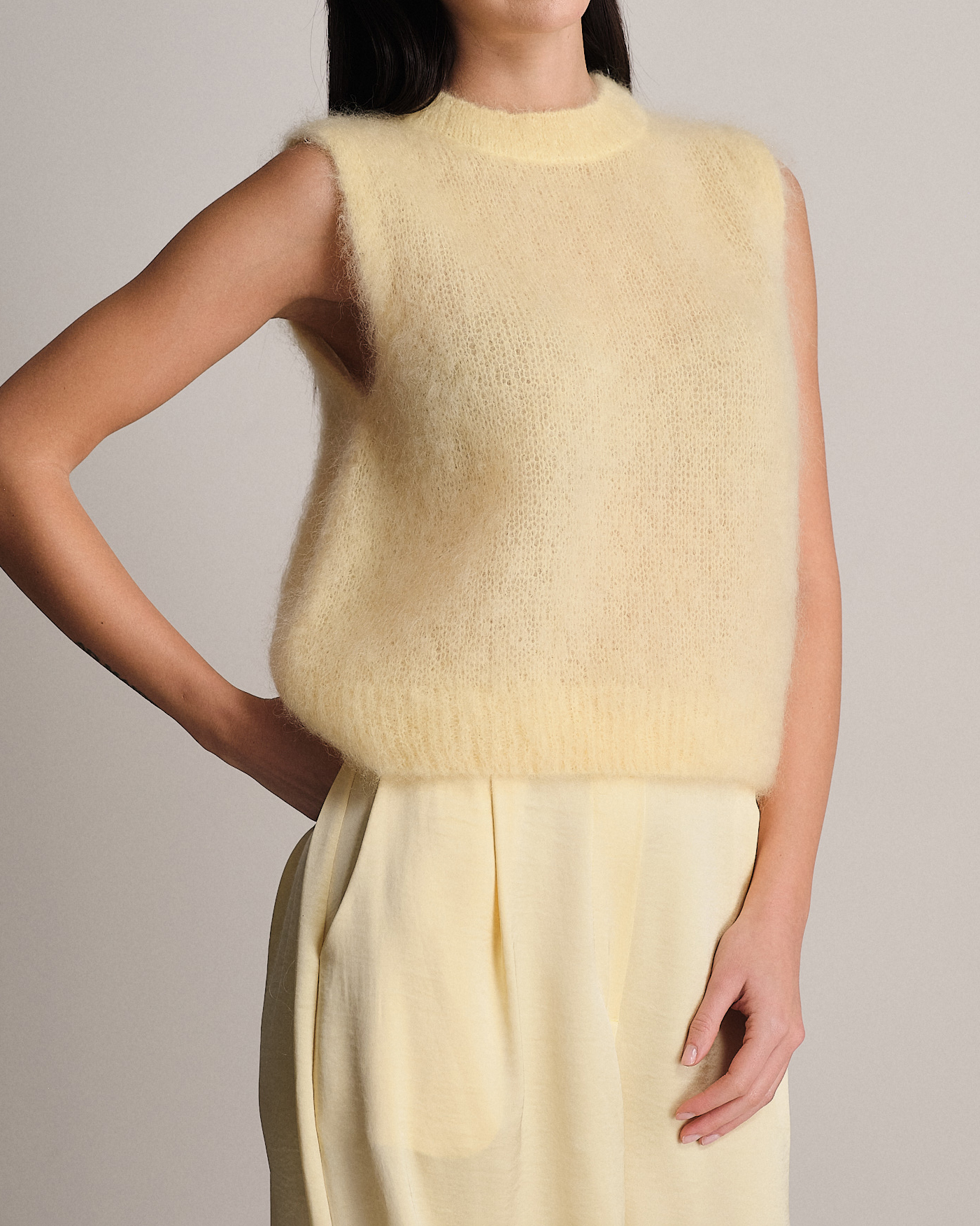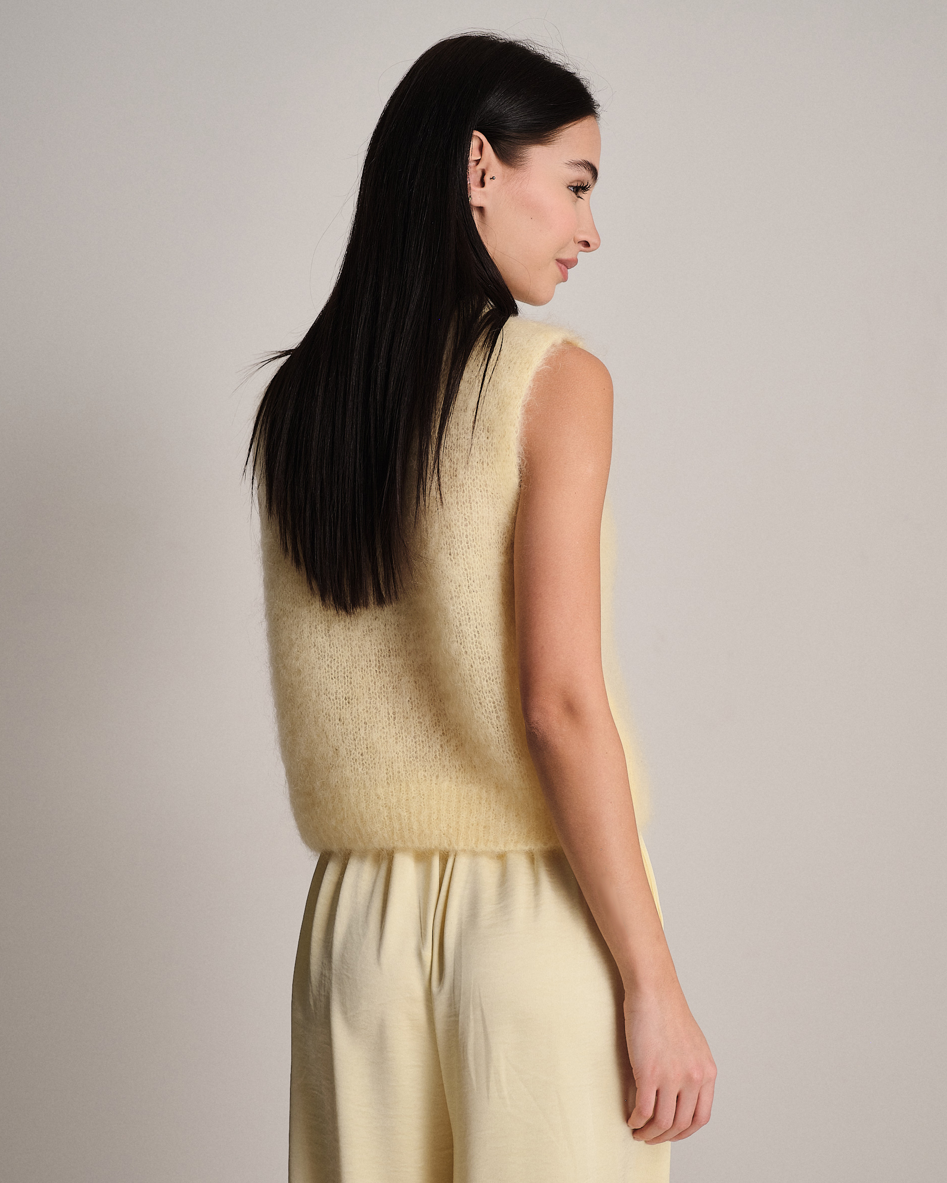 Gilet smanicato fluffy a girocollo in kid mohair.