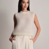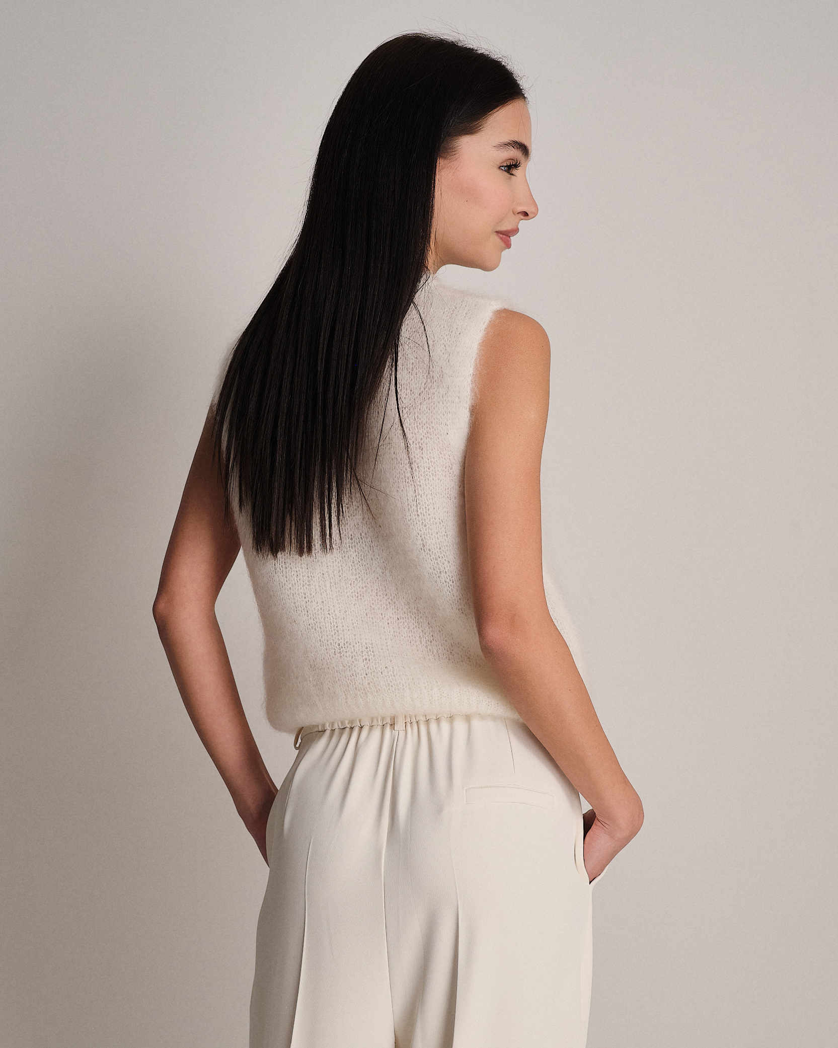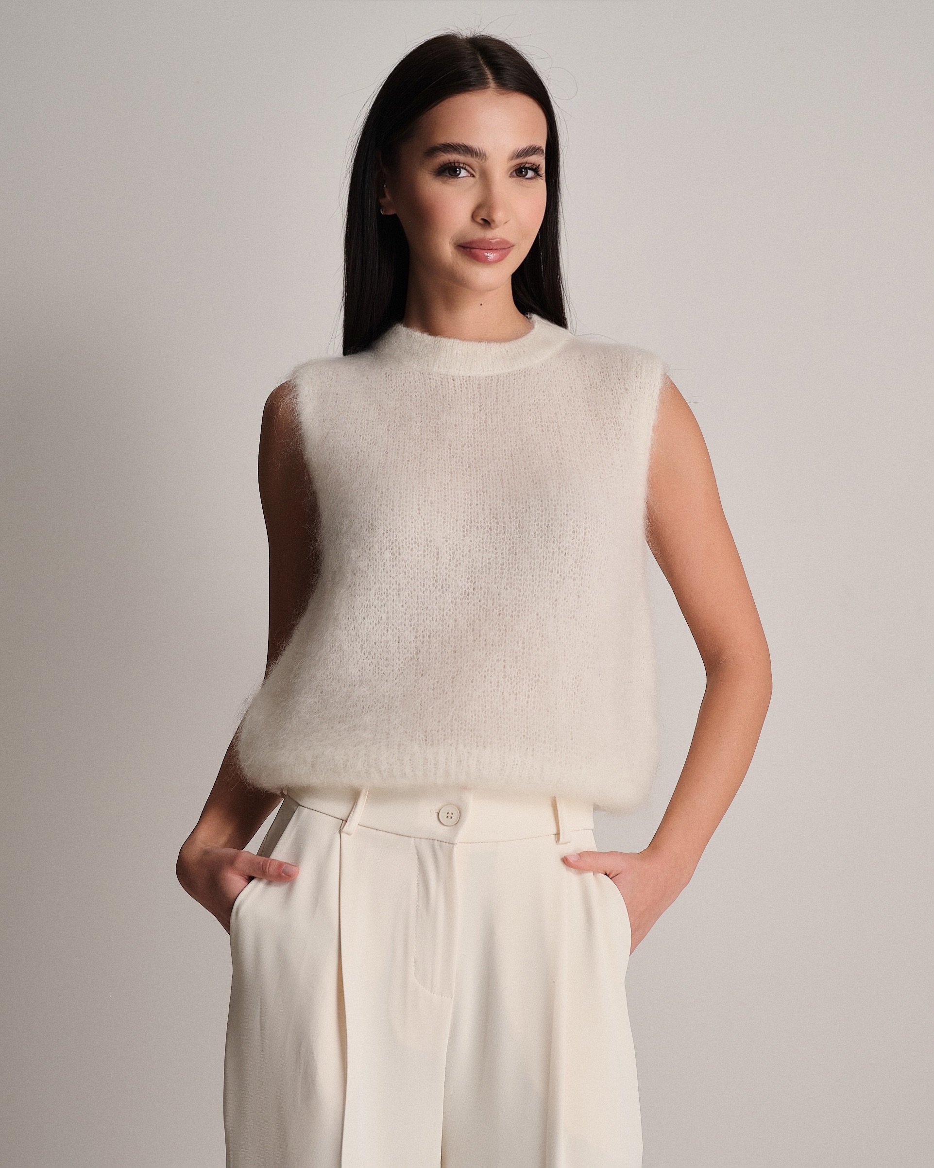 Gilet smanicato fluffy a girocollo in kid mohair.