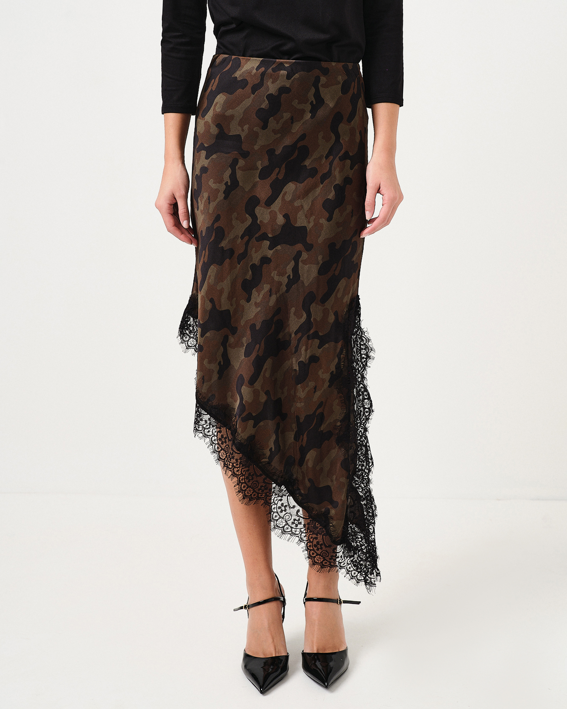 Gonna in raso con fondo asimmetrico con dettaglio in pizzo e stampa animalier.