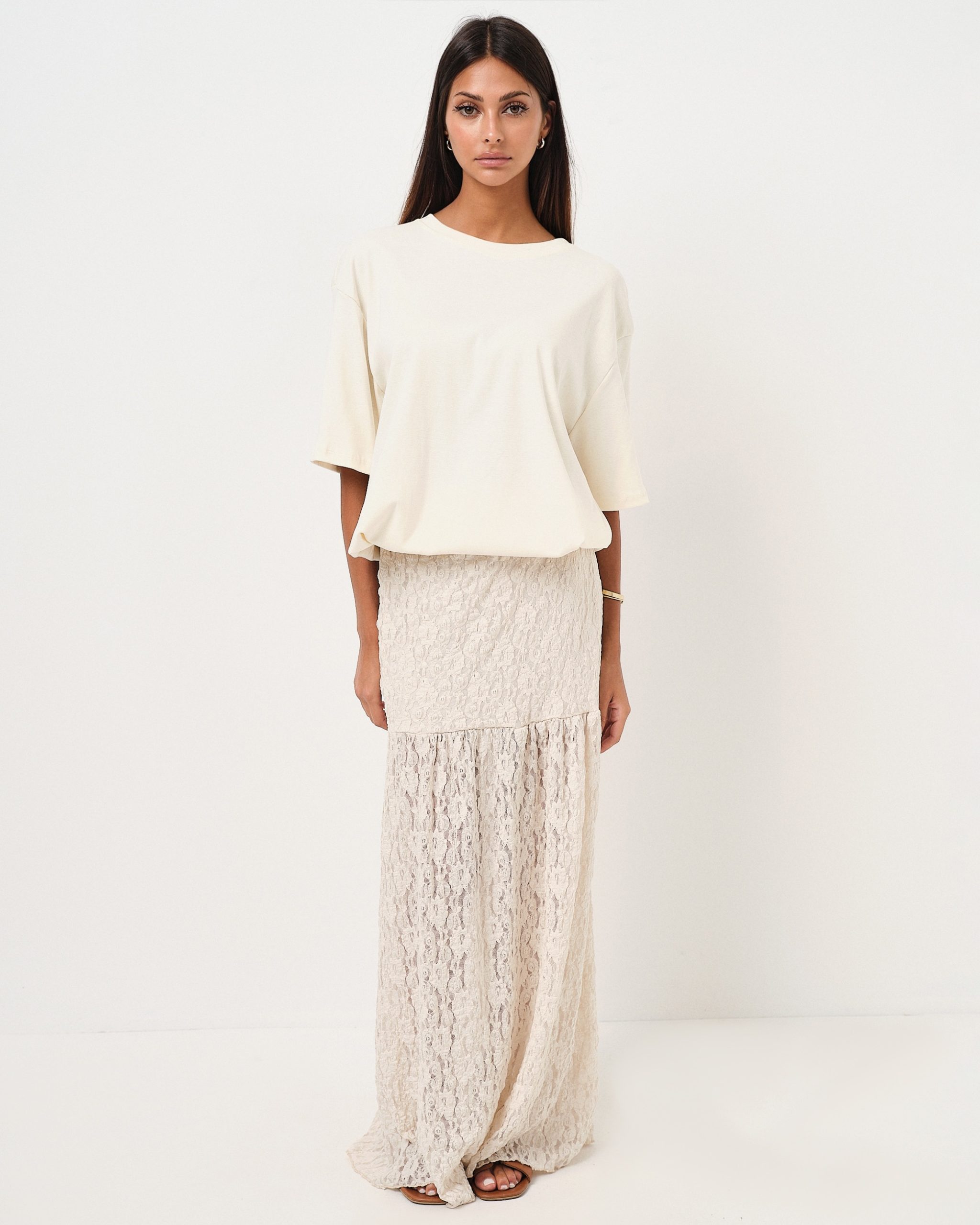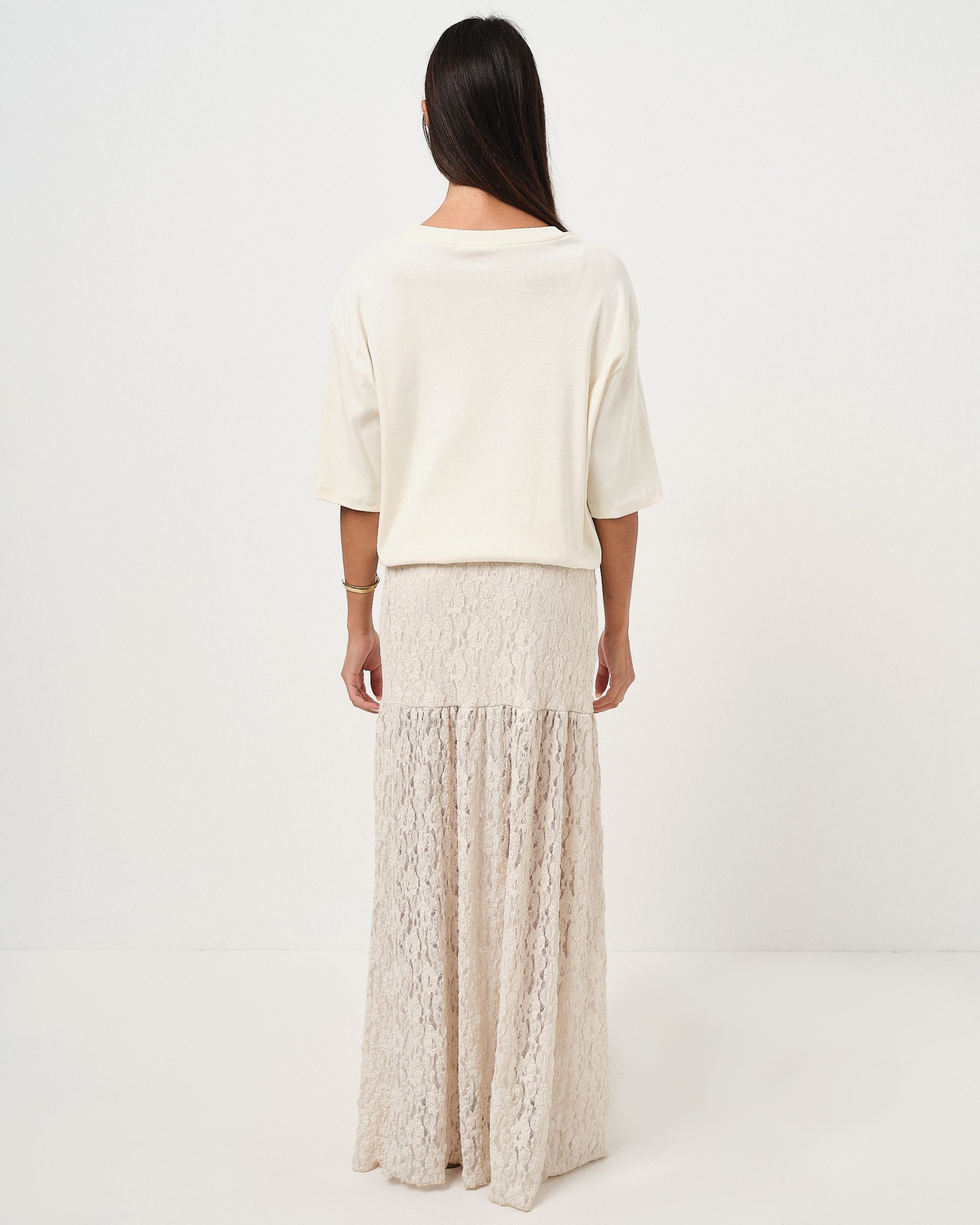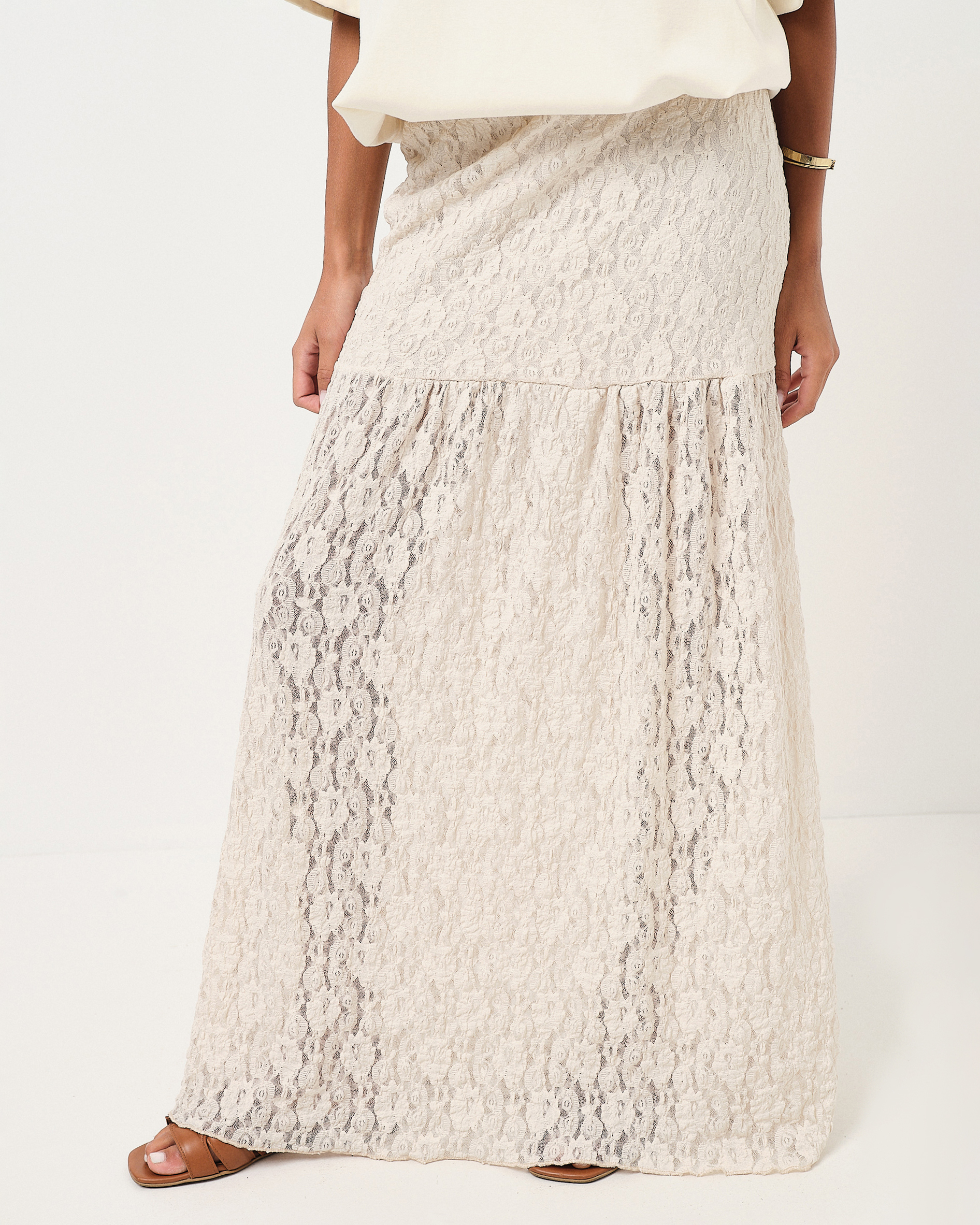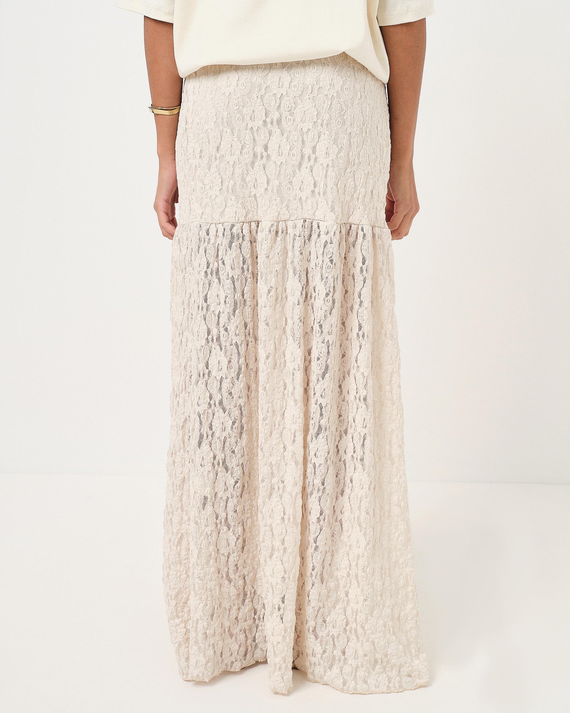 Gonna lunga in pizzo elasticizzato con balza ed elastico in vita.