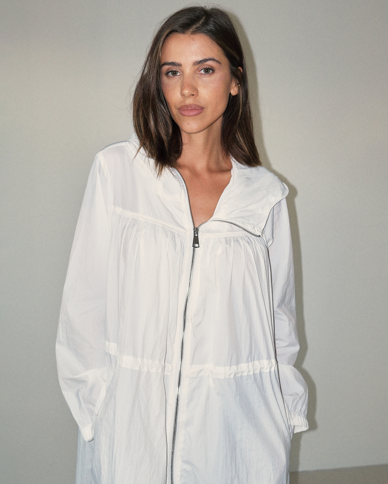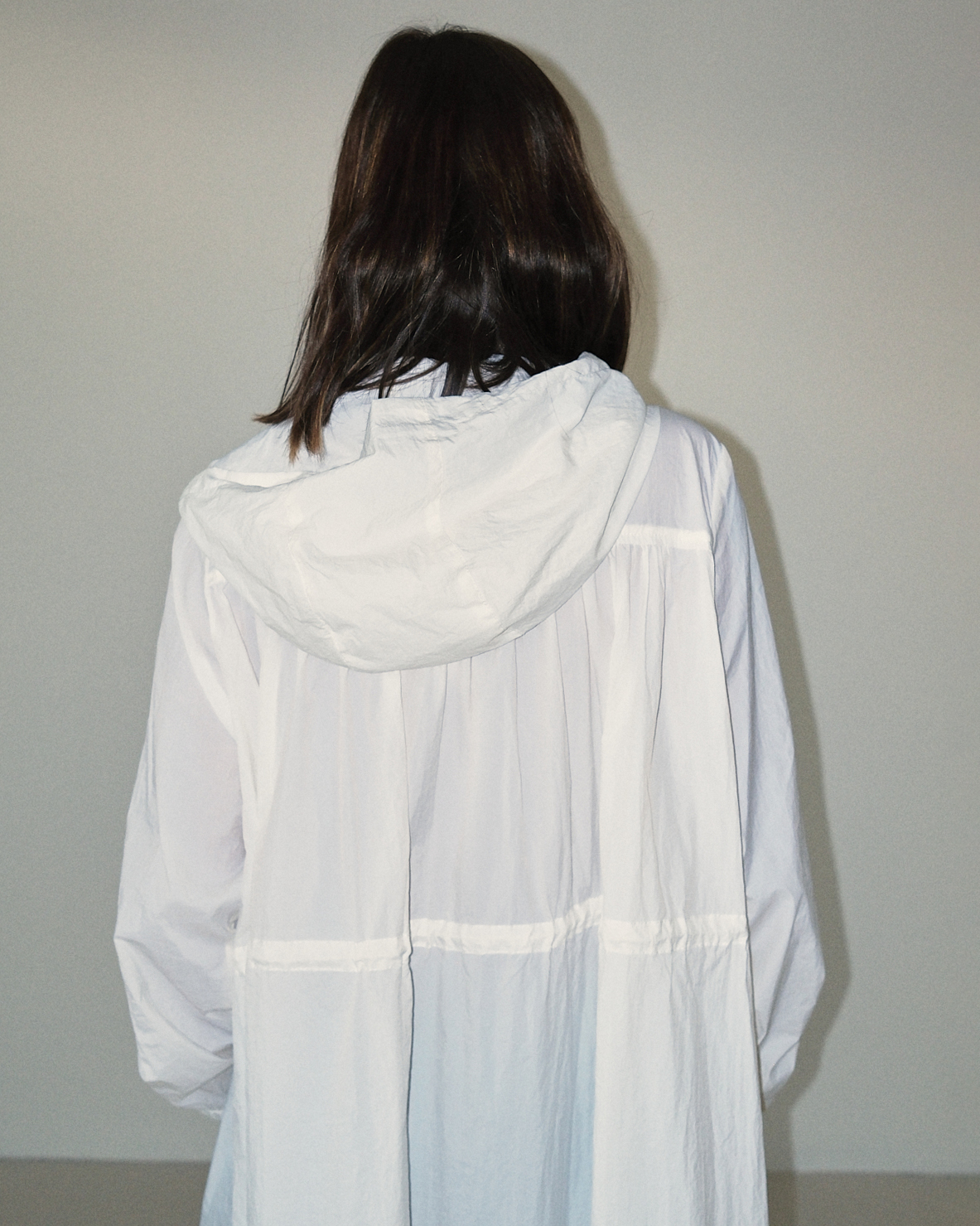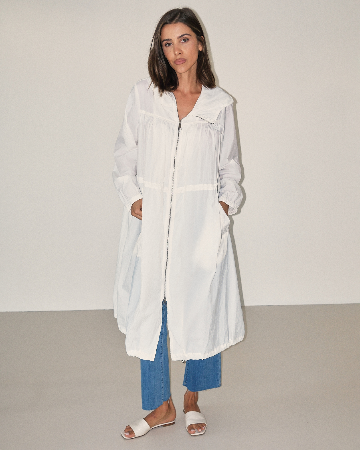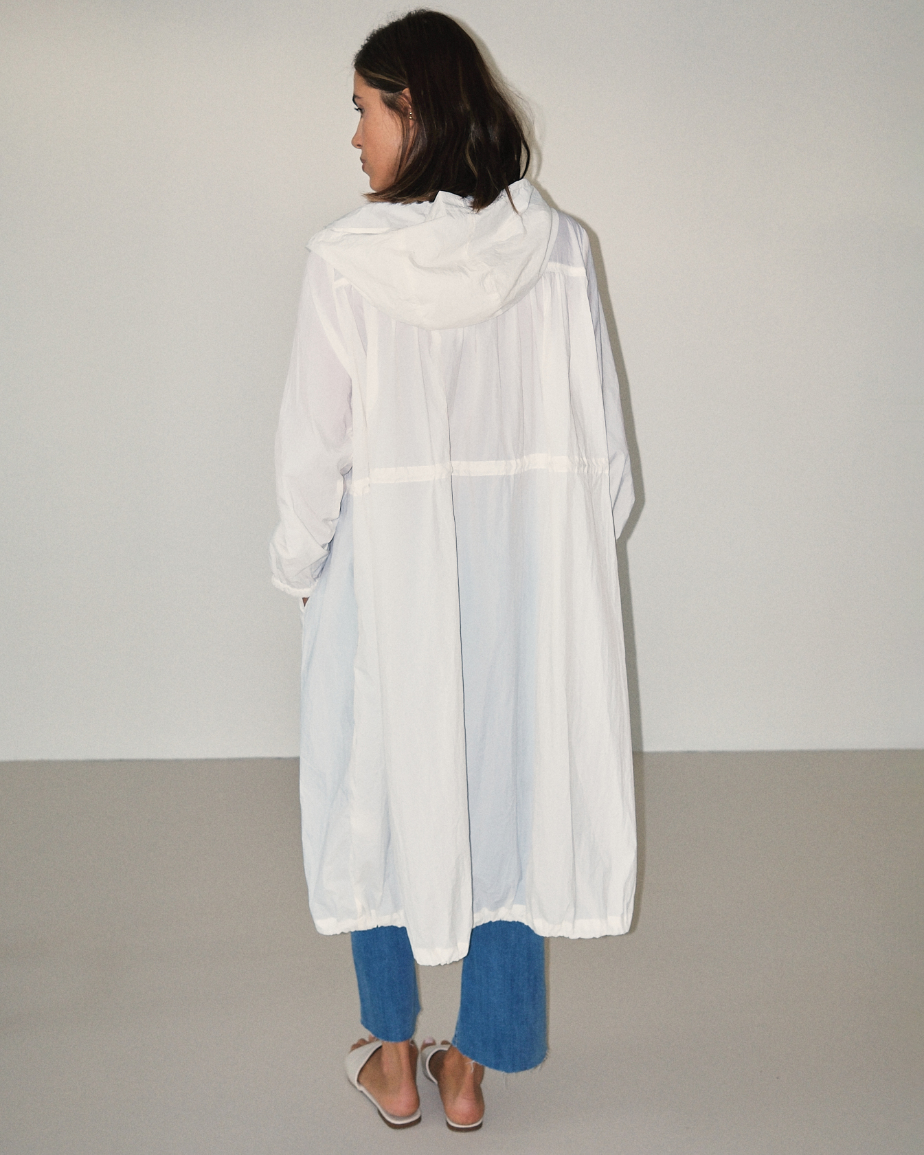 Impermeabile oversize con zip, cappuccio, coulisse e tasche.