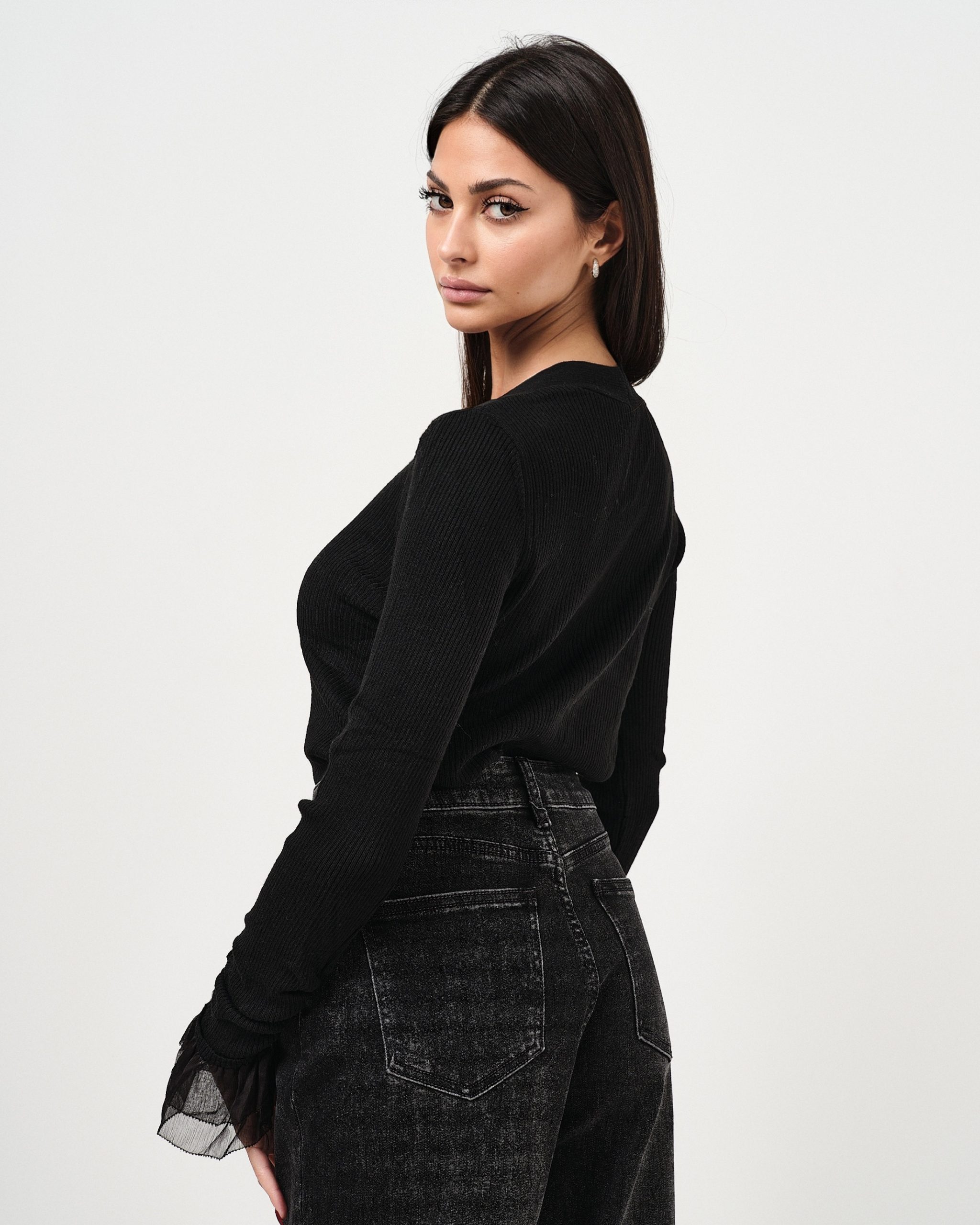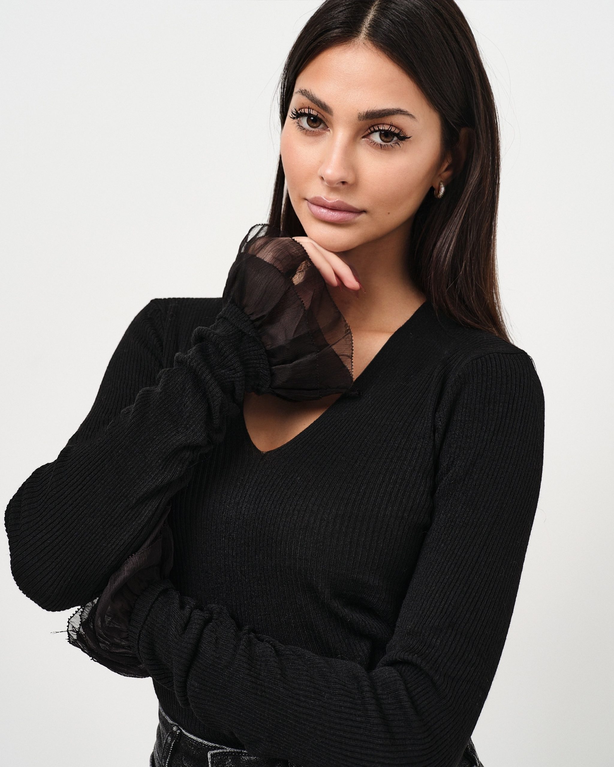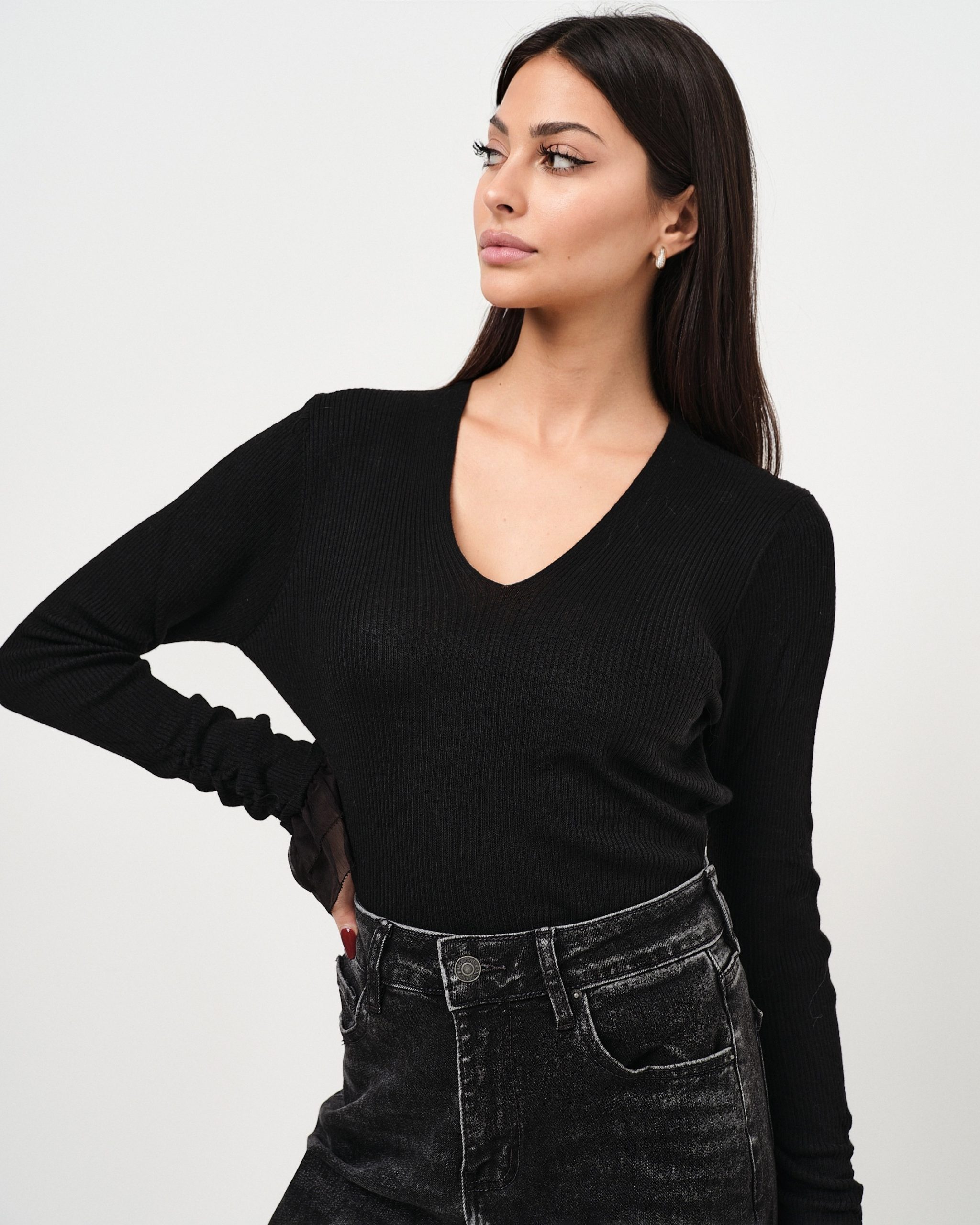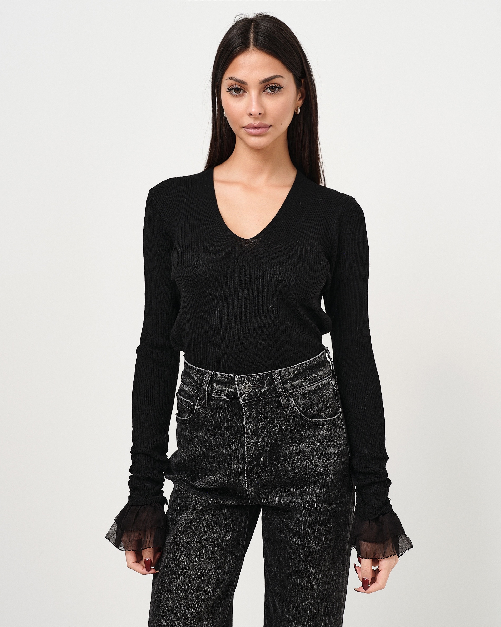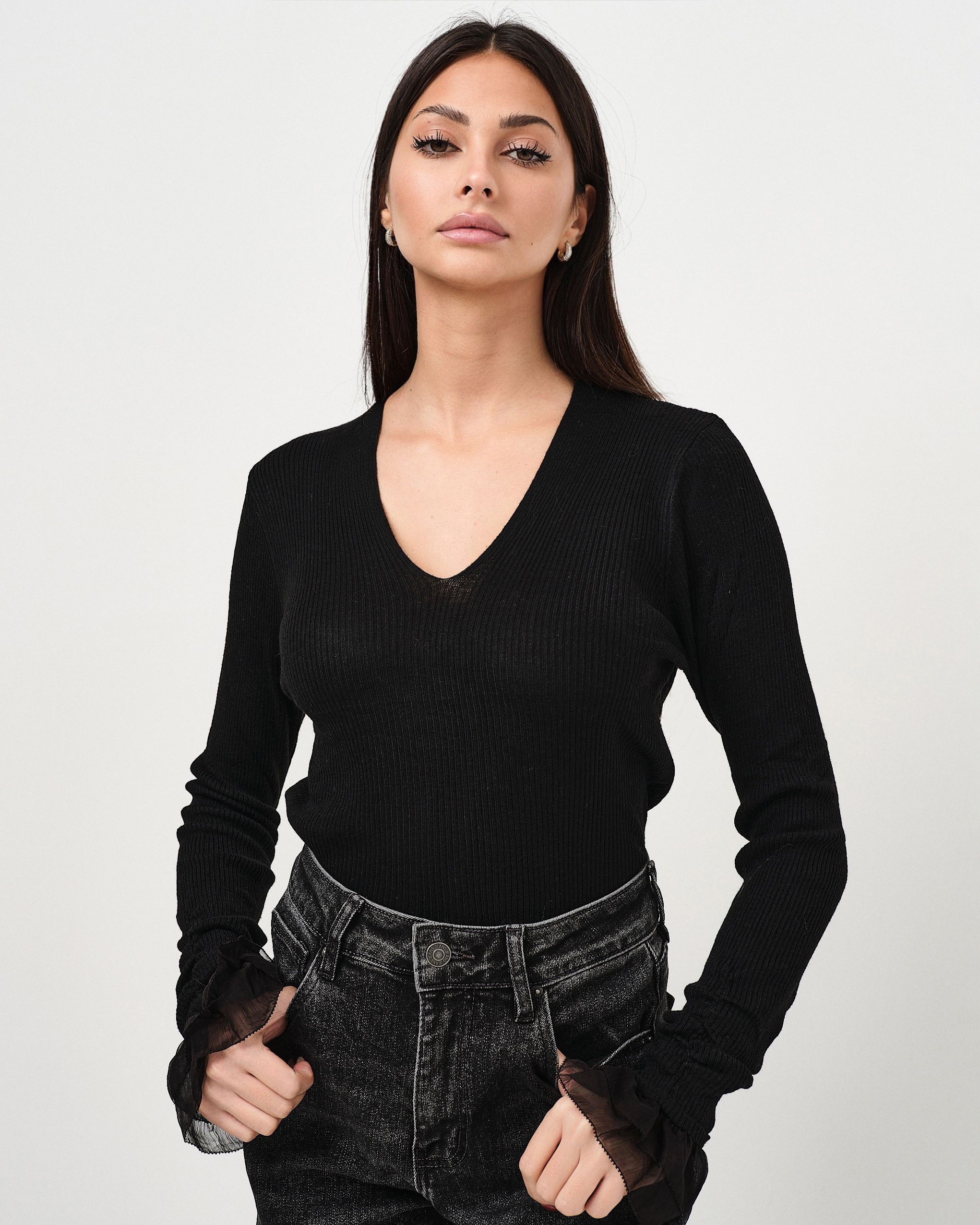 Maglia elasticizzata a manica lunga a costine con scollo a V e volant sul fondo.